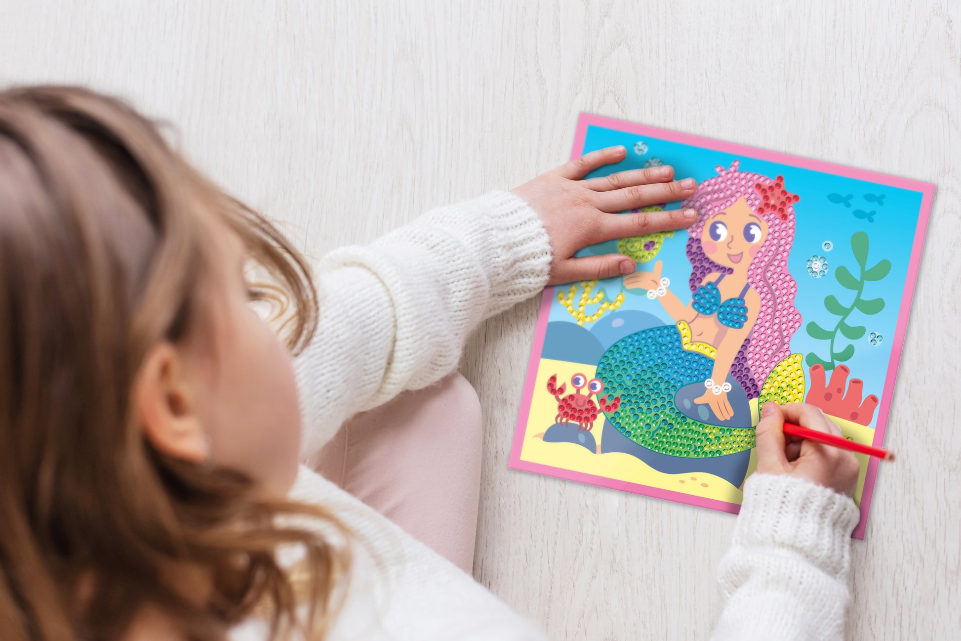 Self-adhesive picture, gems, pencil, pencil sharpener, plastic tray and instructions.