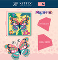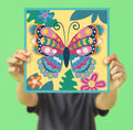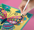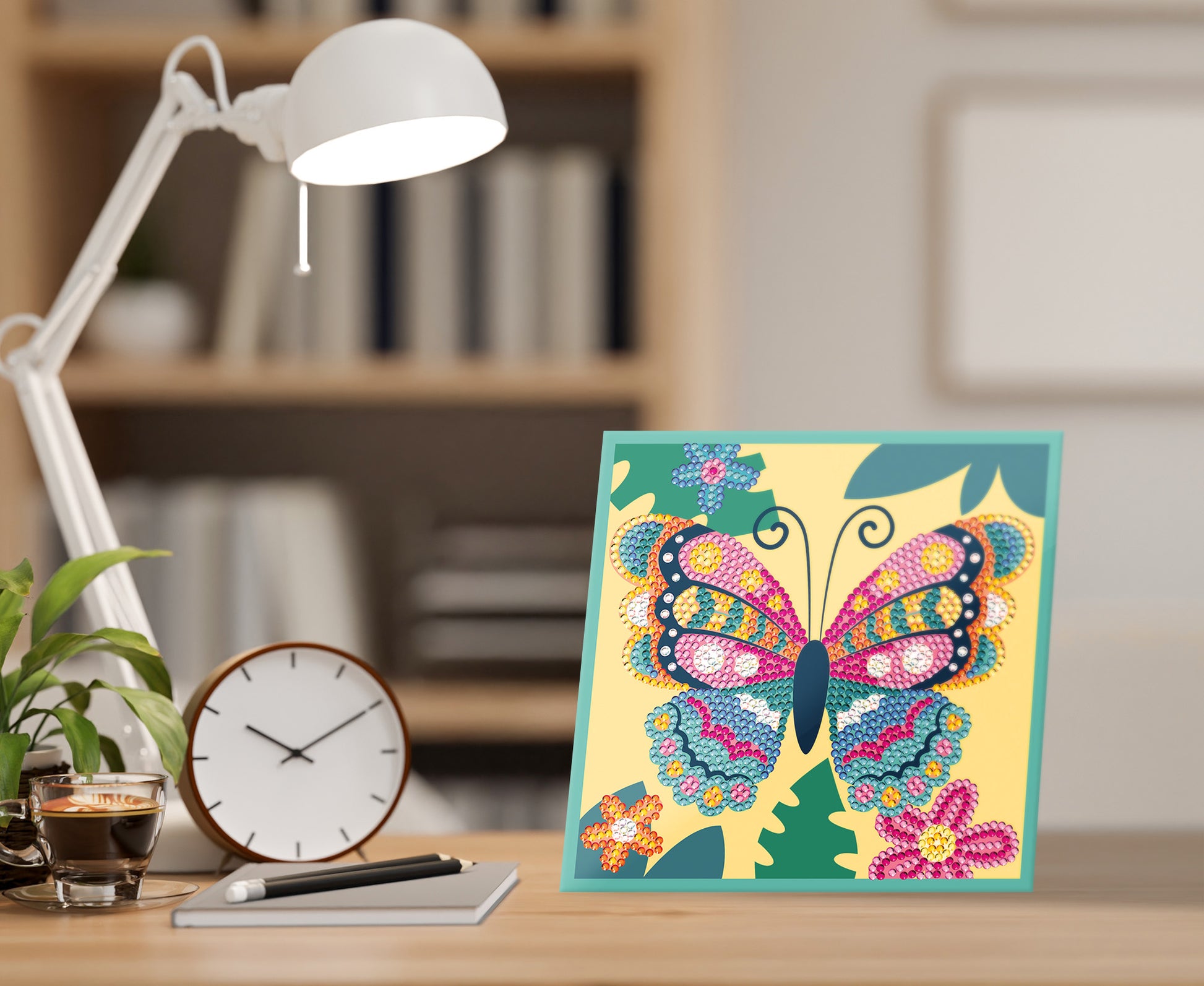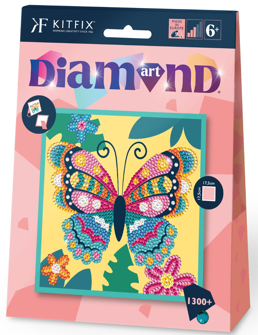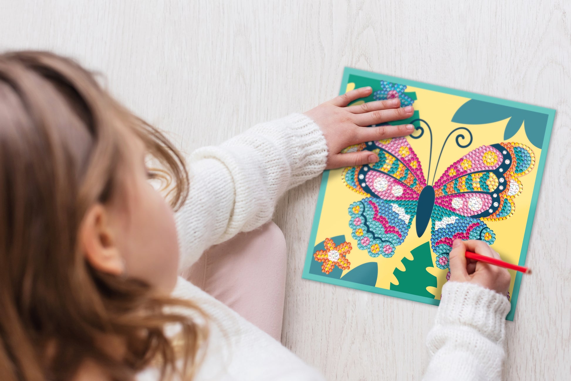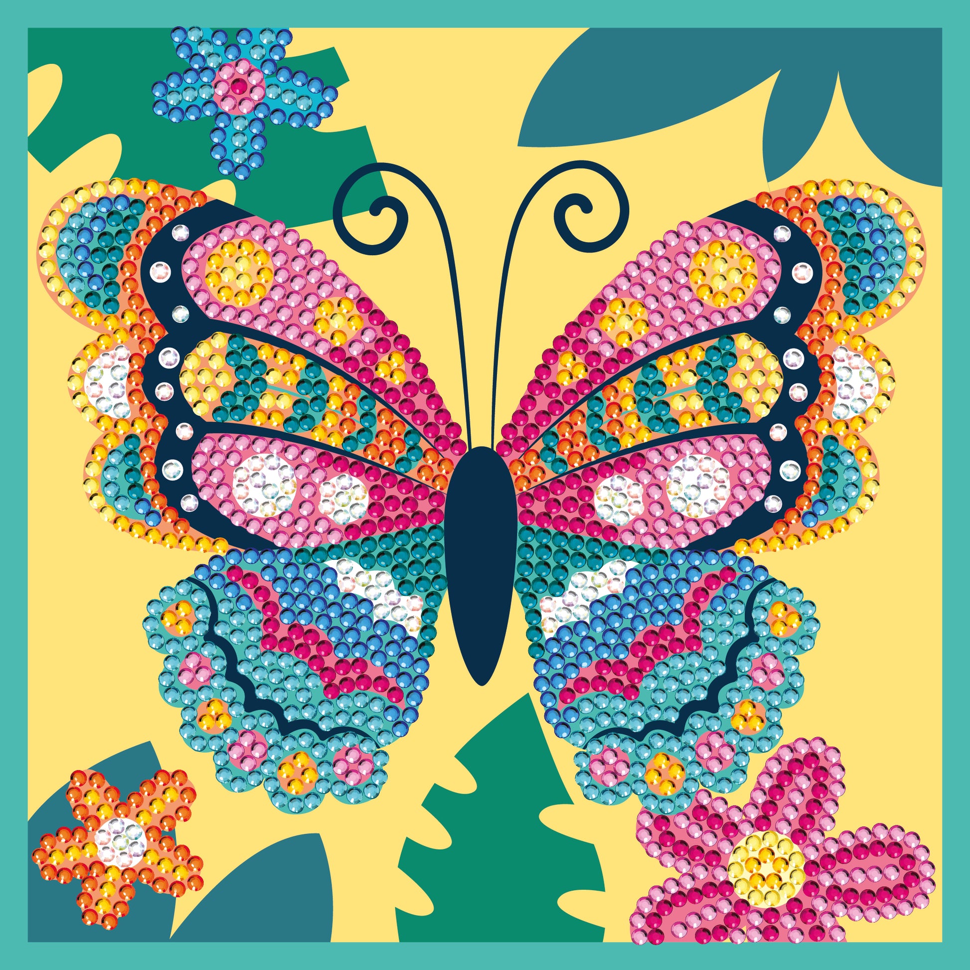Self-adhesive picture, gems, pencil, pencil sharpener, plastic tray and instructions.