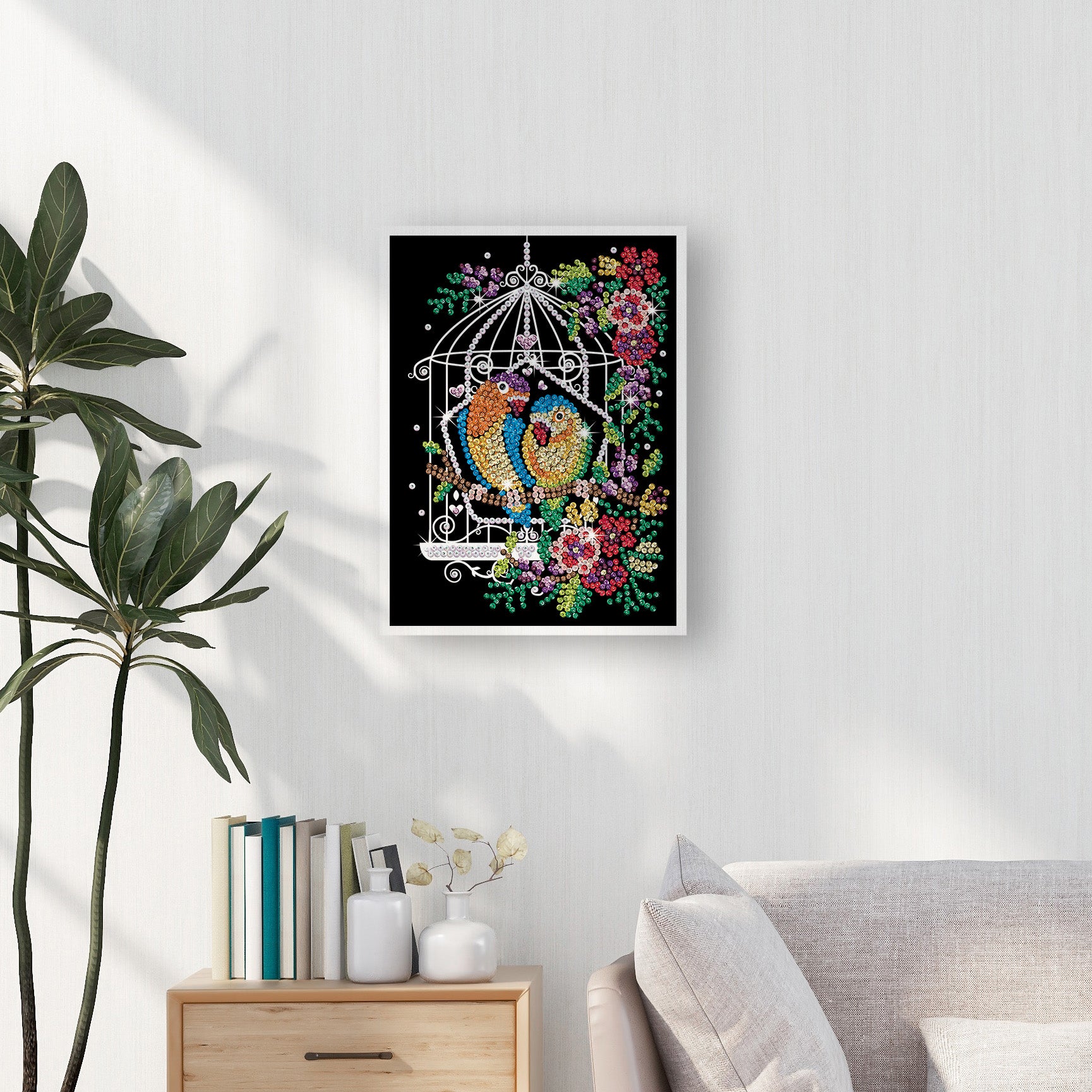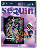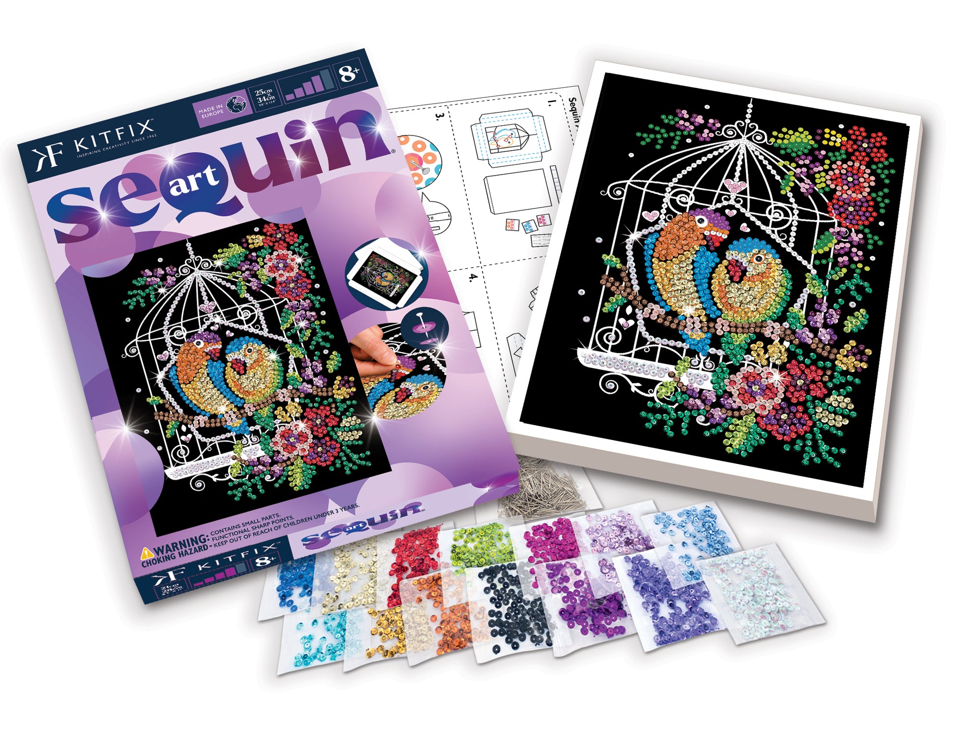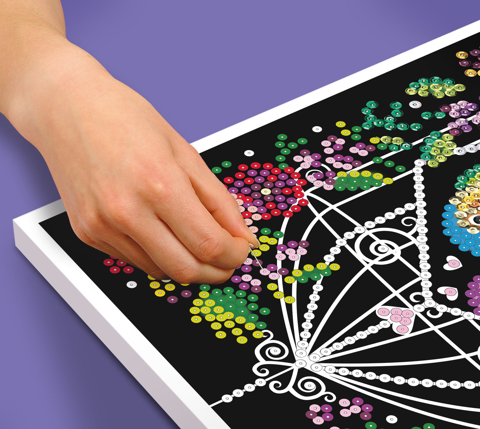 Cardboard tile, coloured wrap around picture, coloured sequins, pins, thimble, instructions, adhesive tabs