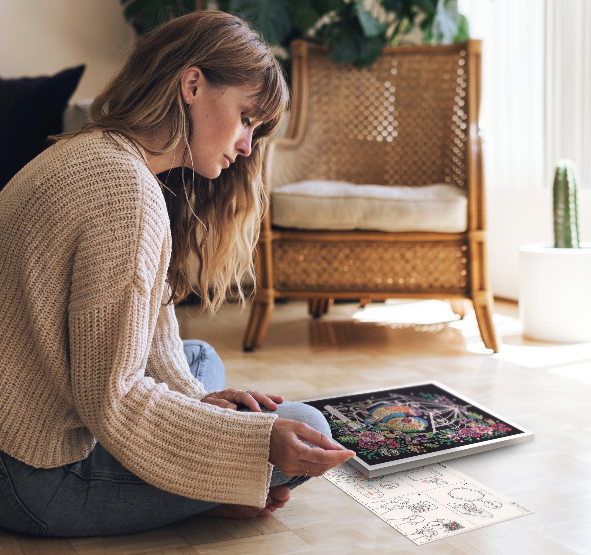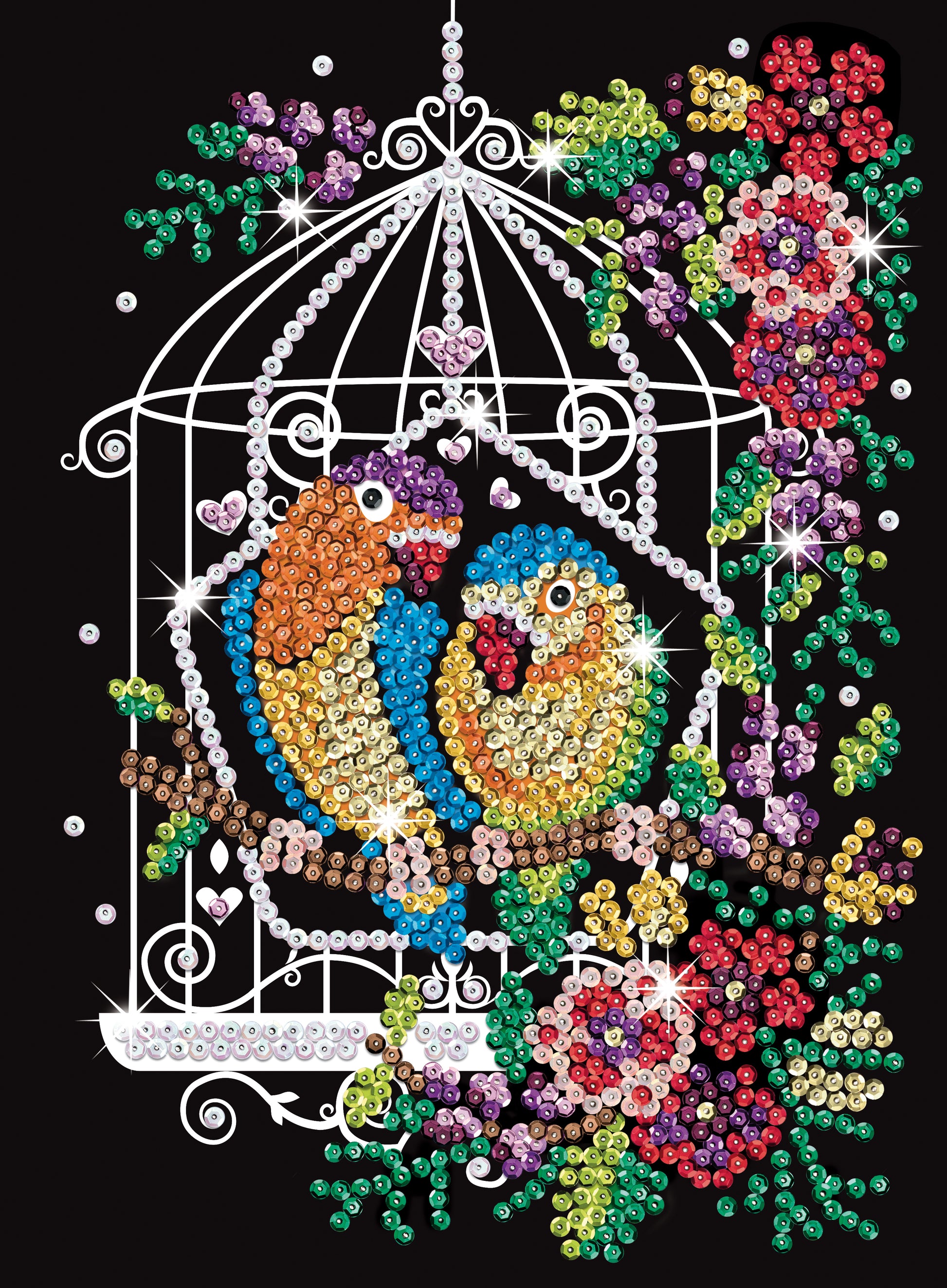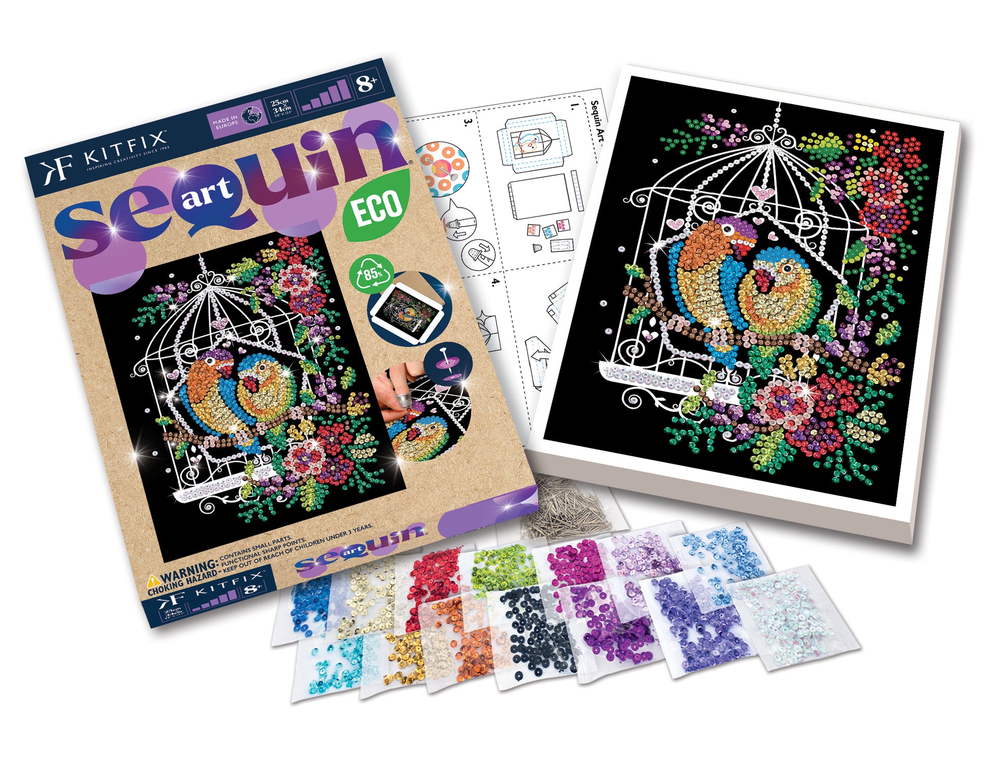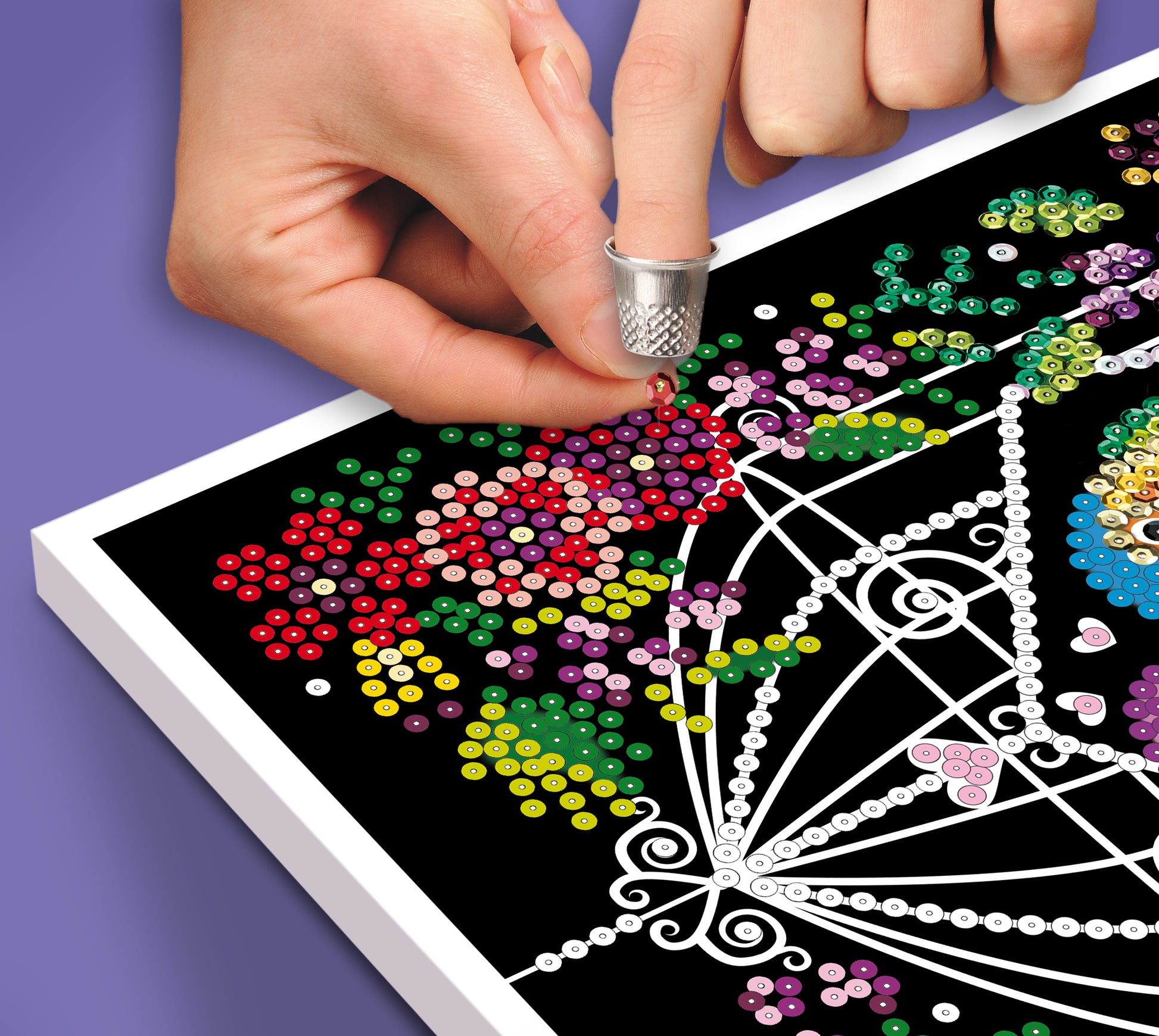 Cardboard tile, coloured wrap around picture, coloured sequins, pins, thimble, instructions, adhesive tabs