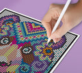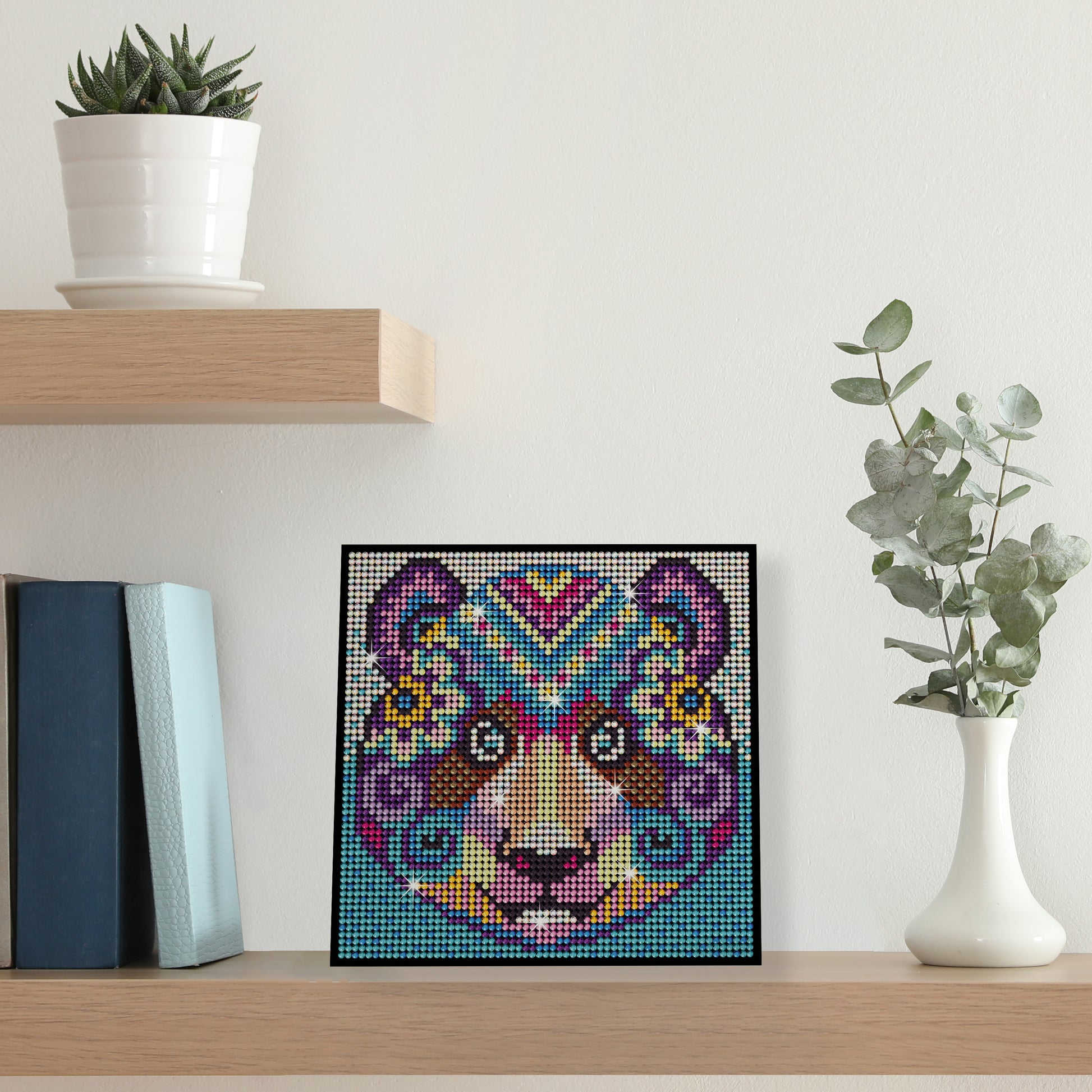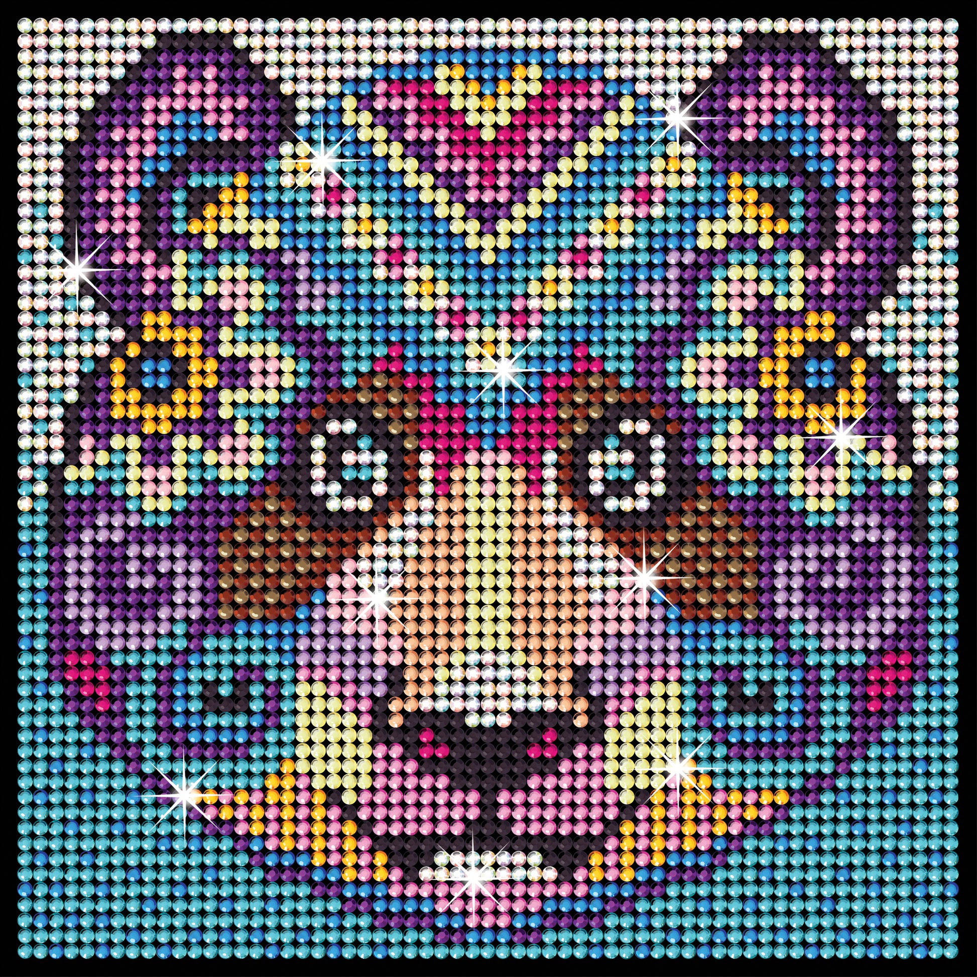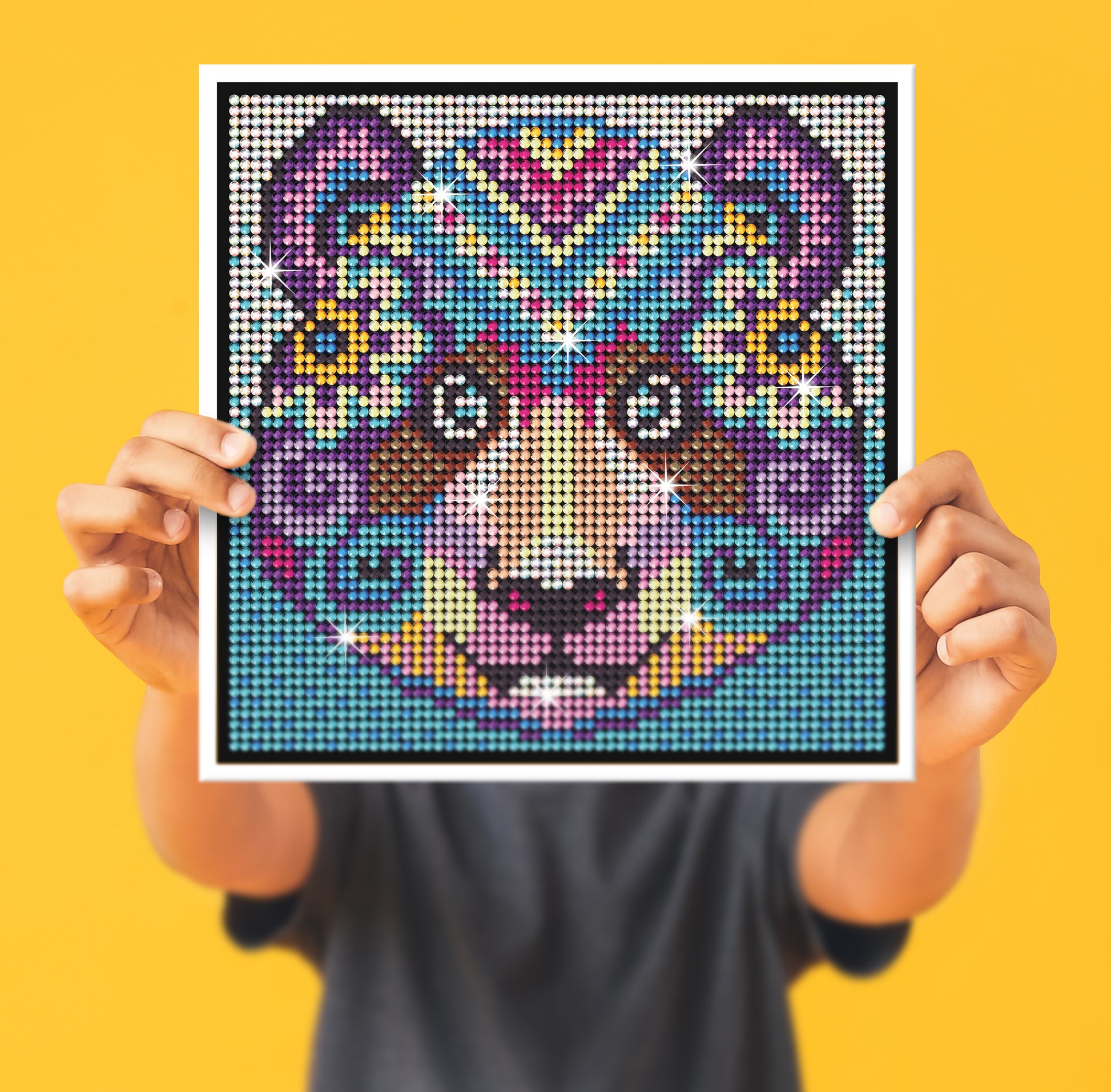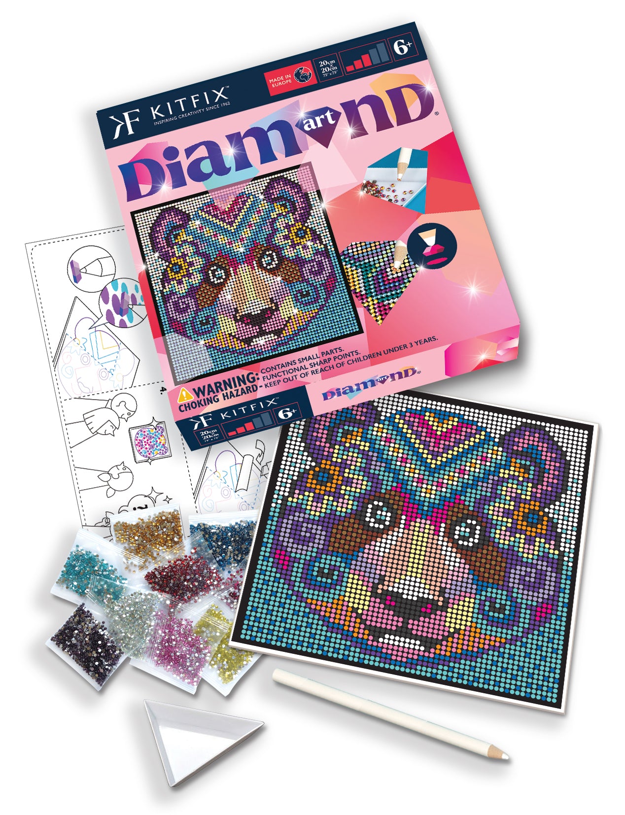 Self-adhesive picture, gems, pencil, pencil sharpener, plastic tray and instructions.