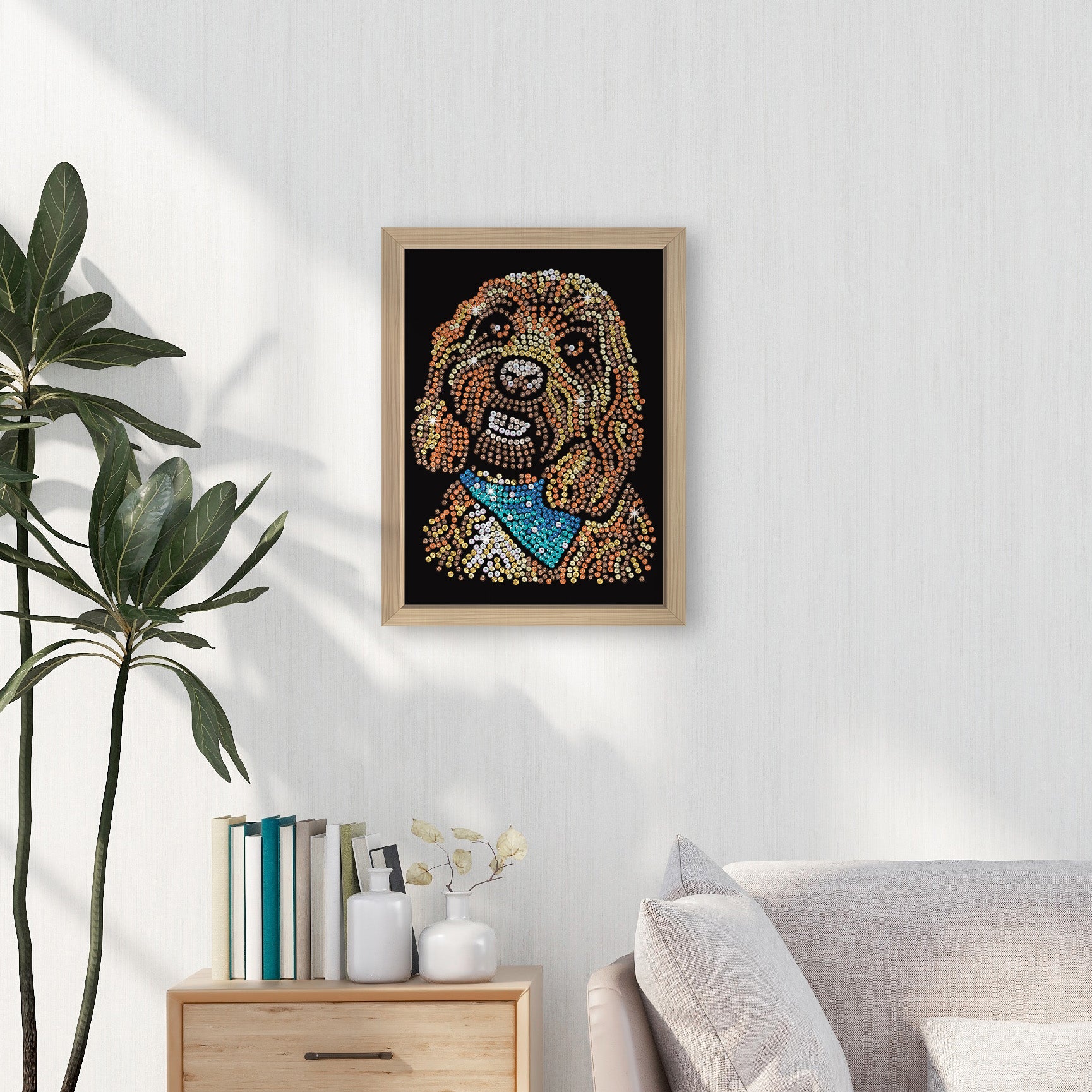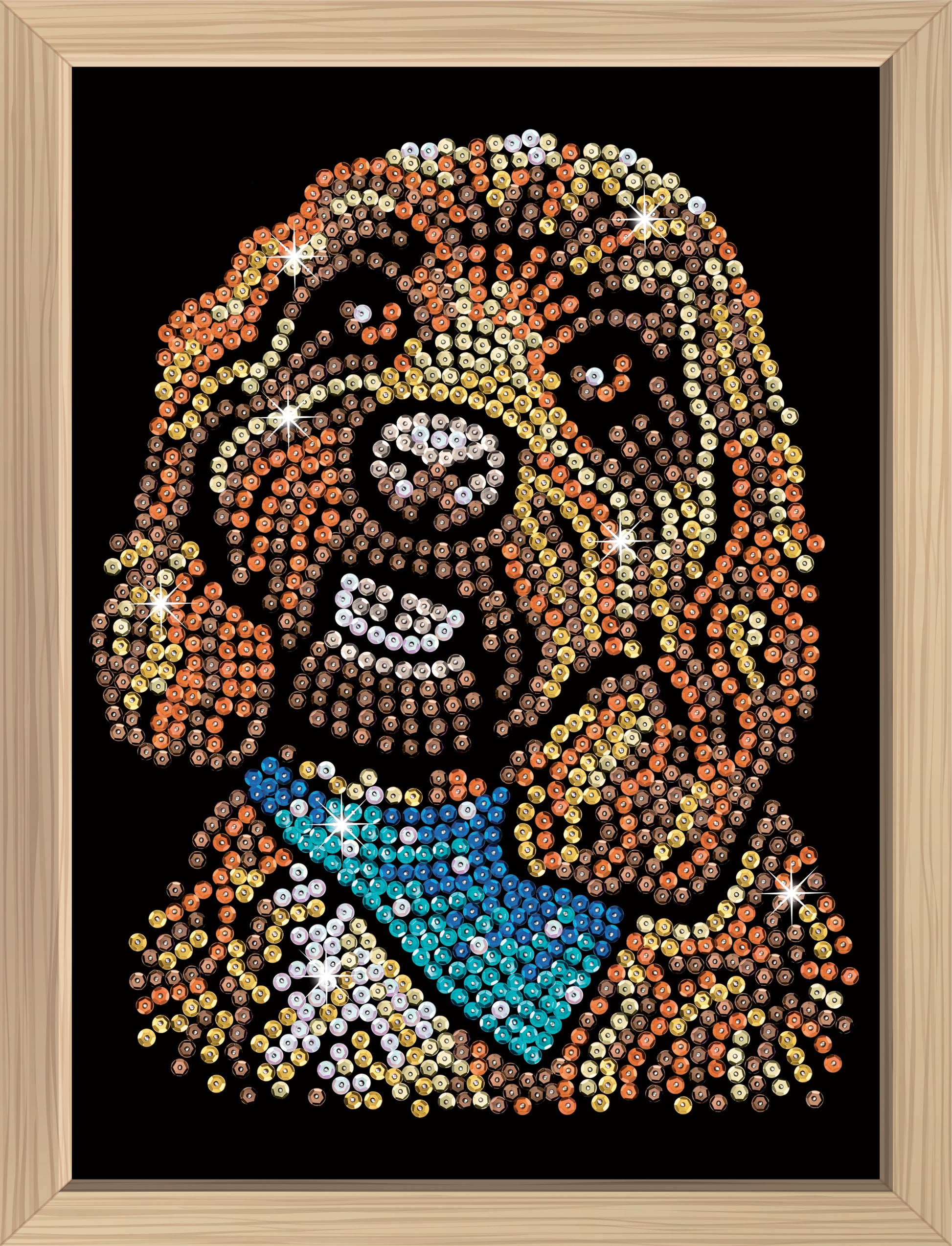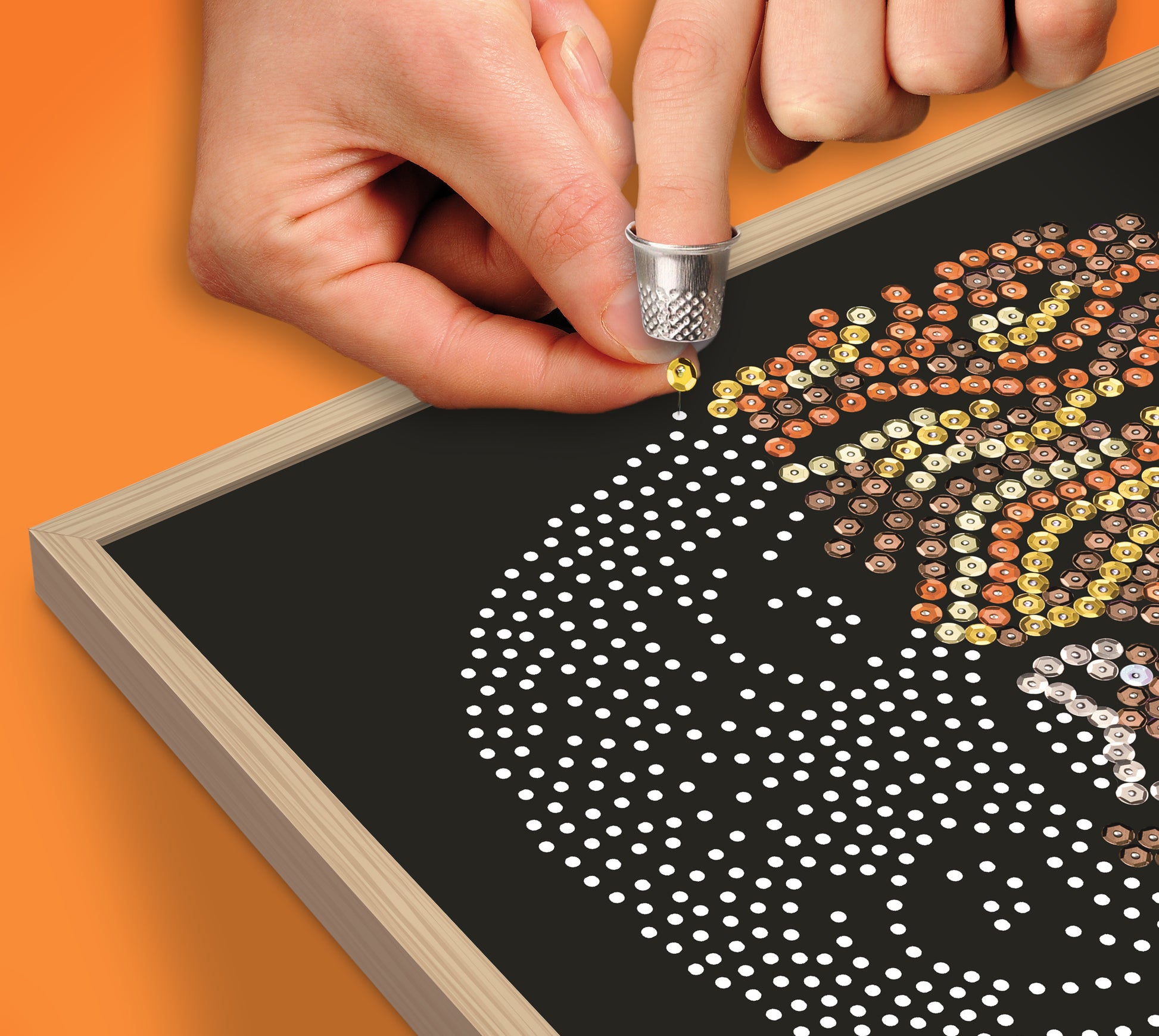 Cardboard tile, flocked picture, coloured sequins, pins, thimble, instructions and wooden frame, adhesive tabs.