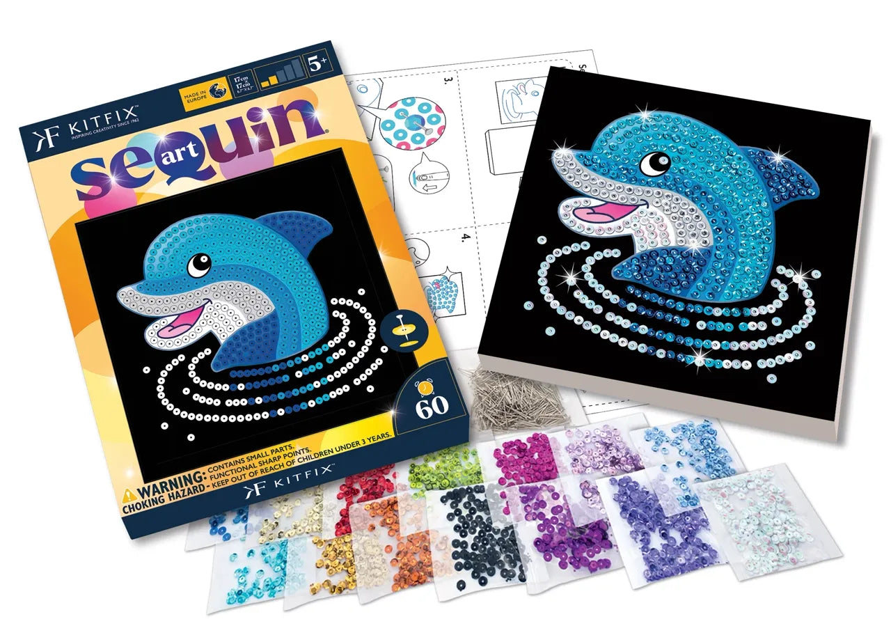 Polystyrene base, coloured picture, coloured sequins, pins, instructions