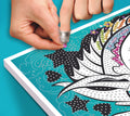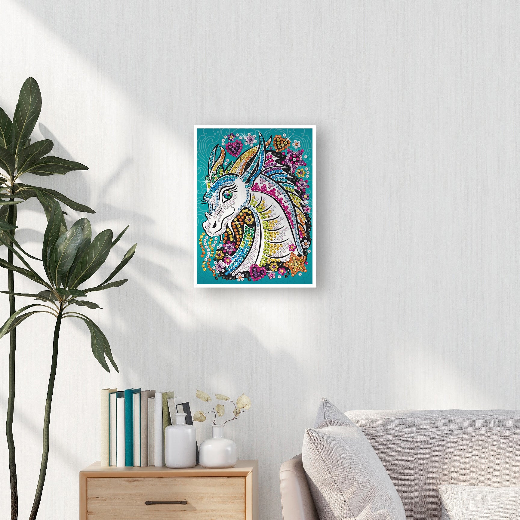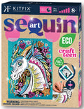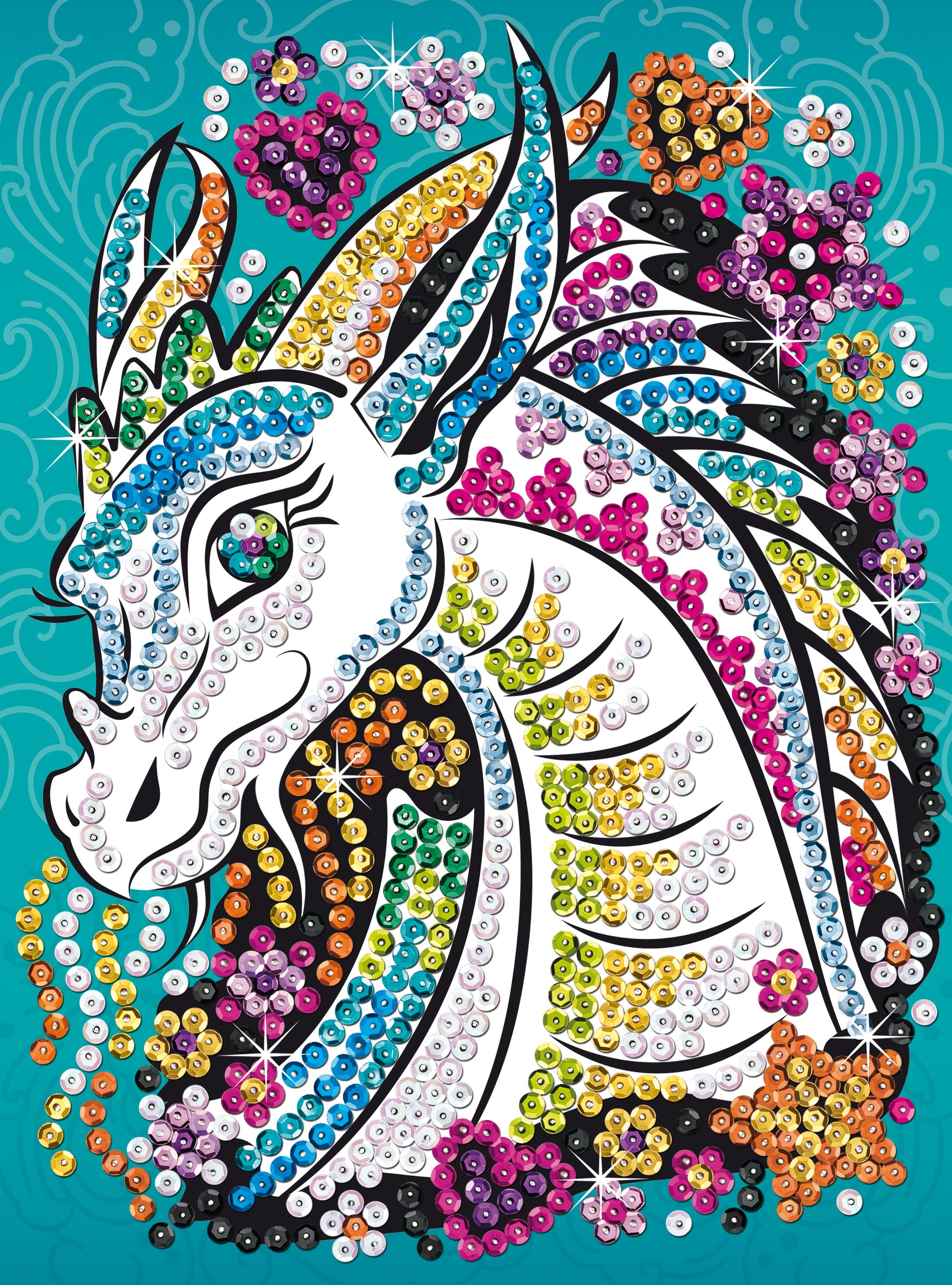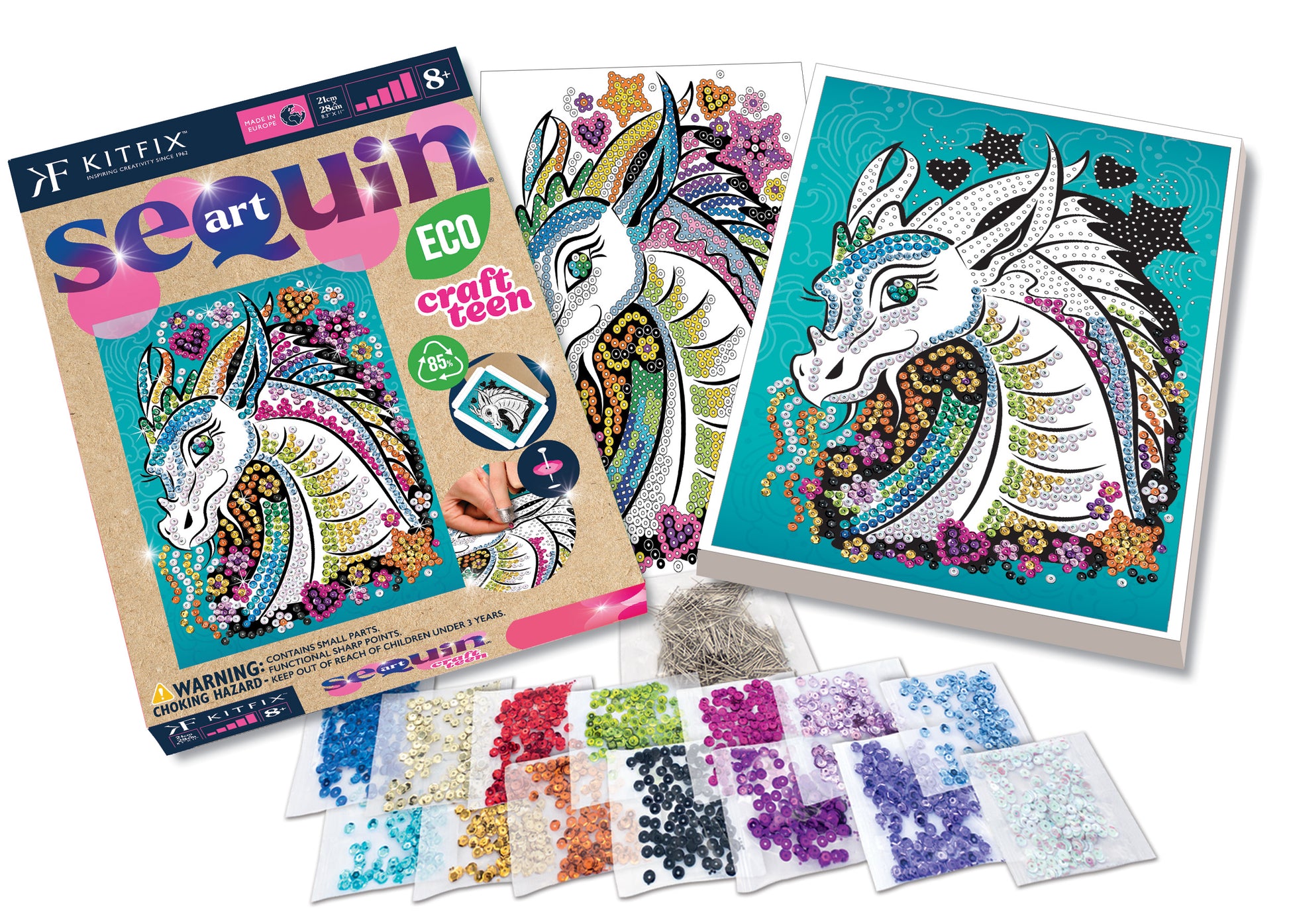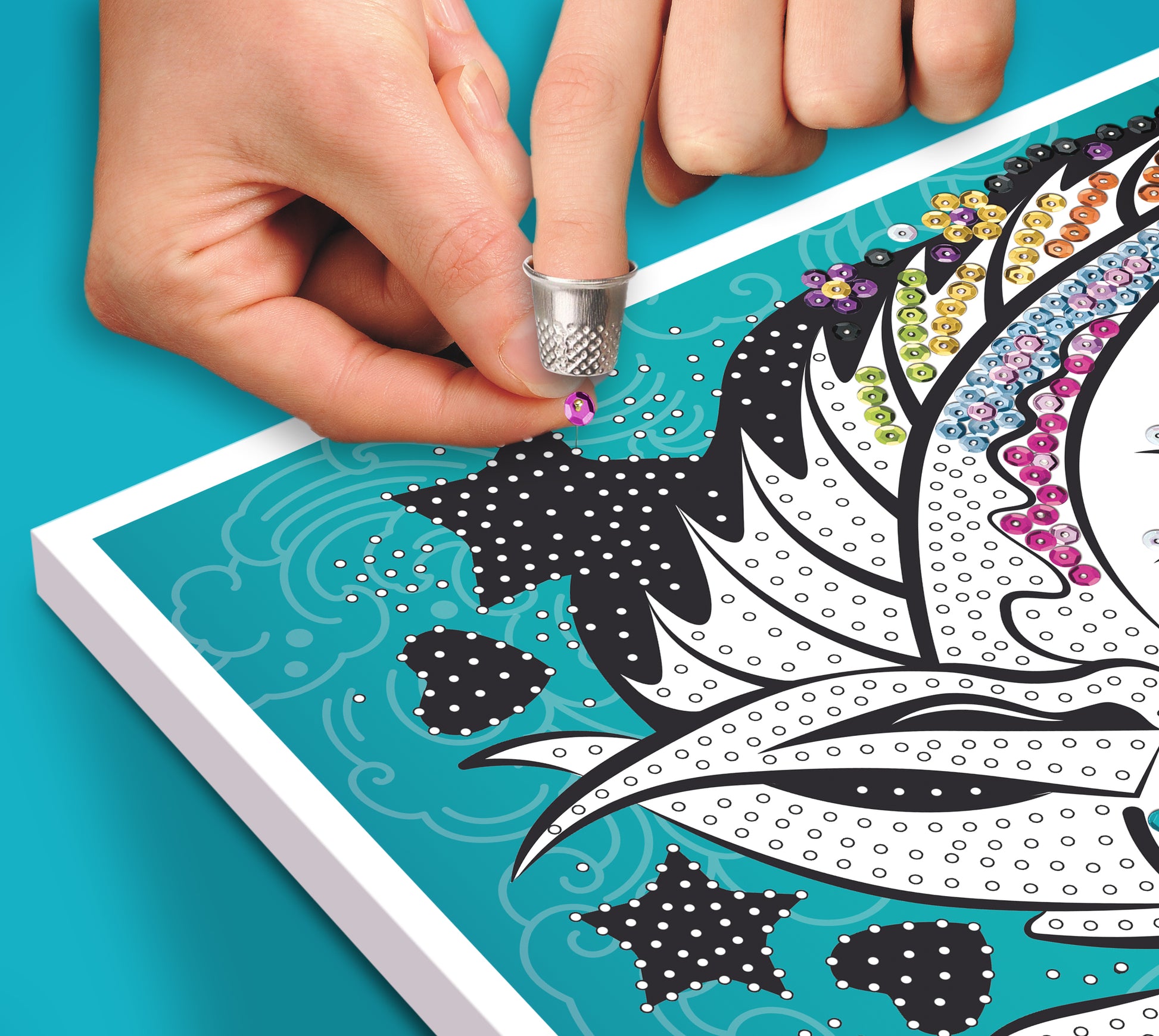 Cardboard tile, coloured wrap around picture, coloured sequins, pins, thimble, instructions, adhesive tabs