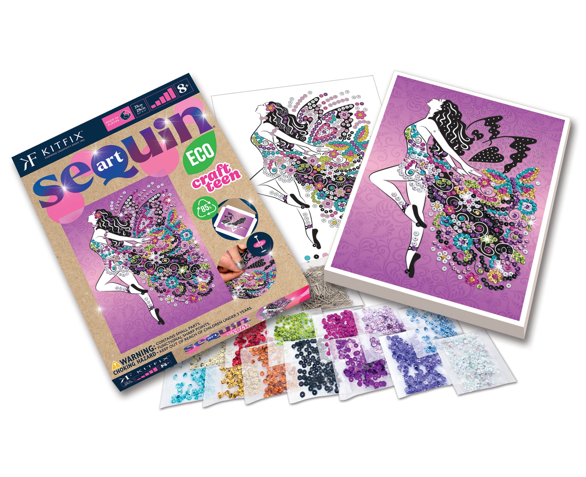 Cardboard tile, coloured wrap around picture, coloured sequins, pins, thimble, instructions, adhesive tabs