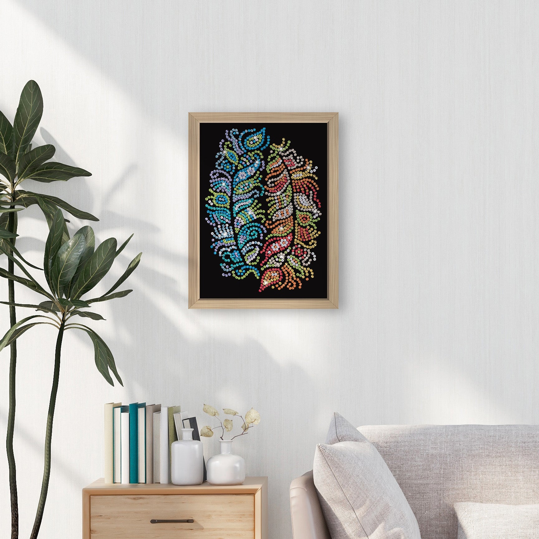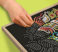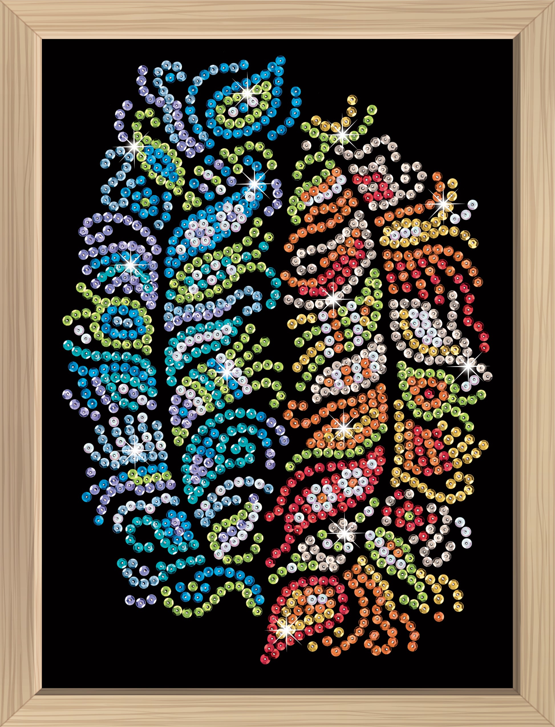 Polystyrene base, flocked picture, coloured sequins, pins, instructions, wooden frame, colour instruction leaflet, adhesive tabs