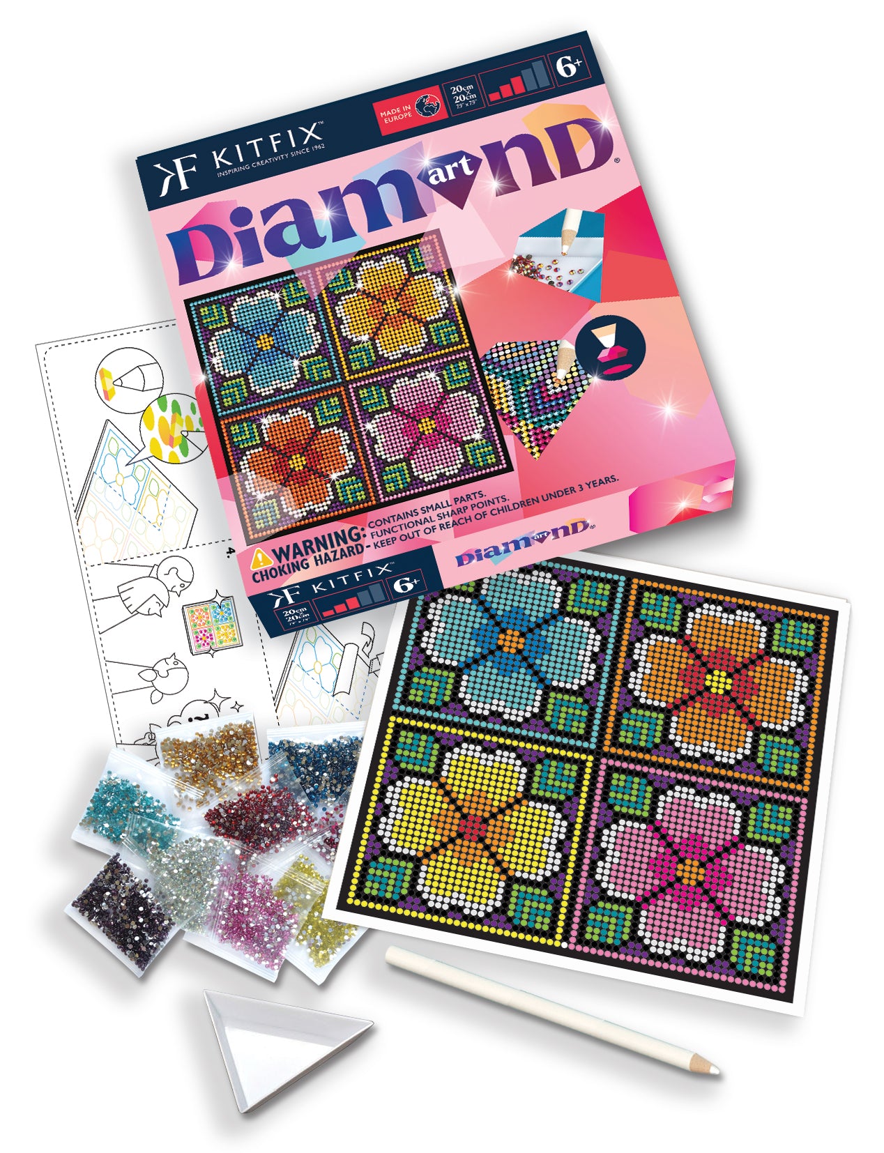 Self-adhesive picture, gems, pencil, pencil sharpener, plastic tray and instructions.