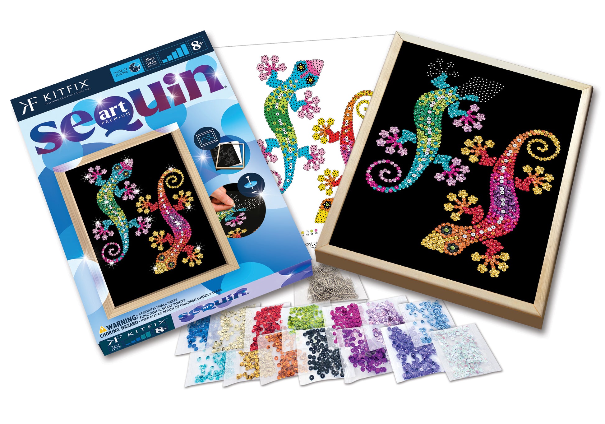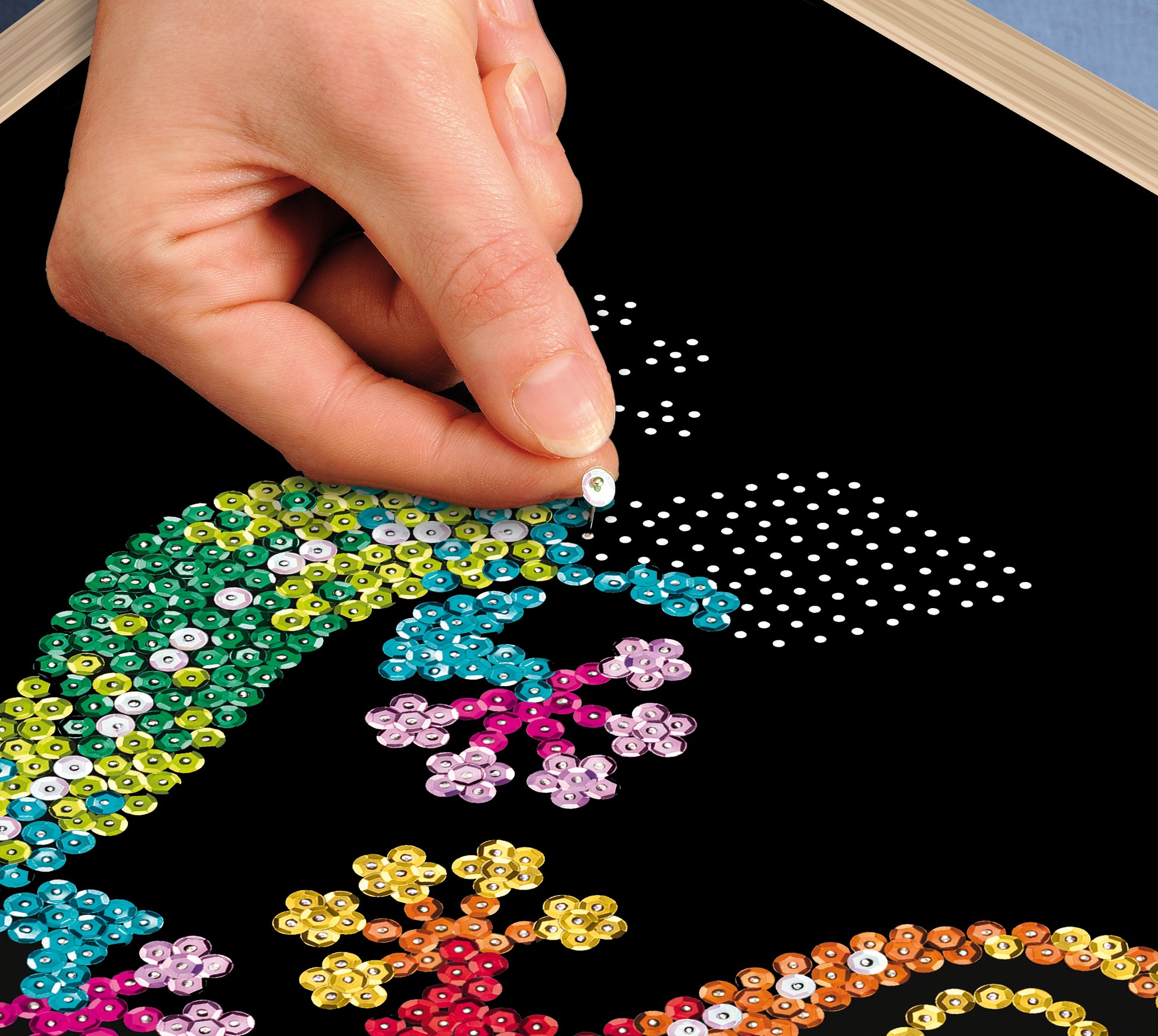 Polystyrene base, flocked picture, coloured sequins, pins, instructions, wooden frame, colour instruction leaflet, adhesive tabs