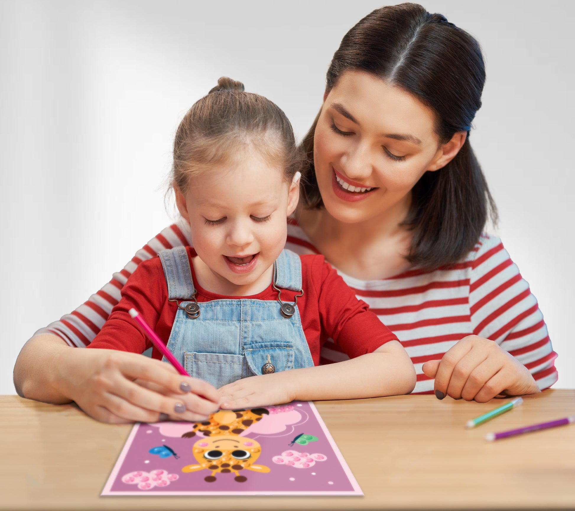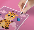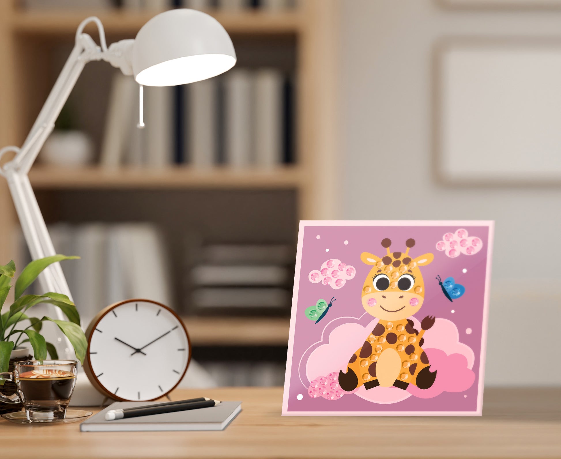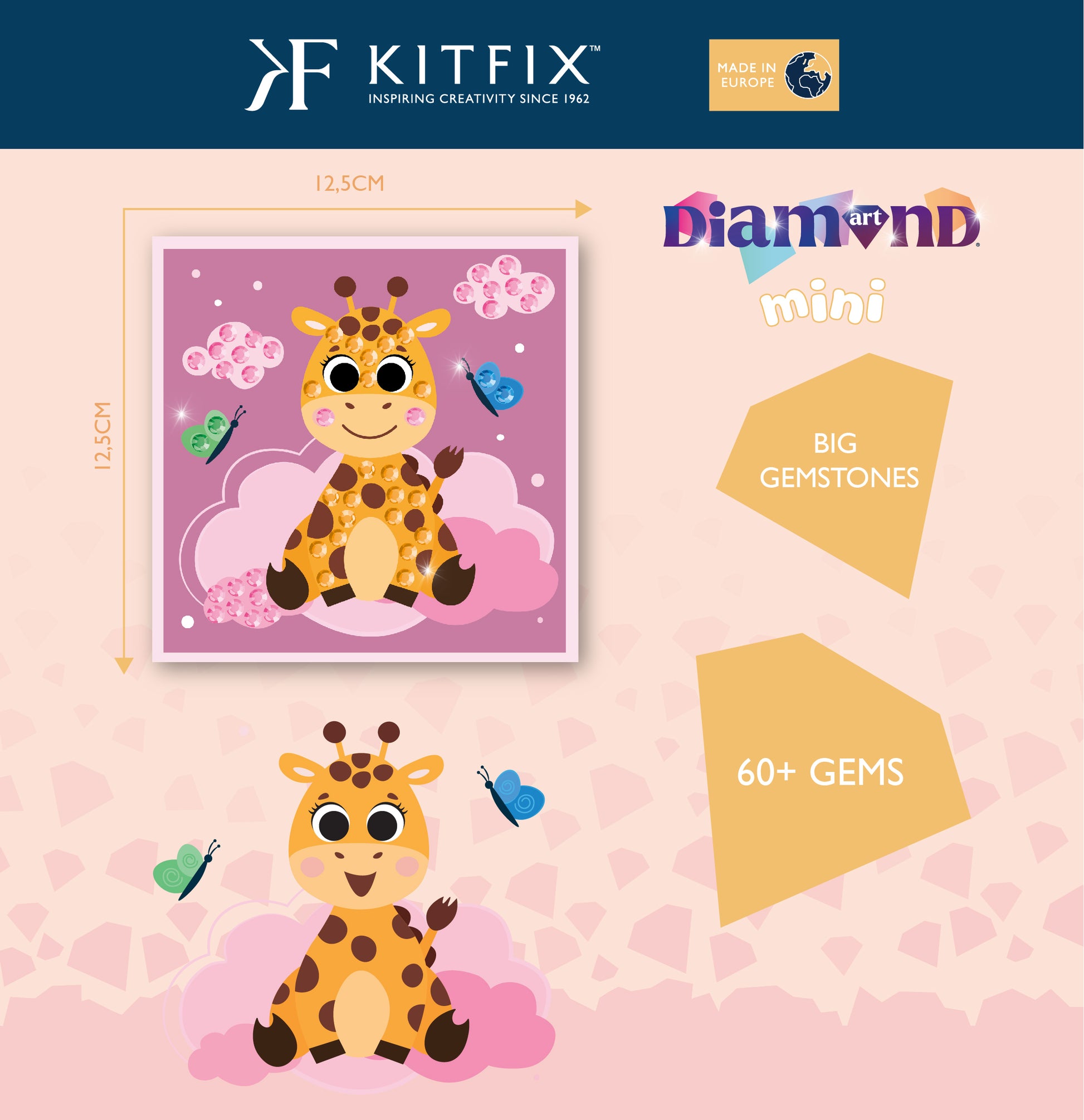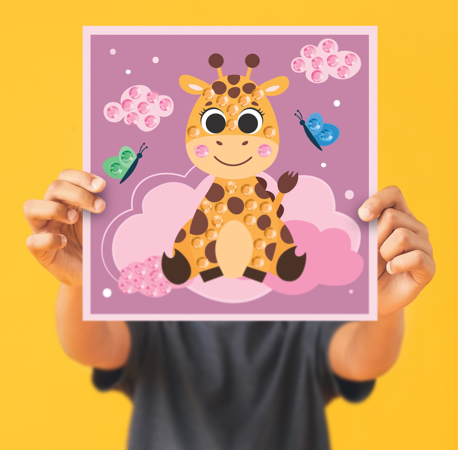 Self-adhesive picture, gems, pencil, pencil sharpener, plastic tray and instructions.