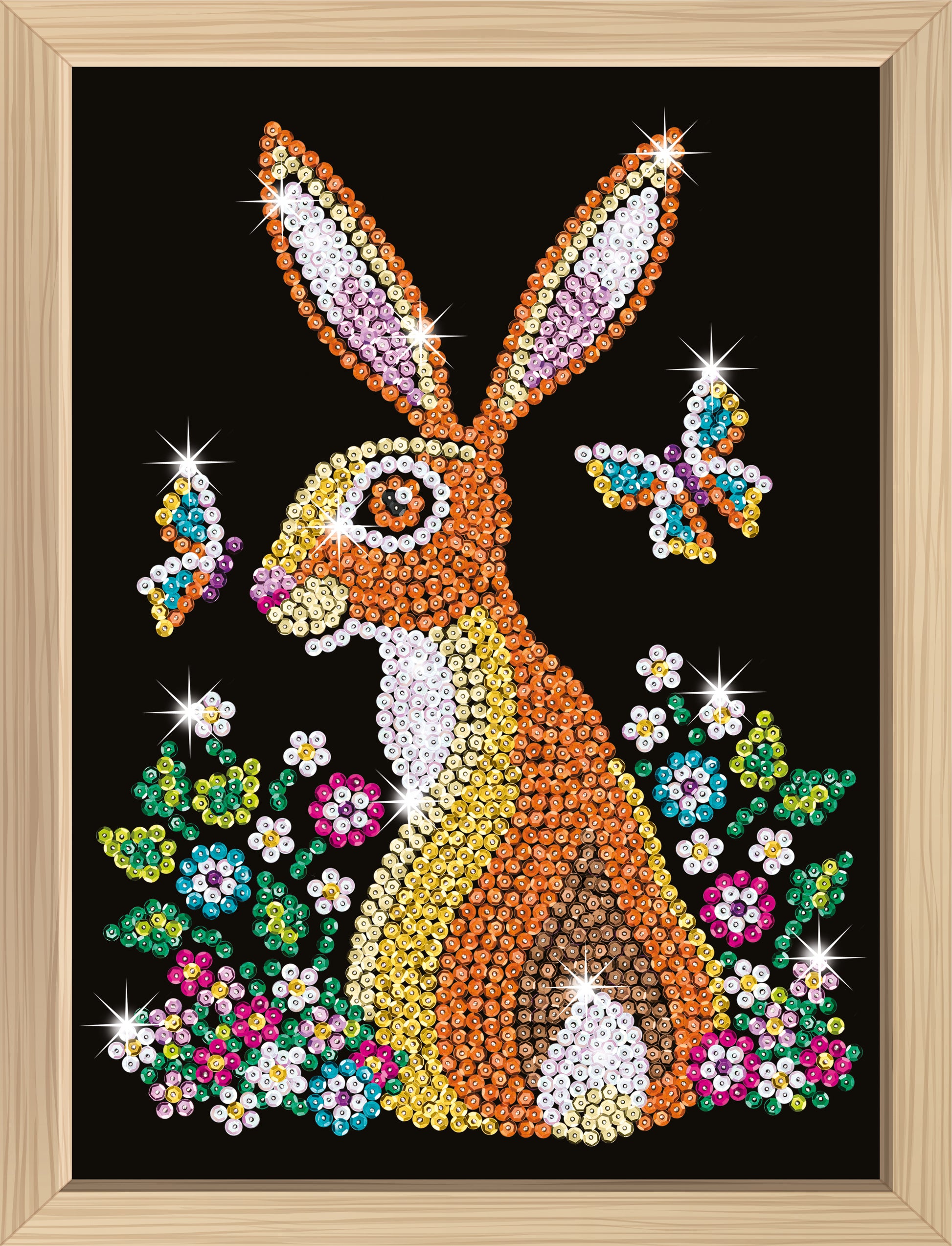 Polystyrene base, flocked picture, coloured sequins, pins, instructions, wooden frame, colour instruction leaflet, adhesive tabs