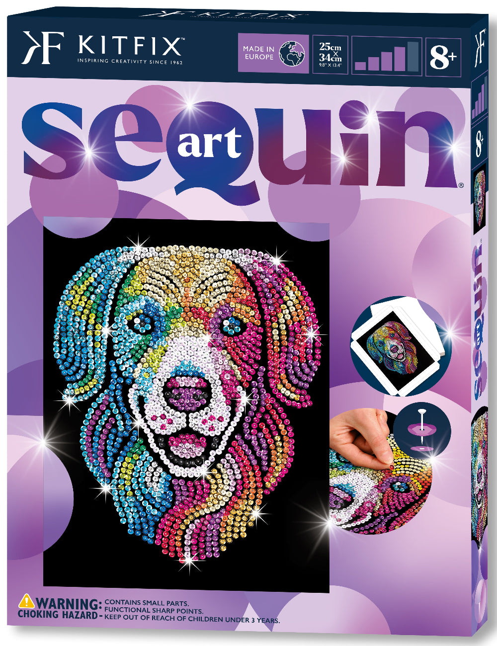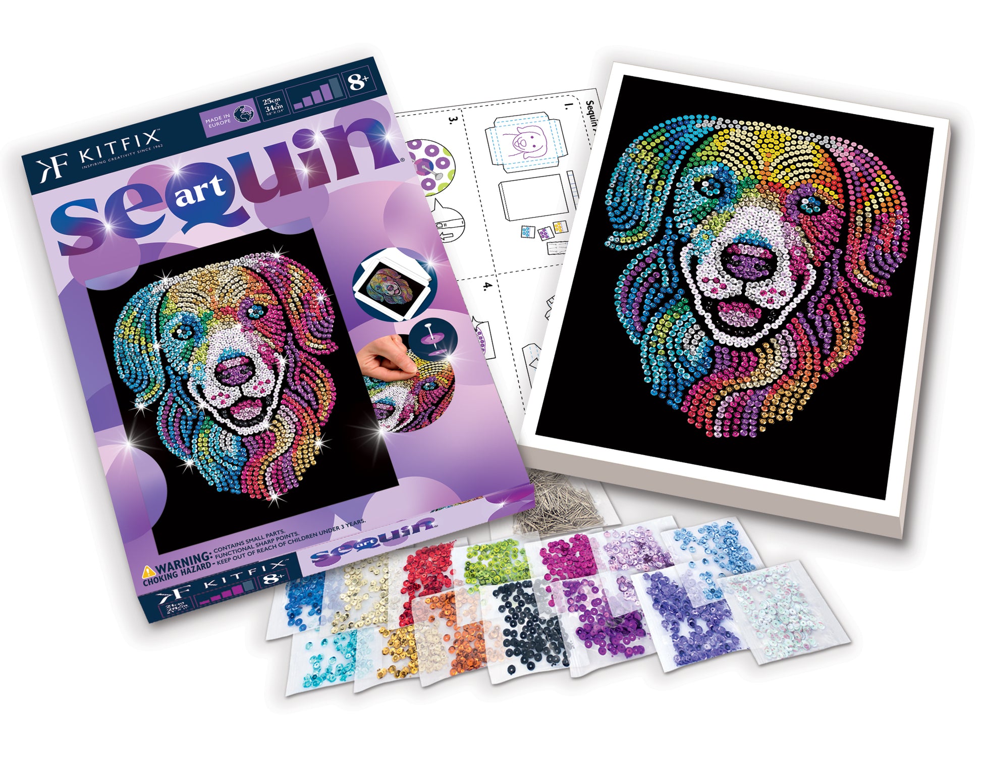 Polystyrene base, coloured wrap around picture, coloured sequins, pins, instructions, adhesive tabs