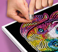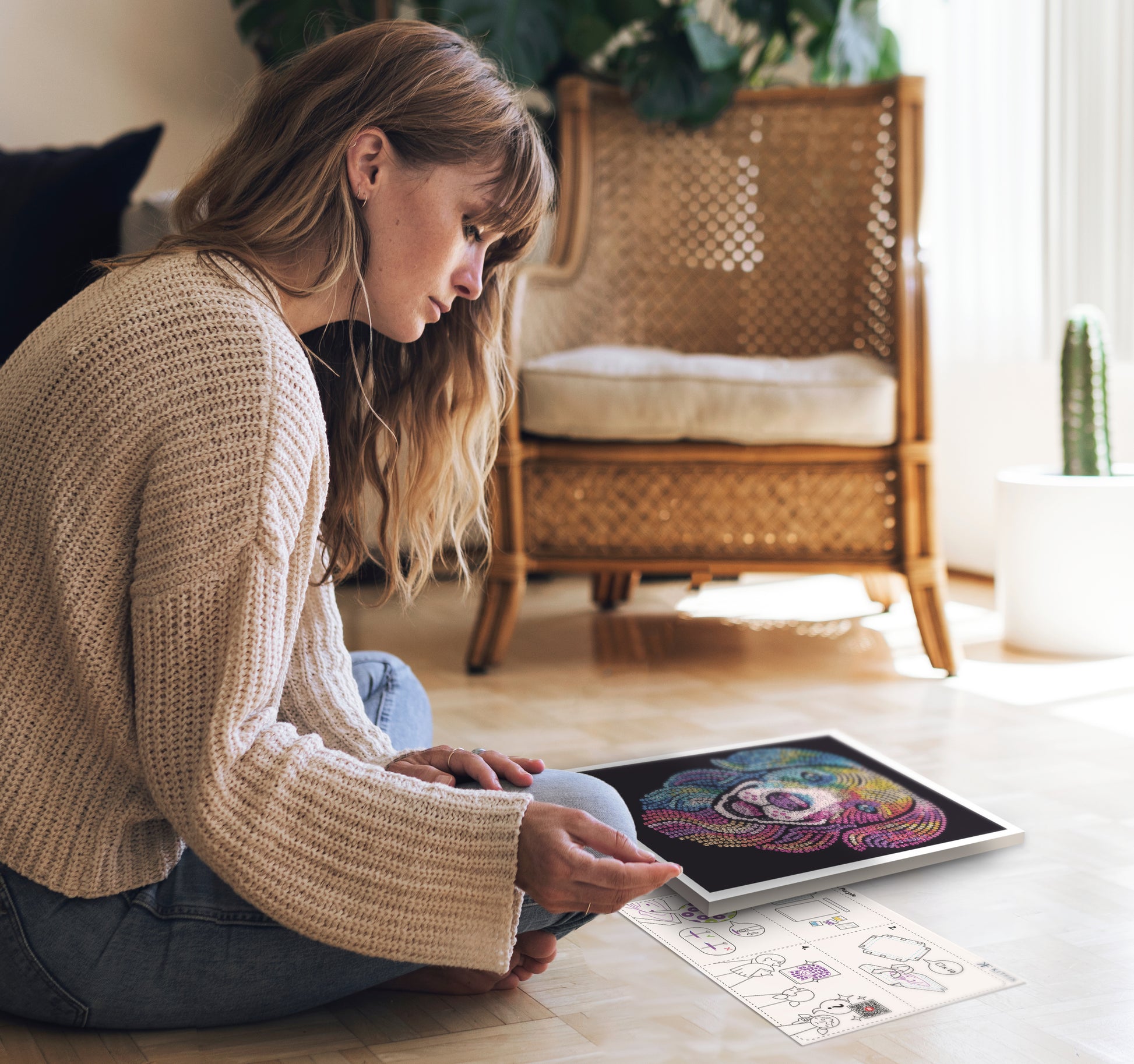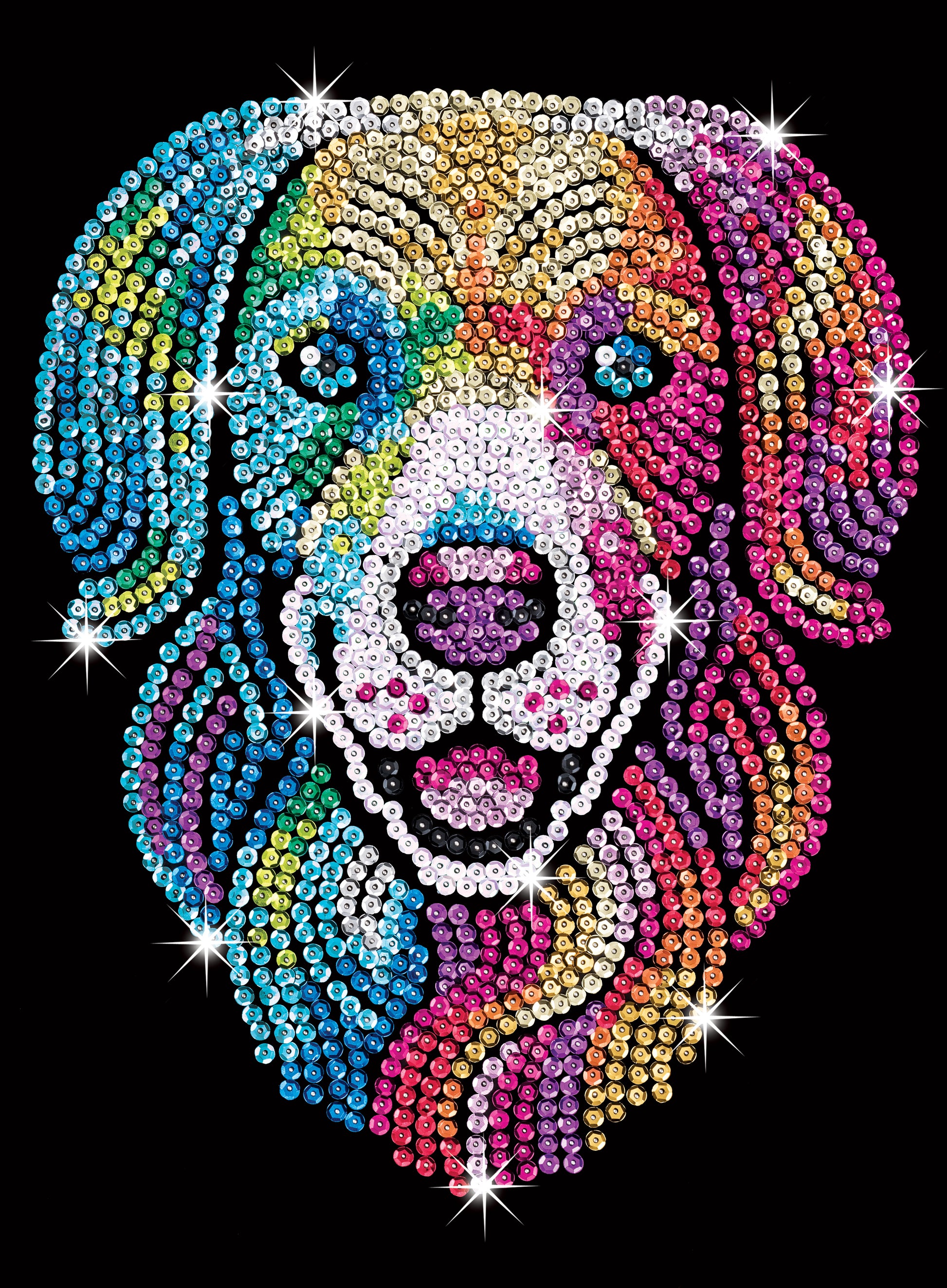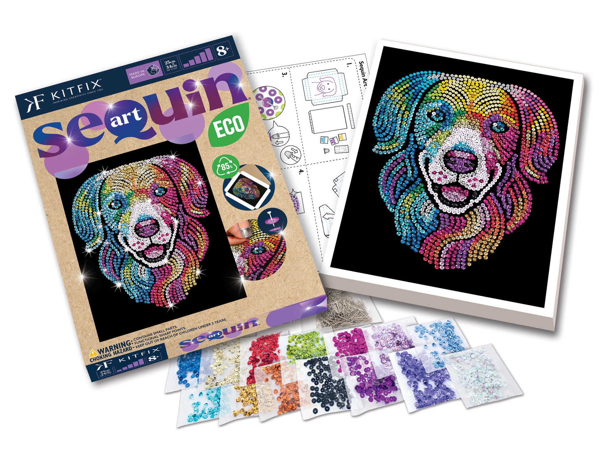 Cardboard tile, coloured wrap around picture, coloured sequins, pins, thimble, instructions, adhesive tabs