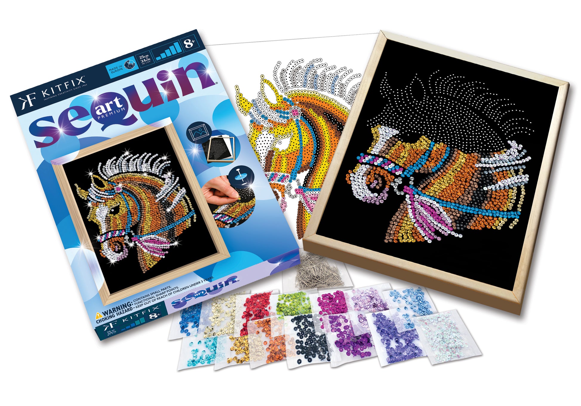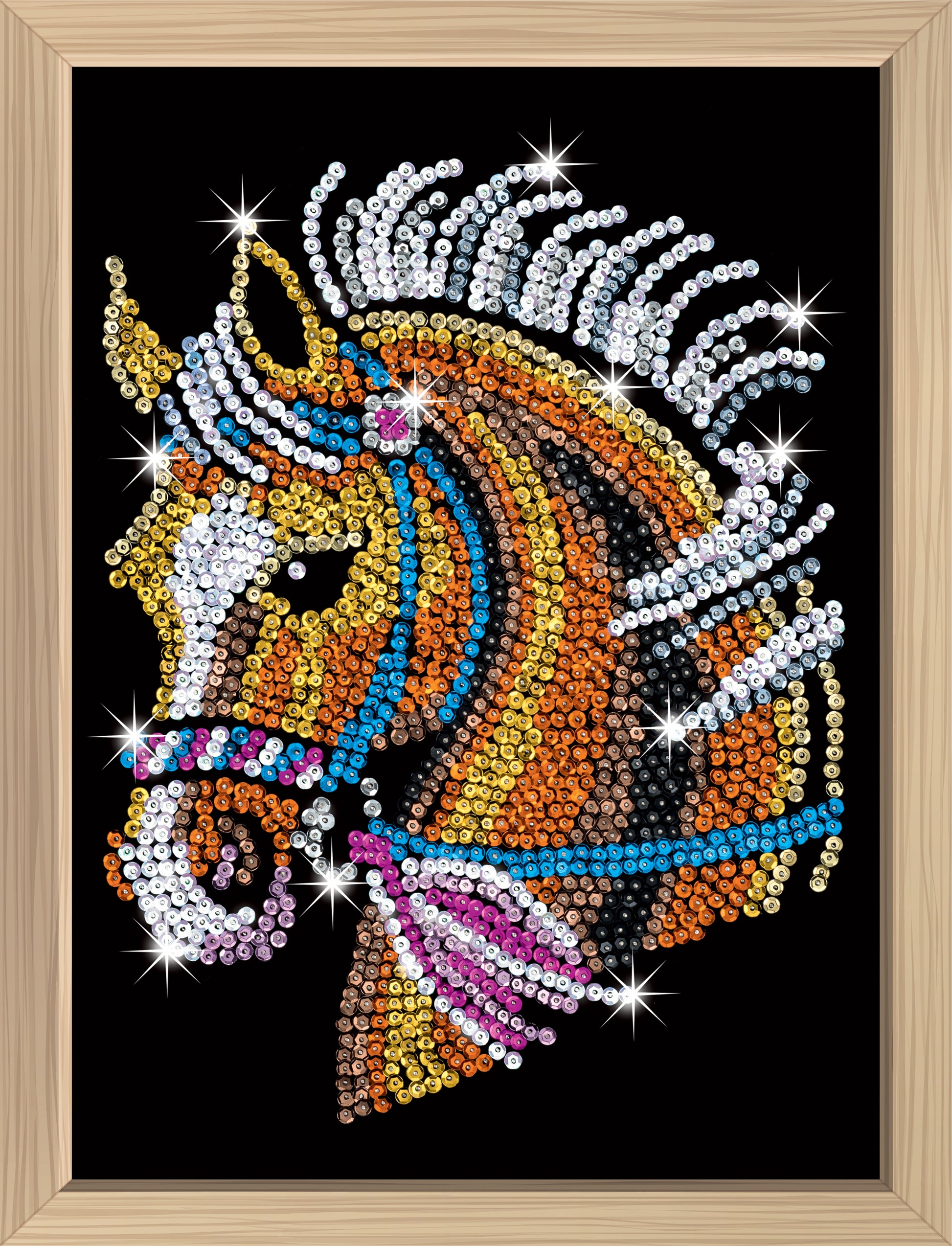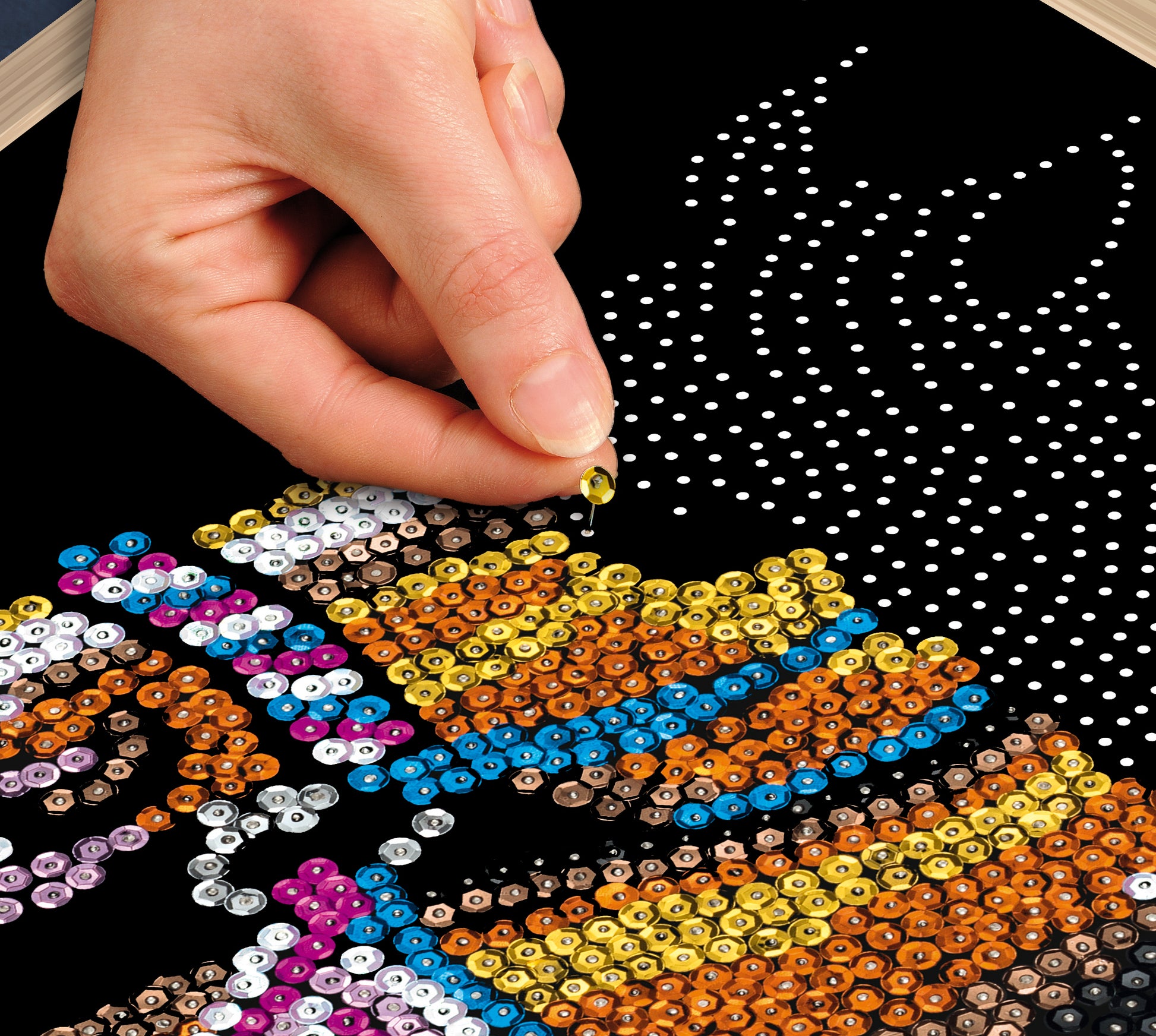 Polystyrene base, flocked picture, coloured sequins, pins, instructions, wooden frame, colour instruction leaflet, adhesive tabs