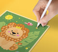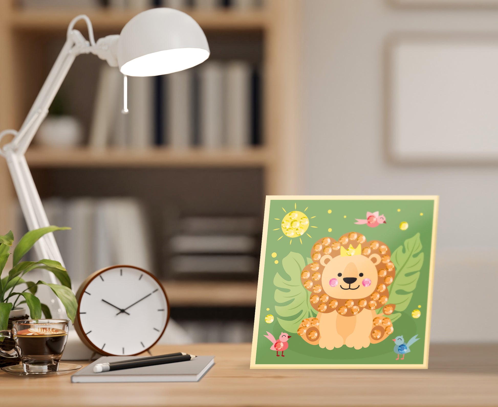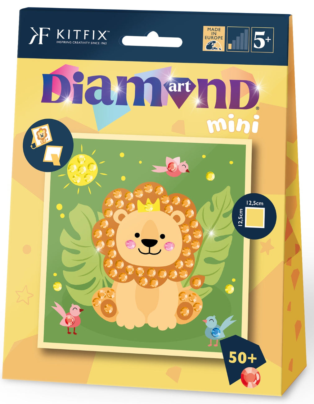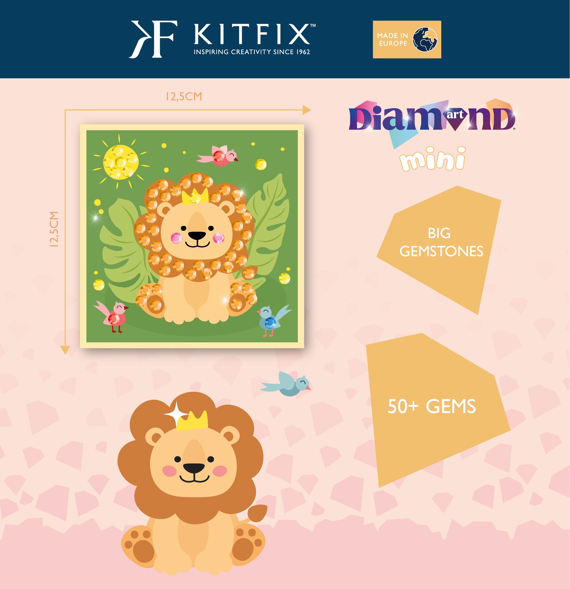 Self-adhesive picture, gems, pencil, pencil sharpener, plastic tray and instructions.
