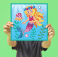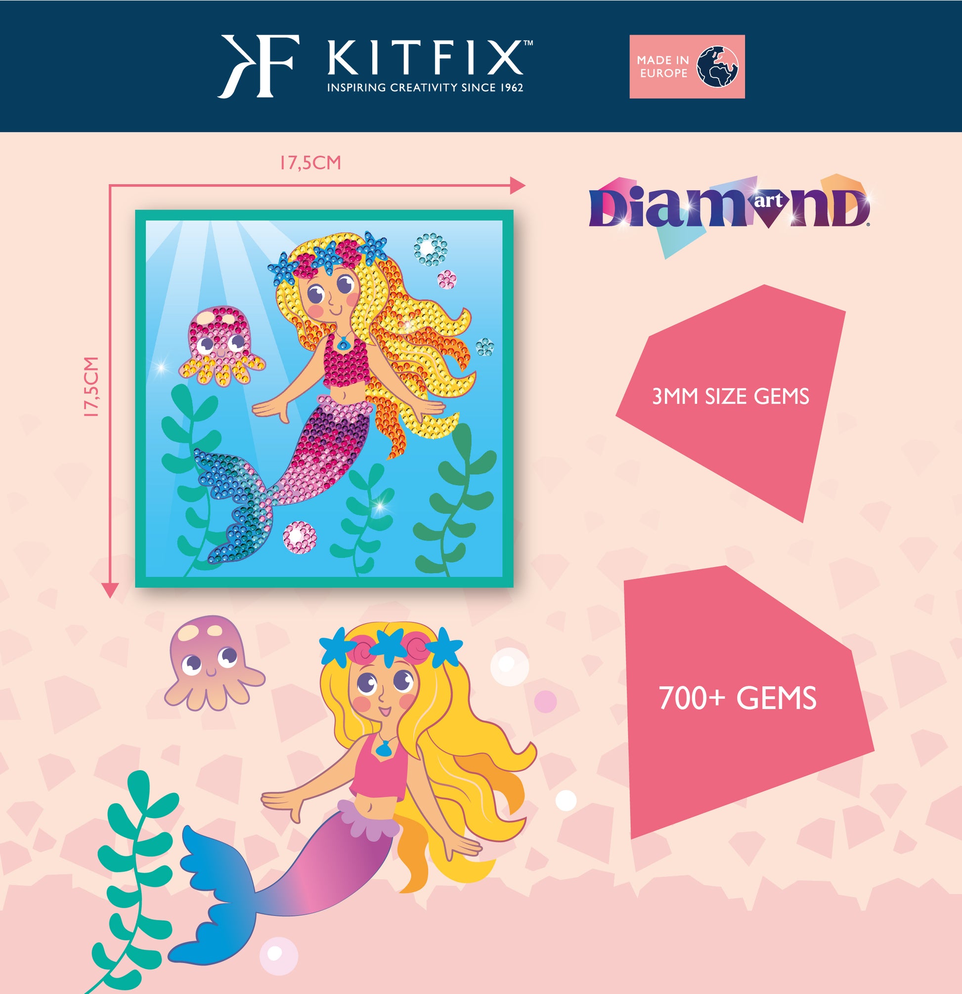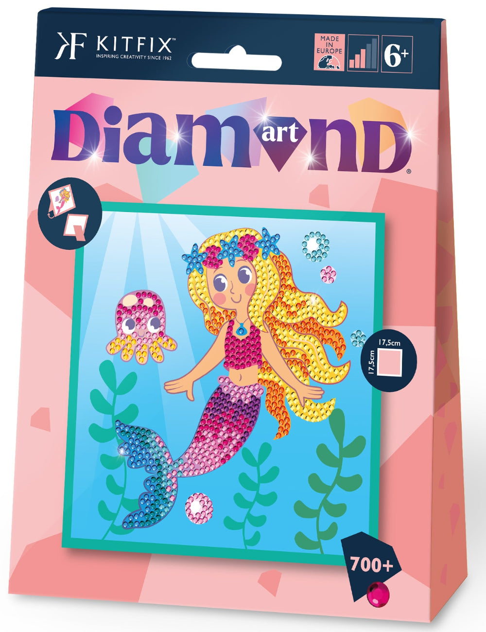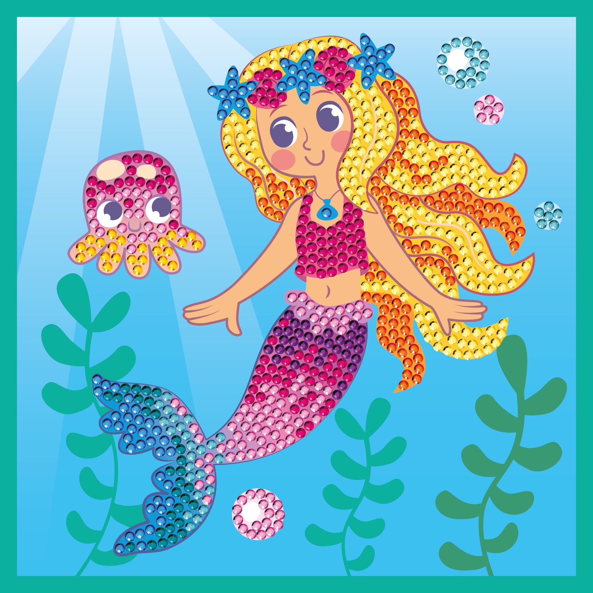 Self-adhesive picture, gems, pencil, pencil sharpener, plastic tray and instructions.