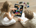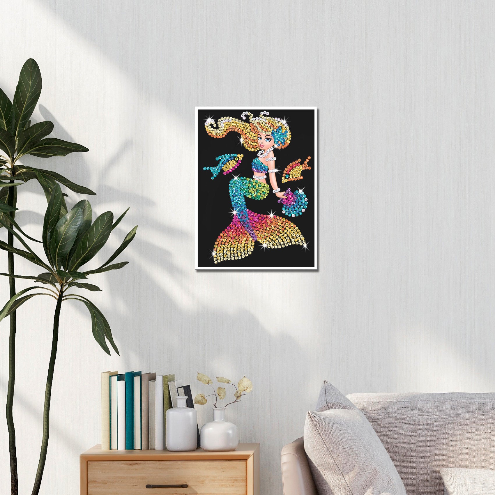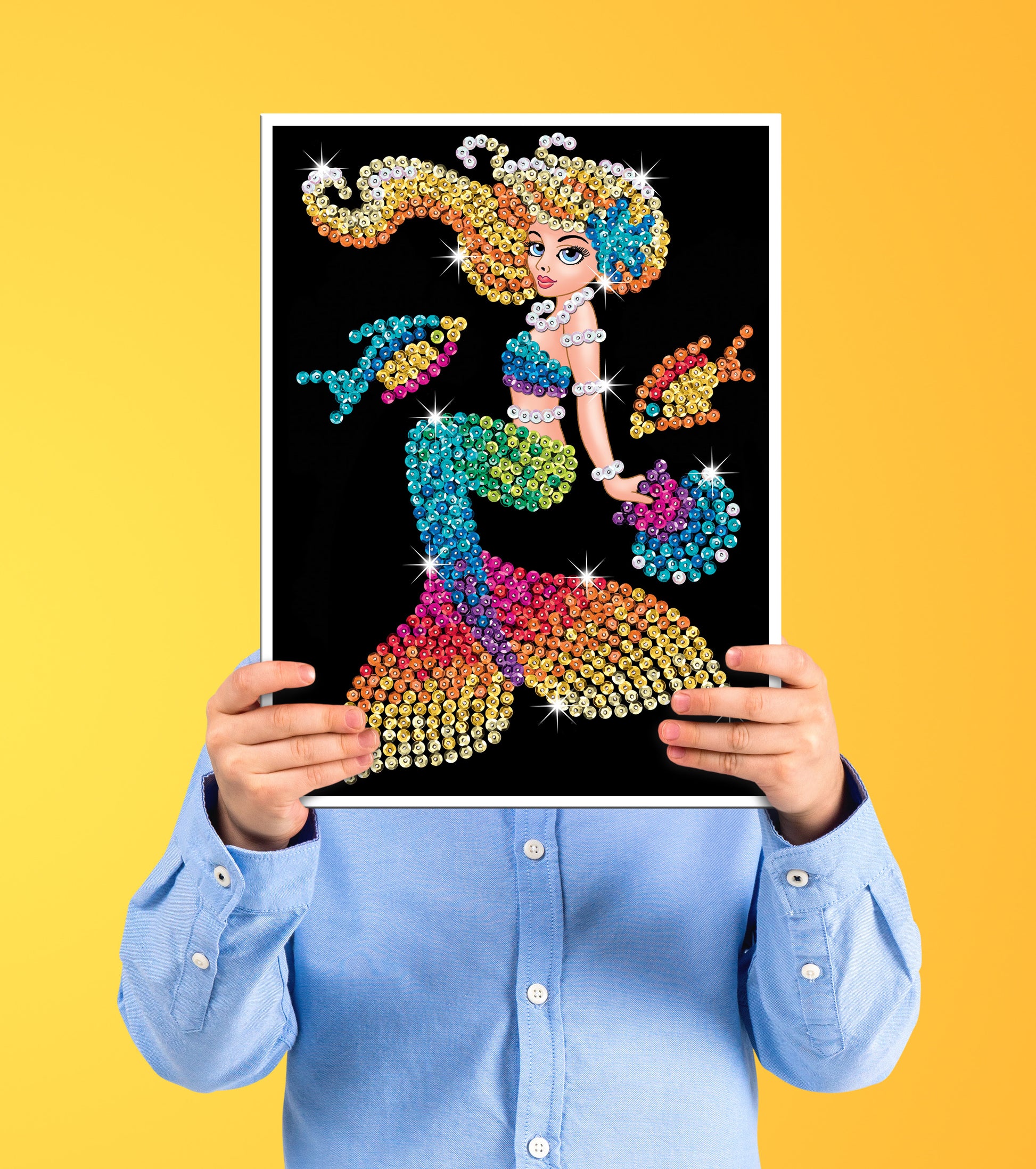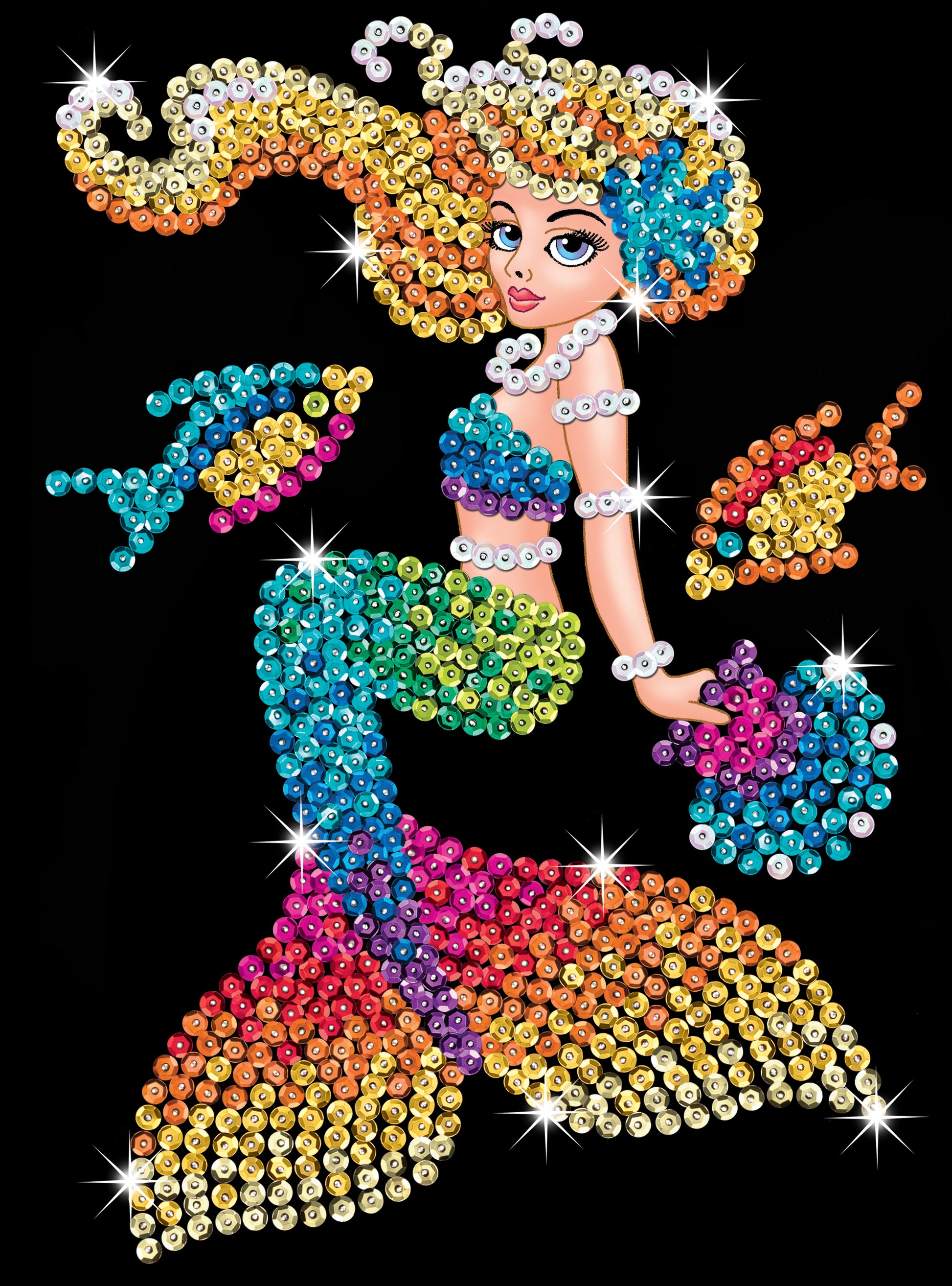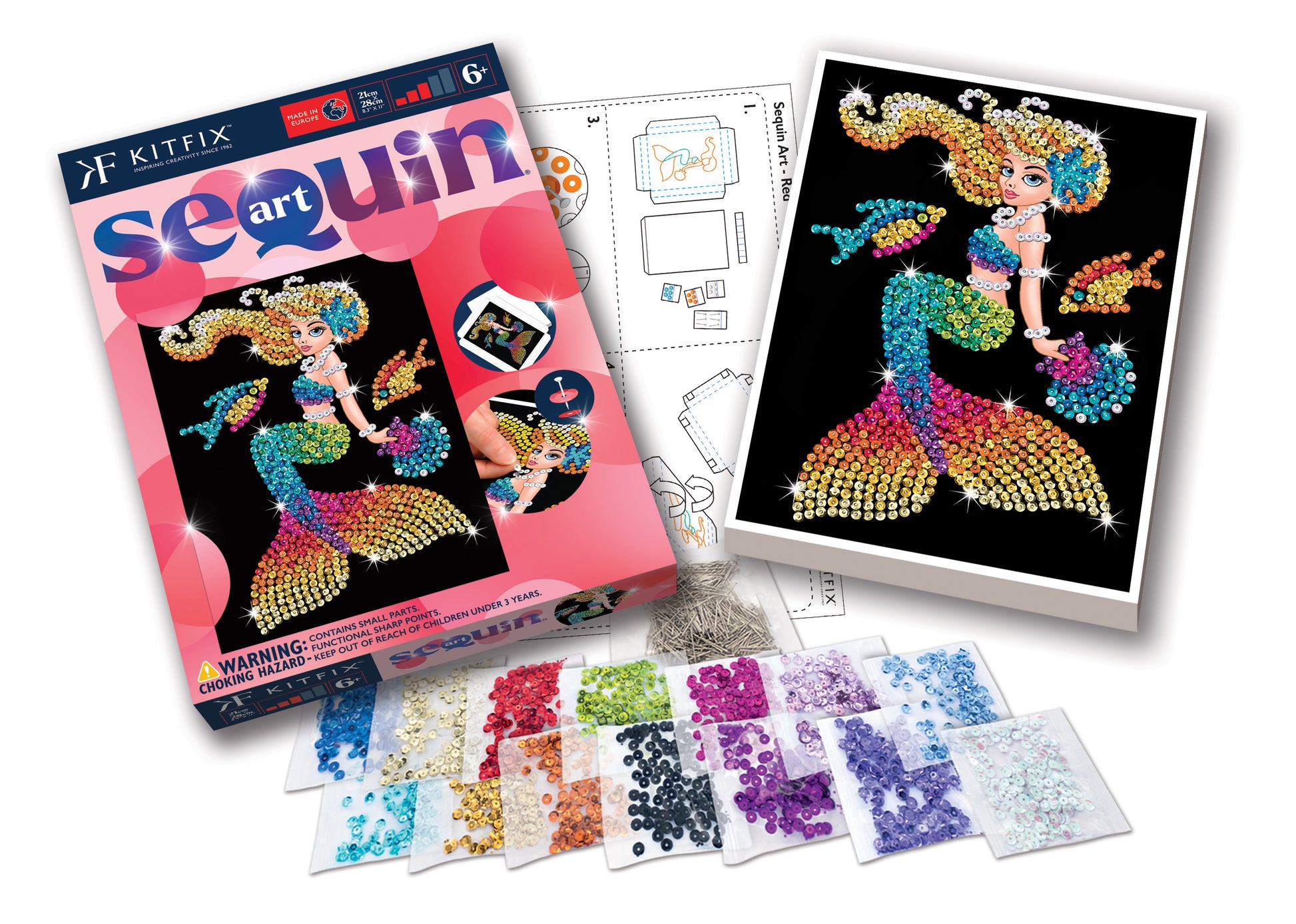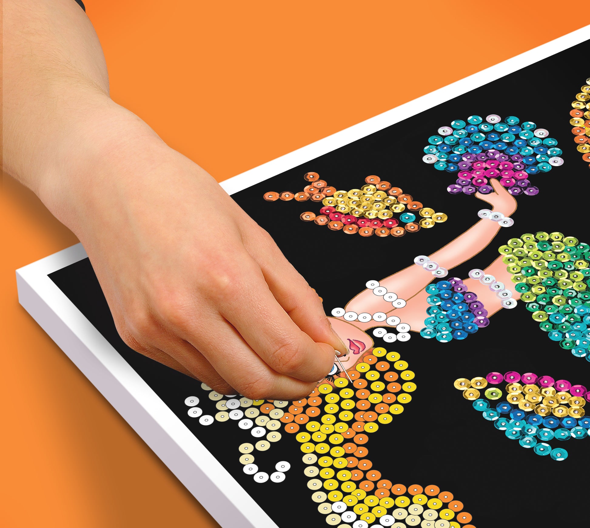 Polystyrene base, coloured wrap around picture, coloured sequins, pins, instructions, adhesive tabs