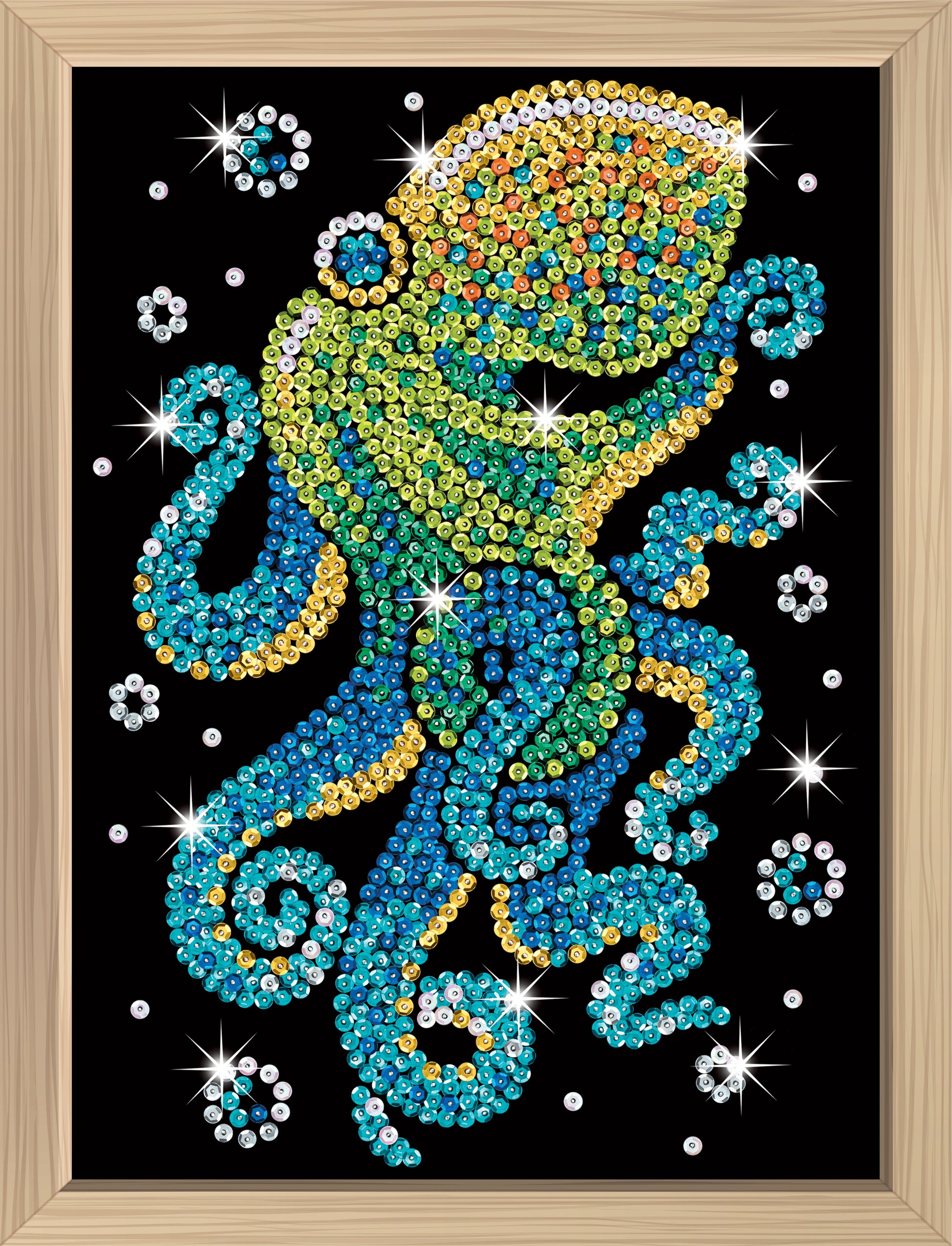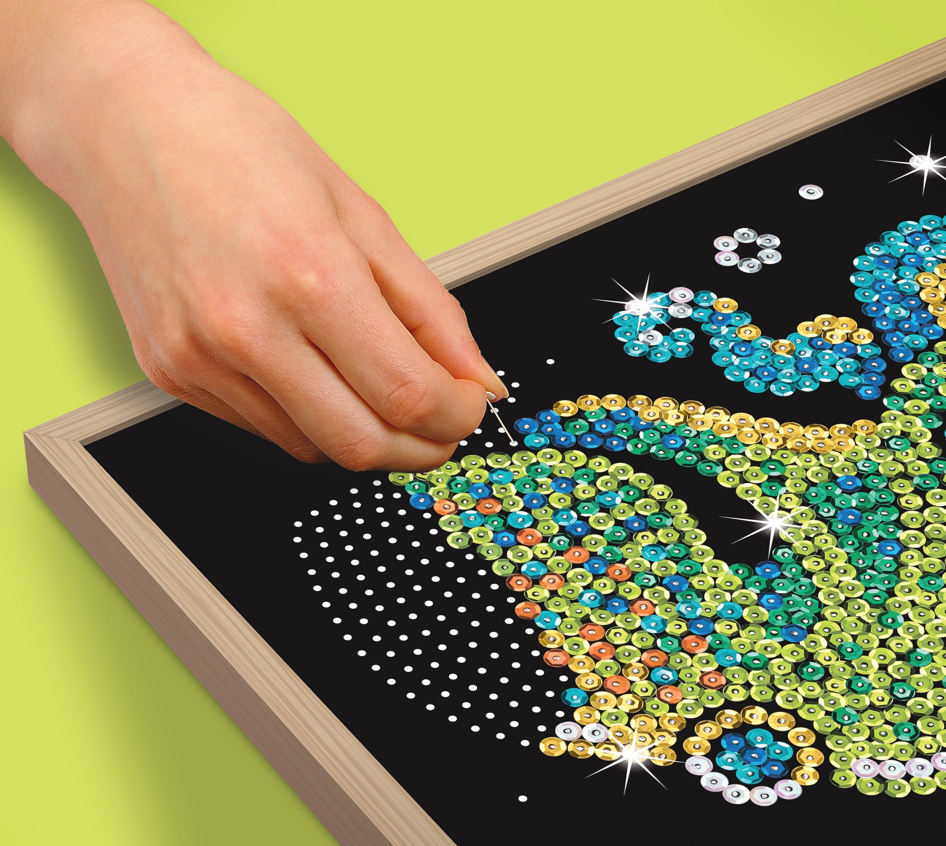 Polystyrene base, flocked picture, coloured sequins, pins, instructions, wooden frame, colour instruction leaflet, adhesive tabs