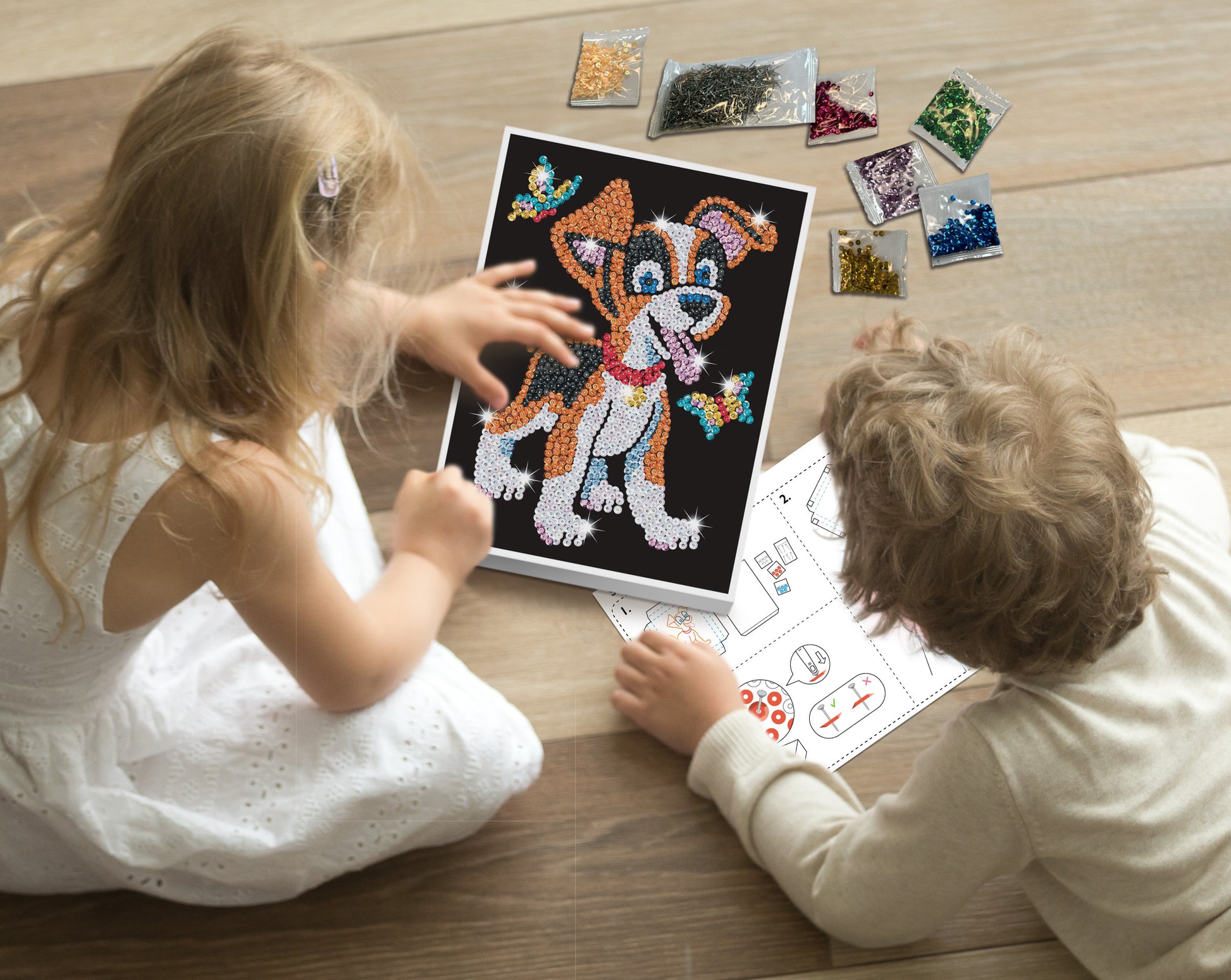 Polystyrene base, coloured wrap around picture, coloured sequins, pins, instructions, adhesive tabs