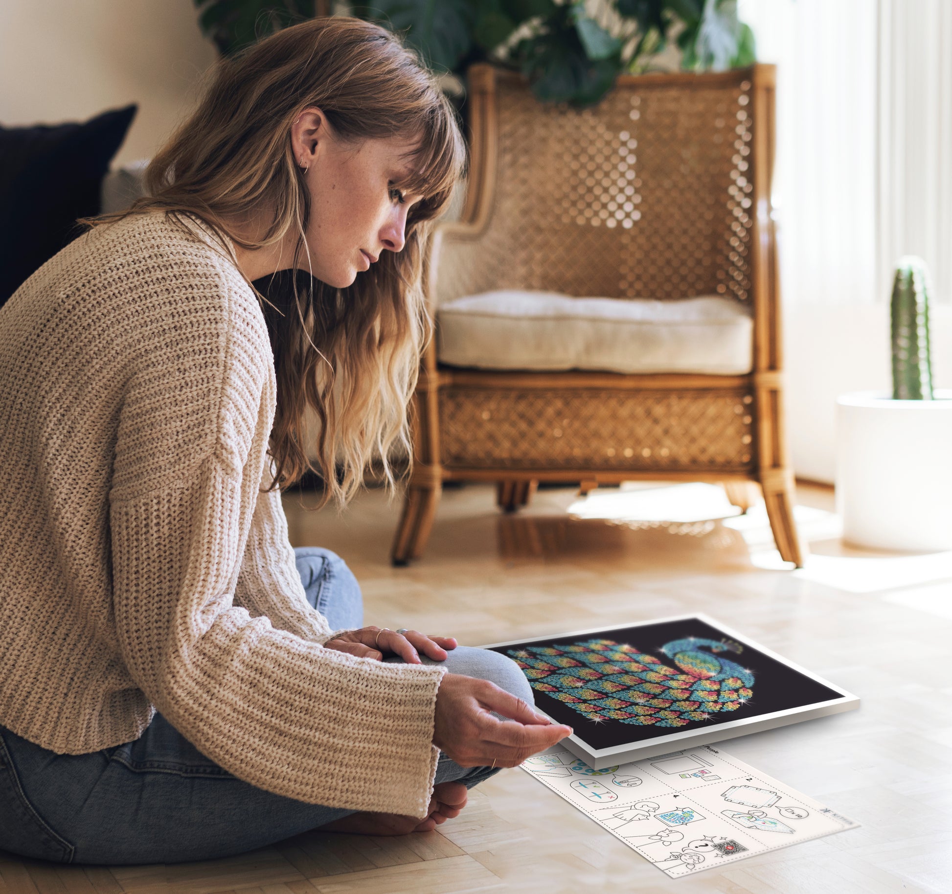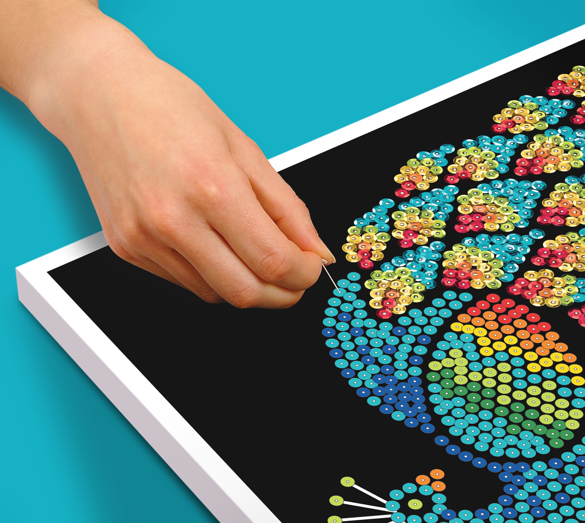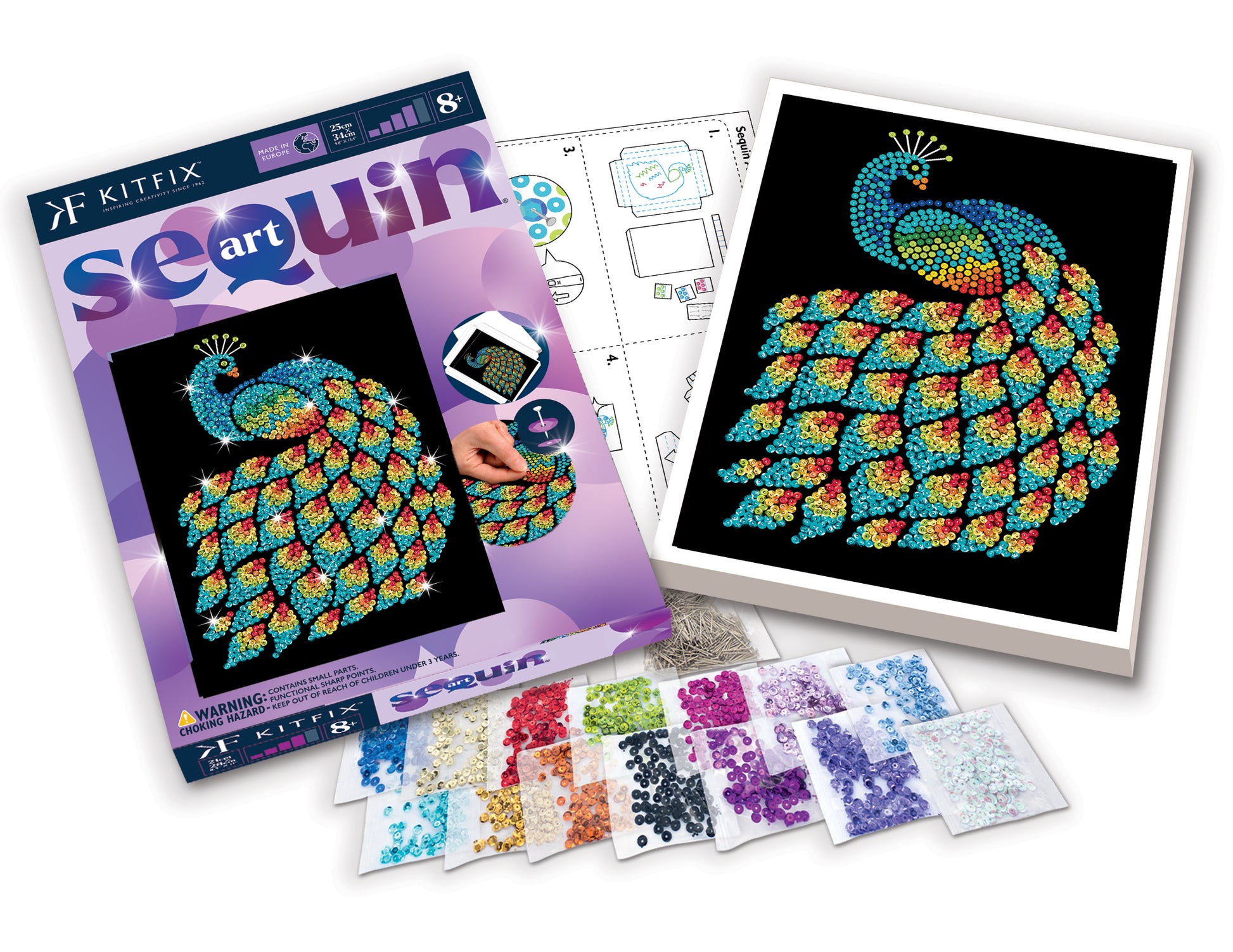 Polystyrene base, coloured wrap around picture, coloured sequins, pins, instructions, adhesive tabs