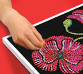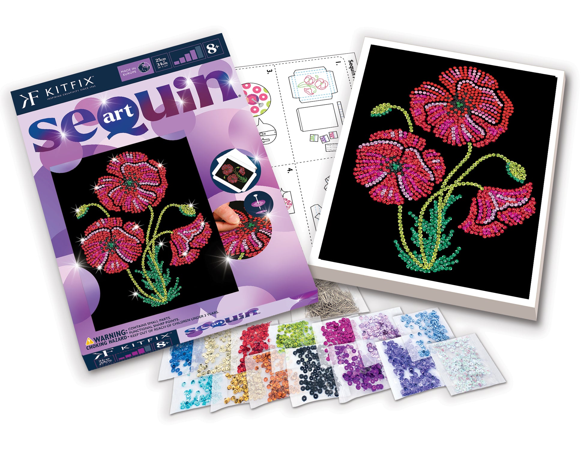 Polystyrene base, coloured wrap around picture, coloured sequins, pins, instructions, adhesive tabs