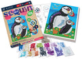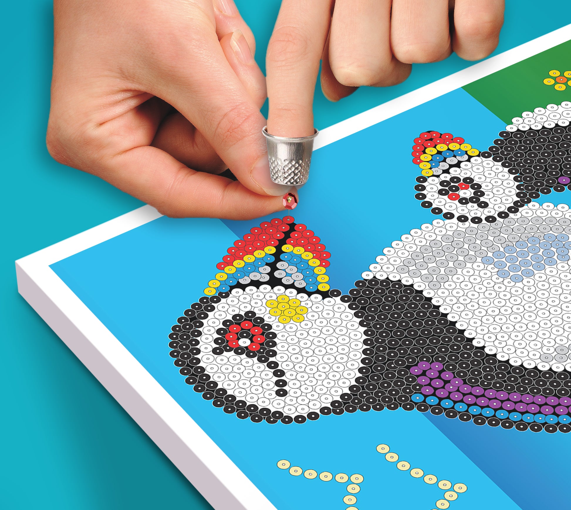 Cardboard tile, coloured wrap around picture, coloured sequins, pins, thimble, instructions, adhesive tabs.