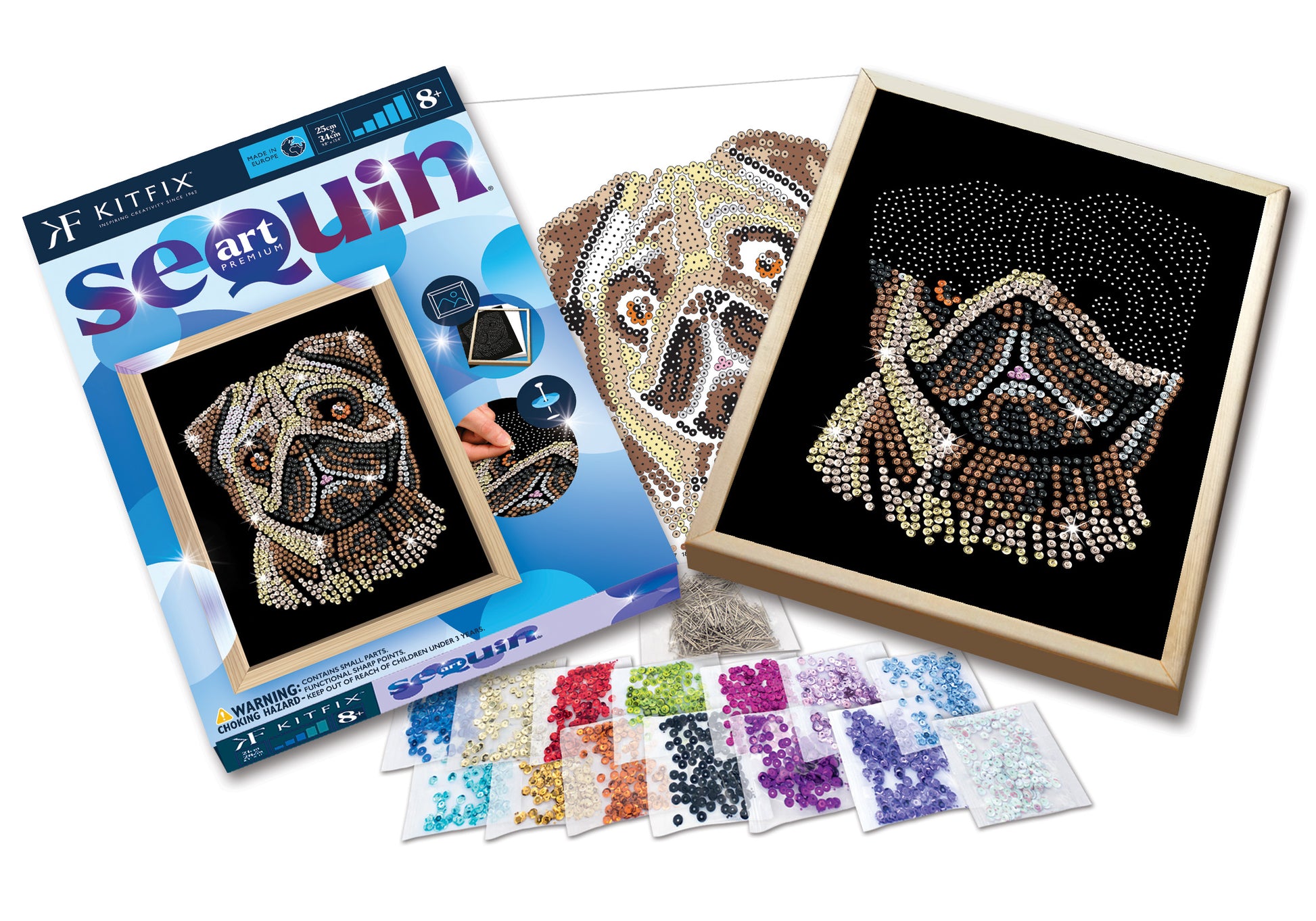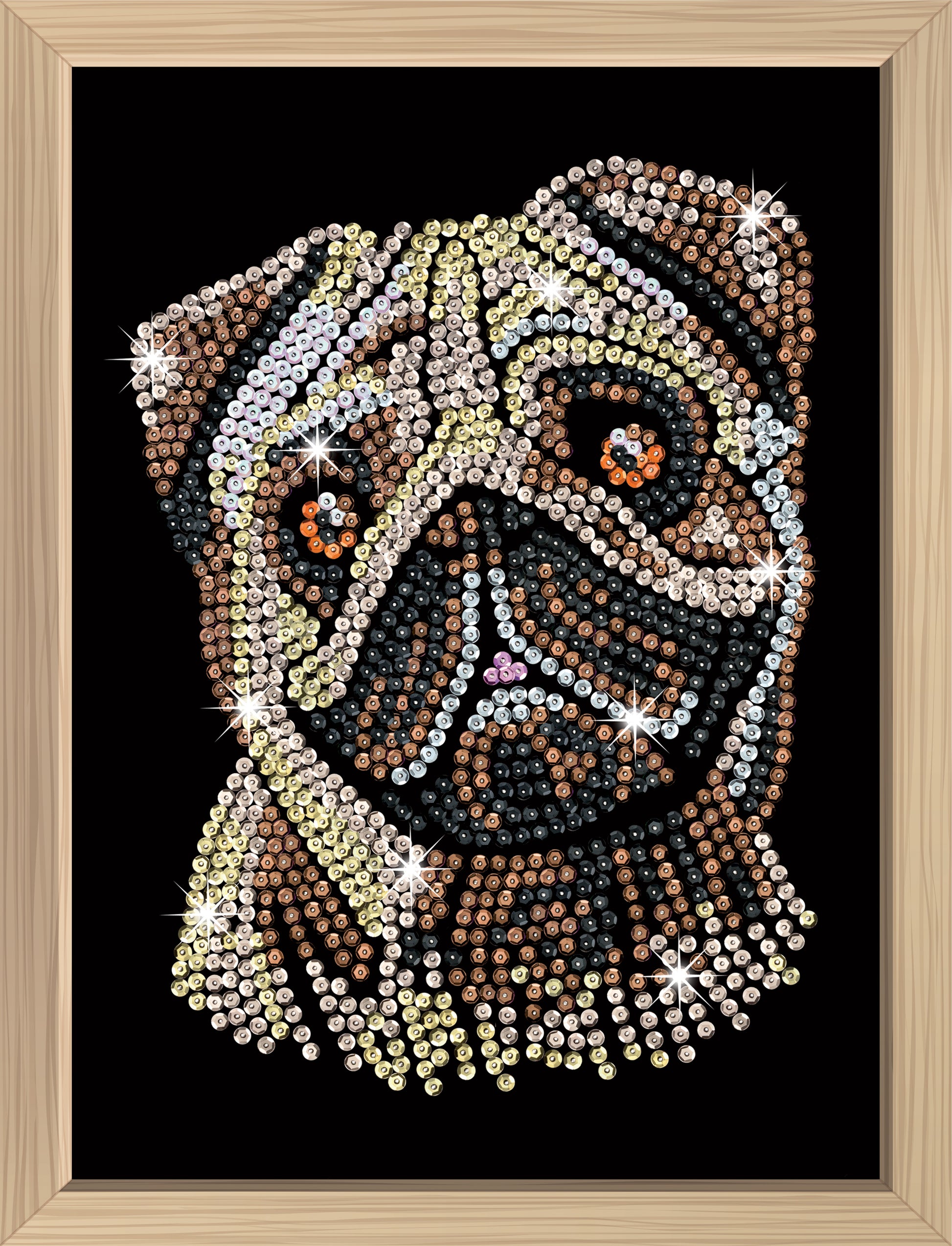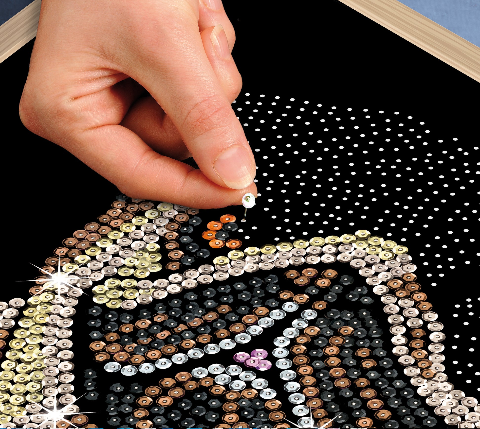 Polystyrene base, flocked picture, coloured sequins, pins, instructions, wooden frame, colour instruction leaflet, adhesive tabs