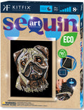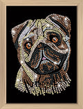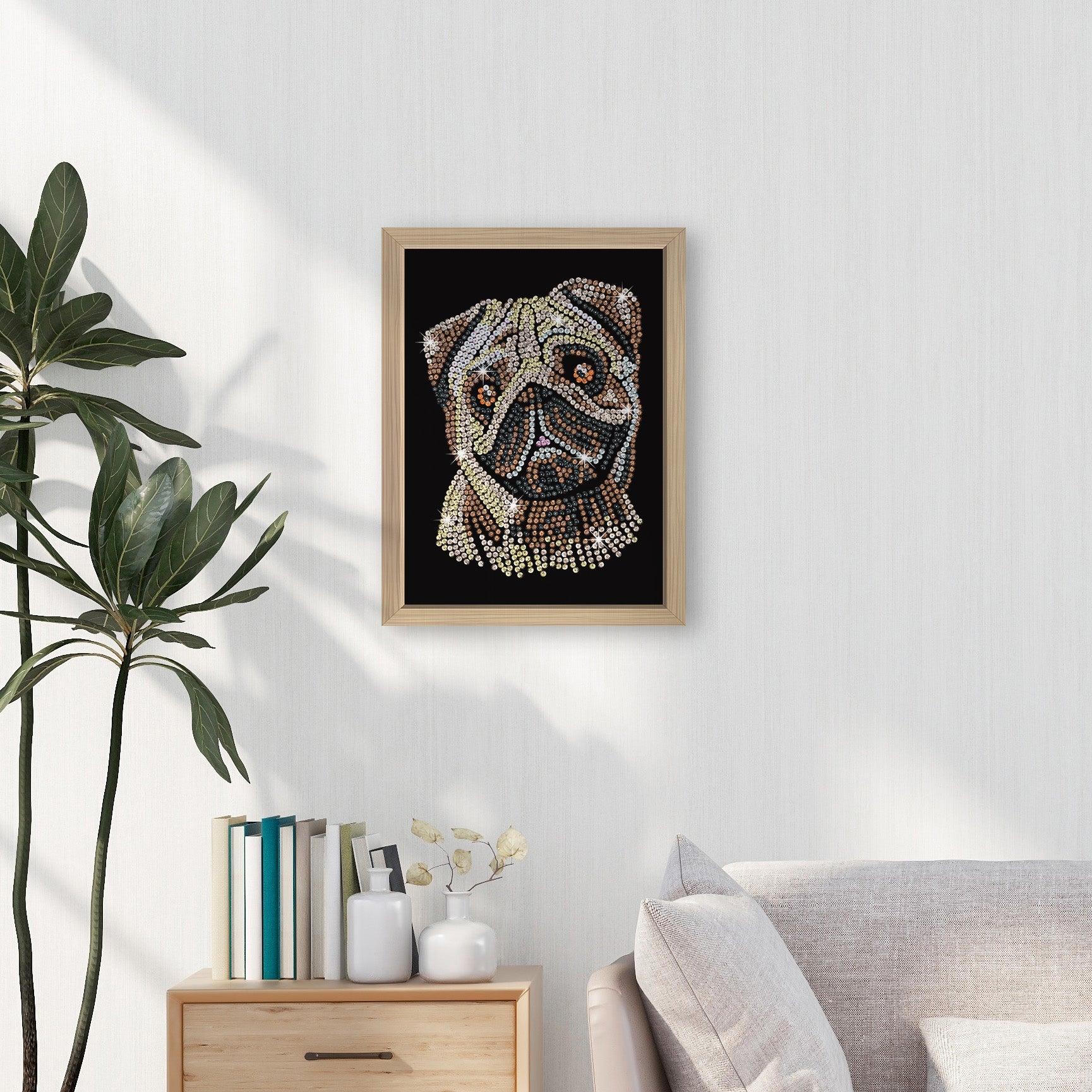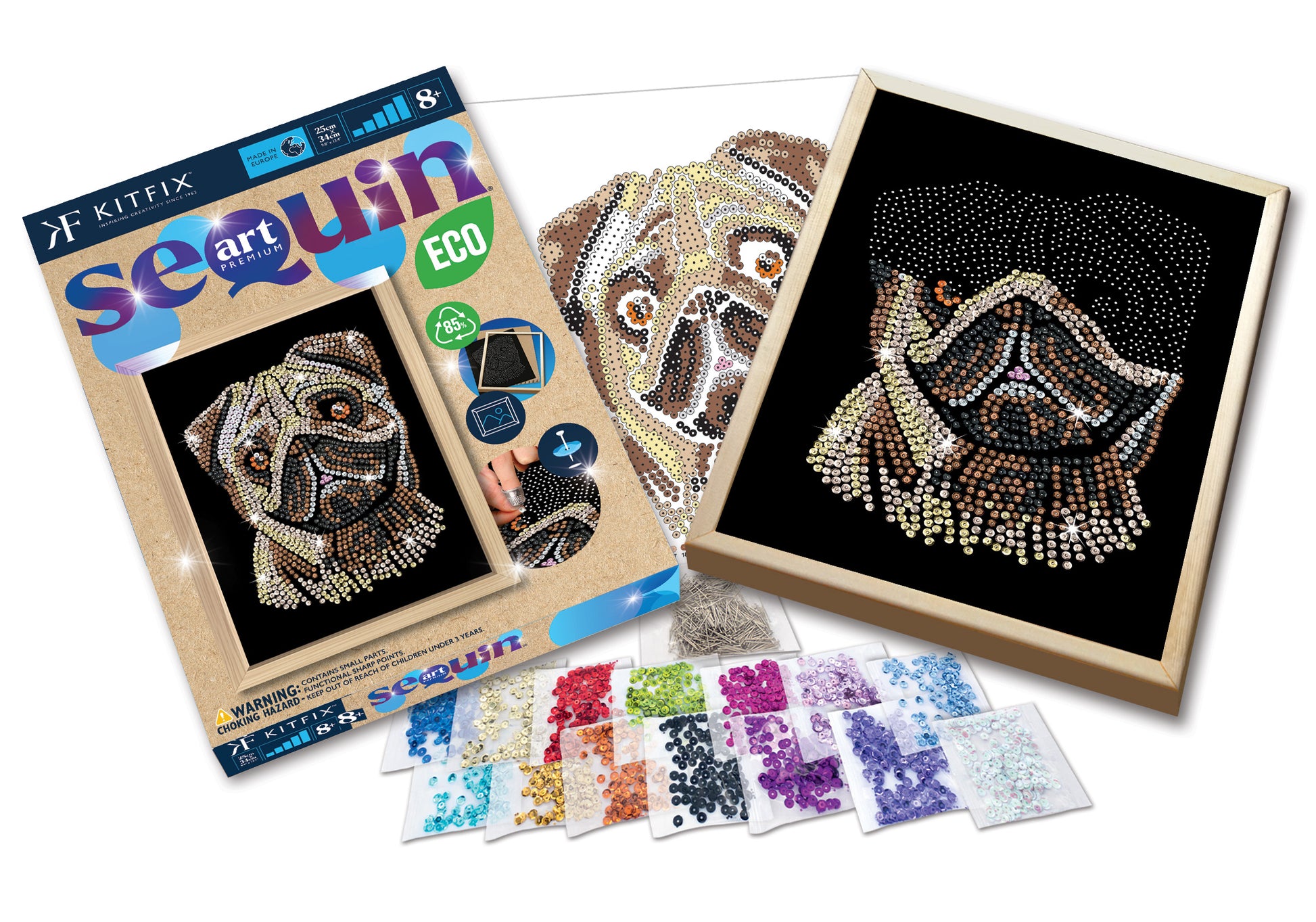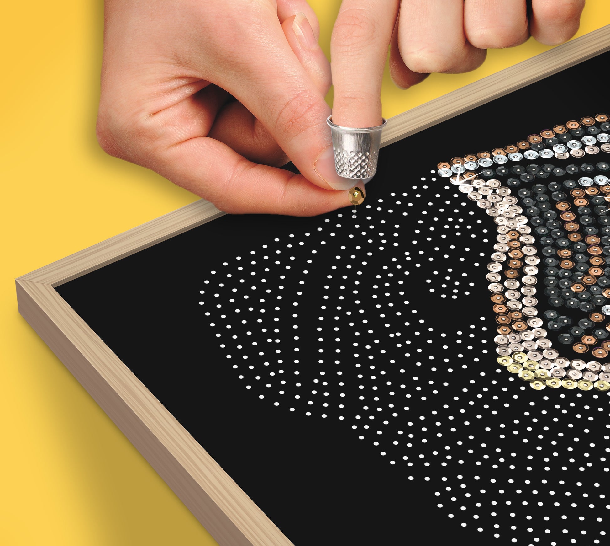Cardboard tile, flocked picture, coloured sequins, pins, thimble, instructions and wooden frame, adhesive tabs.
