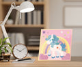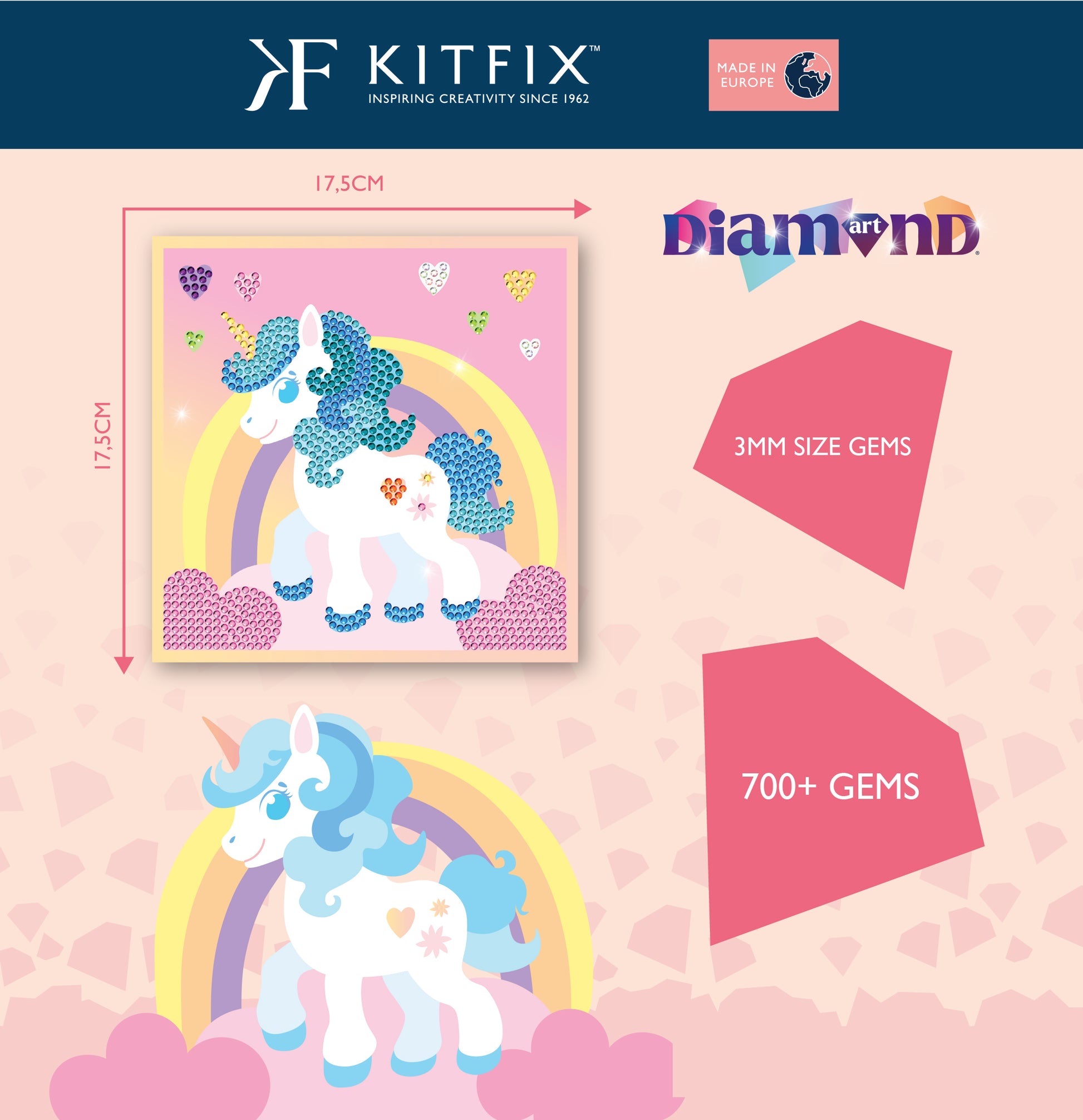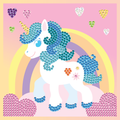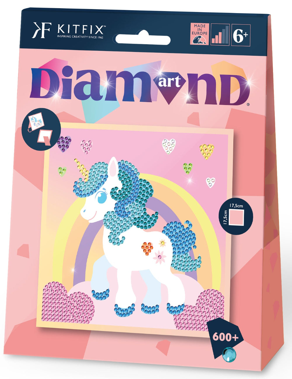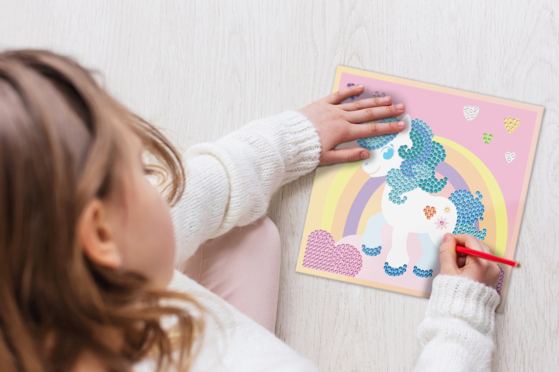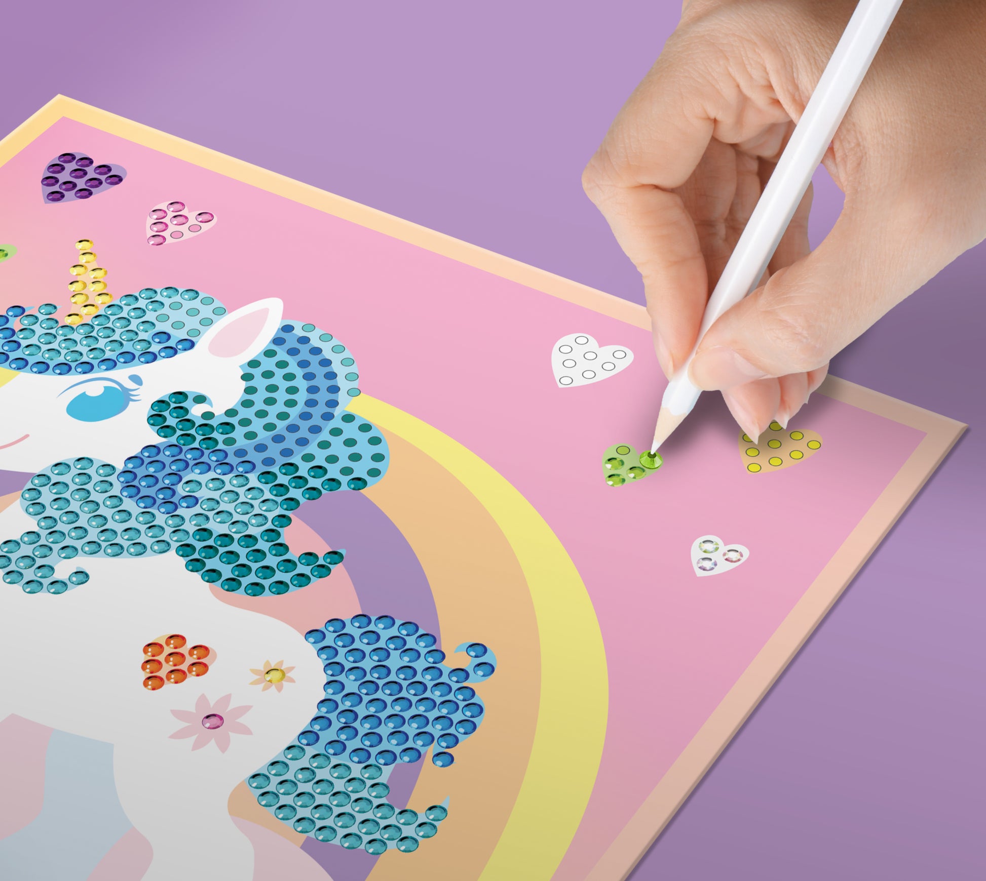 Self-adhesive picture, gems, pencil, pencil sharpener, plastic tray and instructions.