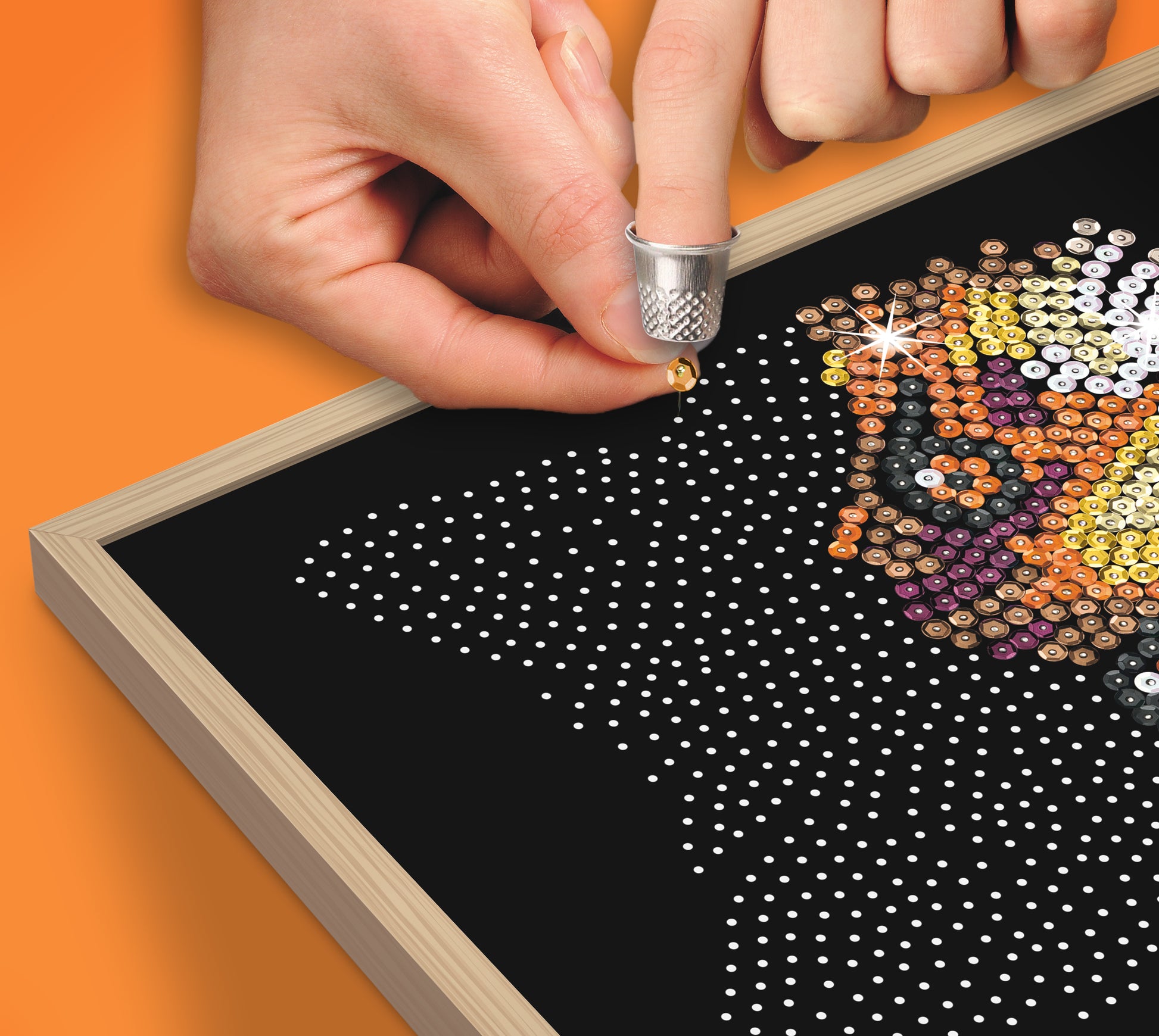 Cardboard tile, flocked picture, coloured sequins, pins, thimble, instructions and wooden frame, adhesive tabs.