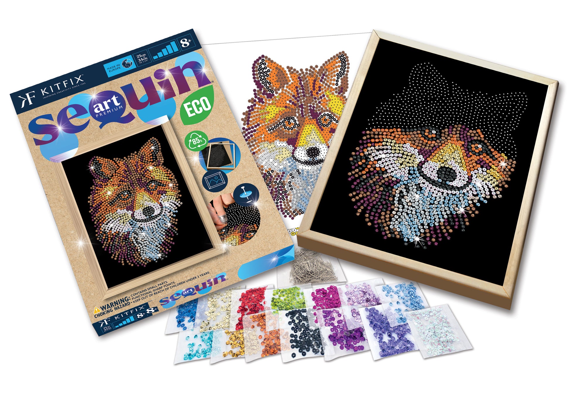 Still with a luxurious flocked velvet background and solid wooden frame, but held on an eco-friendly engineered cardboard base. For our most advanced crafters (8+), the same beautiful designs, sustainably set-off to perfection.