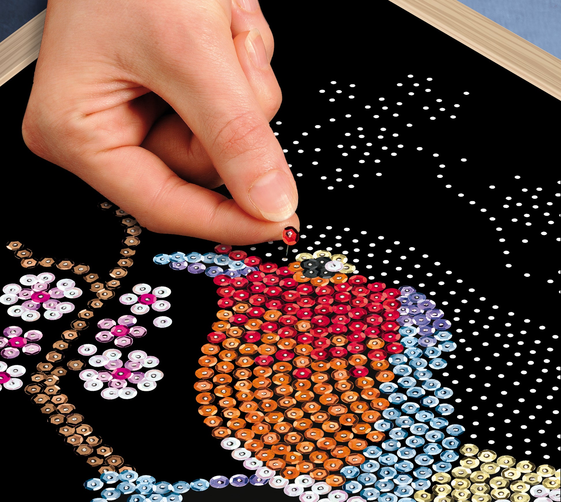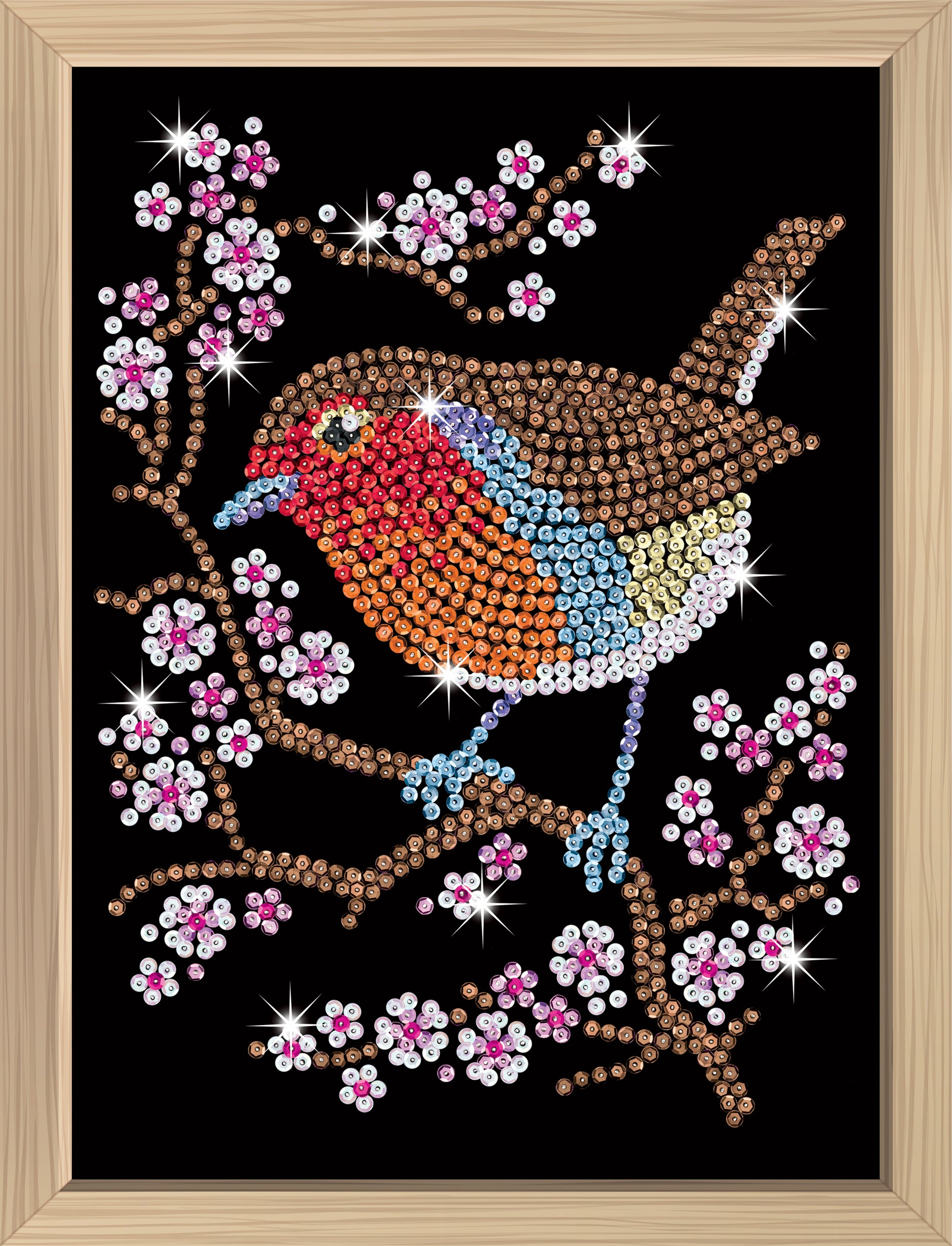 Polystyrene base, flocked picture, coloured sequins, pins, instructions, wooden frame, colour instruction leaflet, adhesive tabs