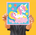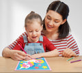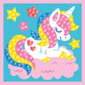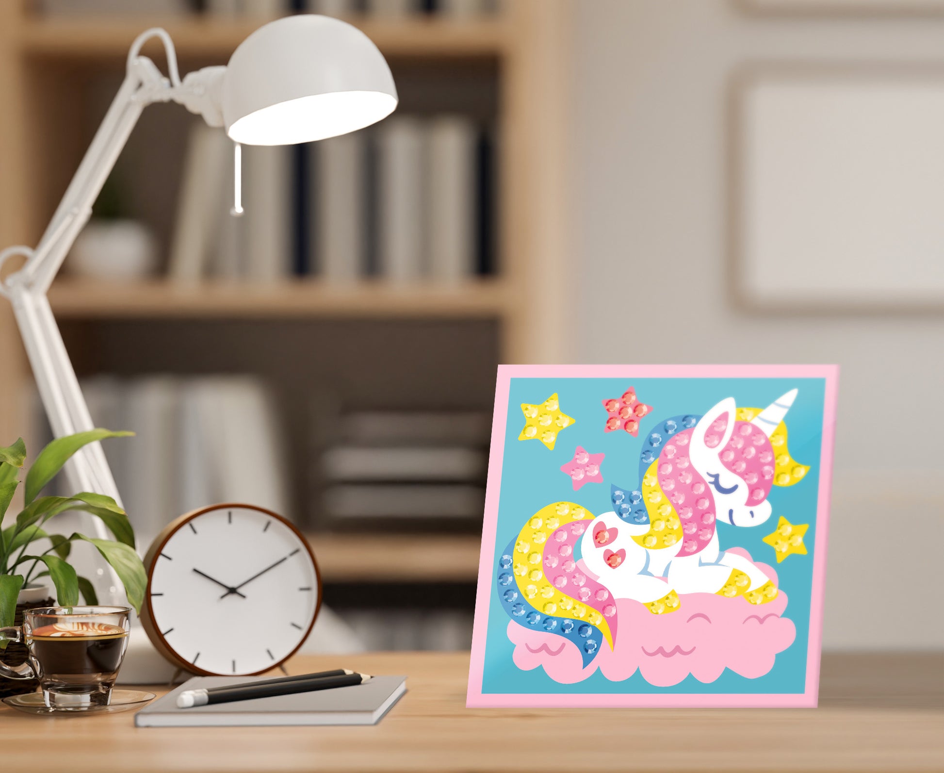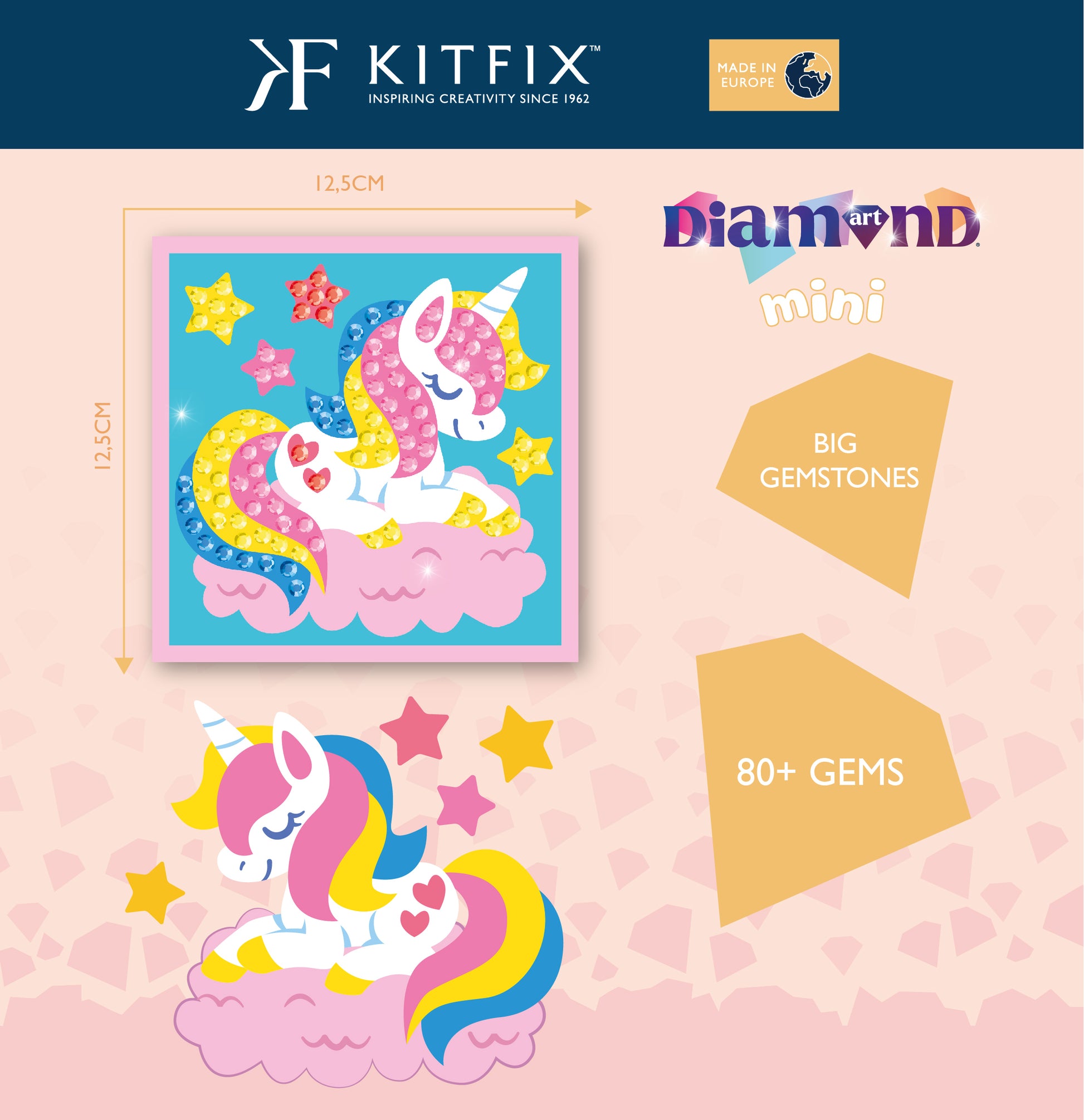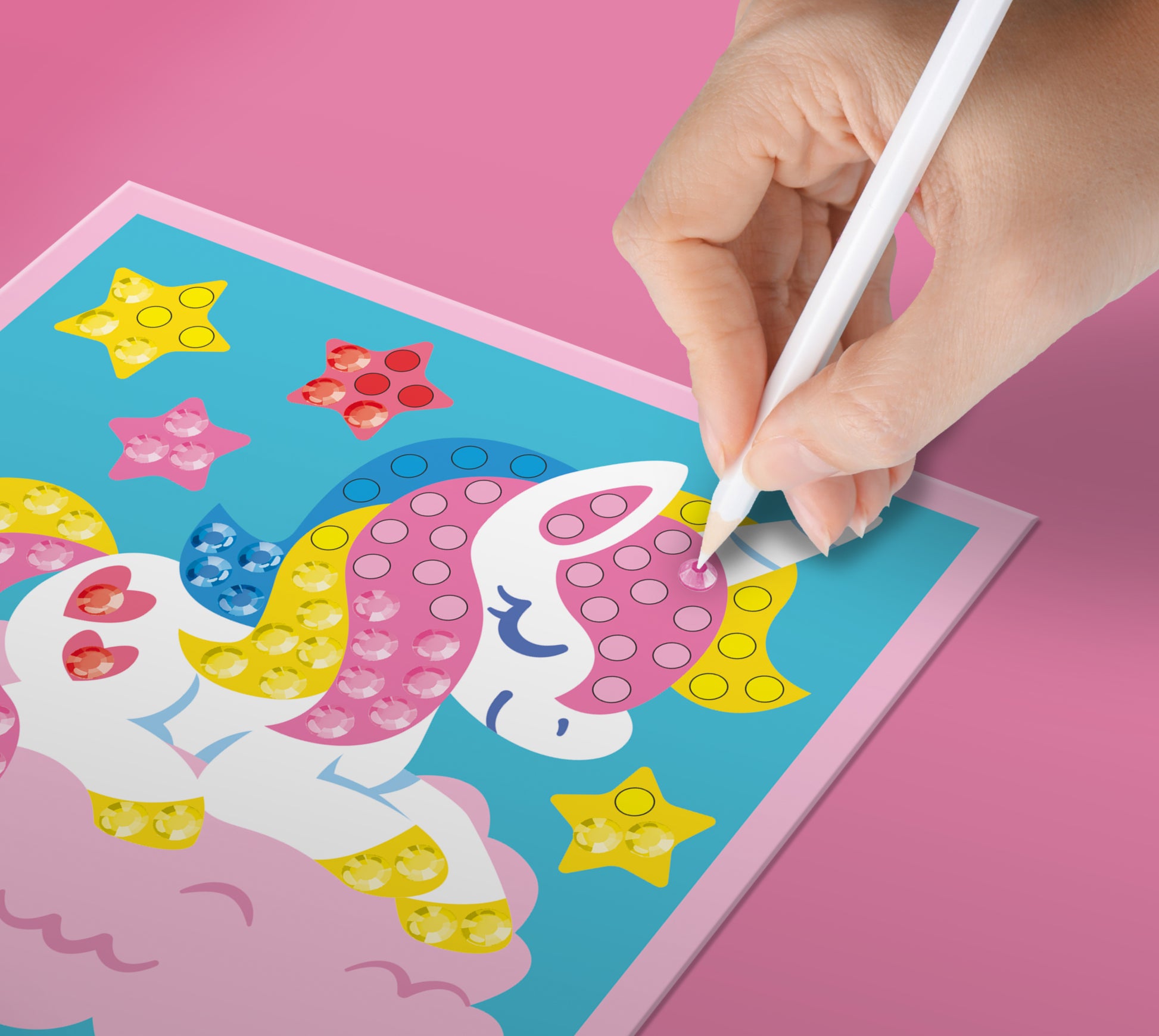 Self-adhesive picture, gems, pencil, pencil sharpener, plastic tray and instructions.
