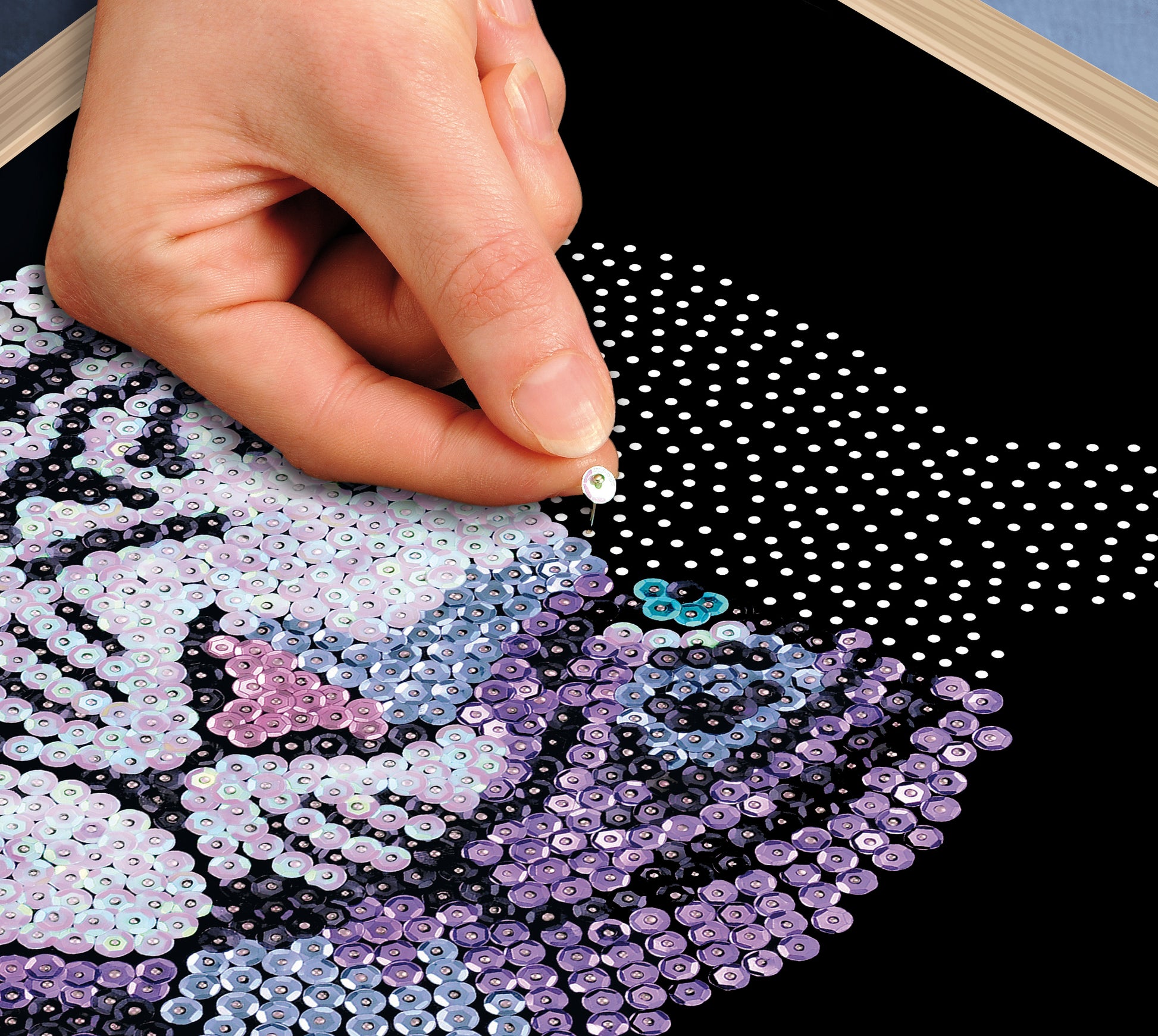 Polystyrene base, flocked picture, coloured sequins, pins, instructions, wooden frame, colour instruction leaflet, adhesive tabs