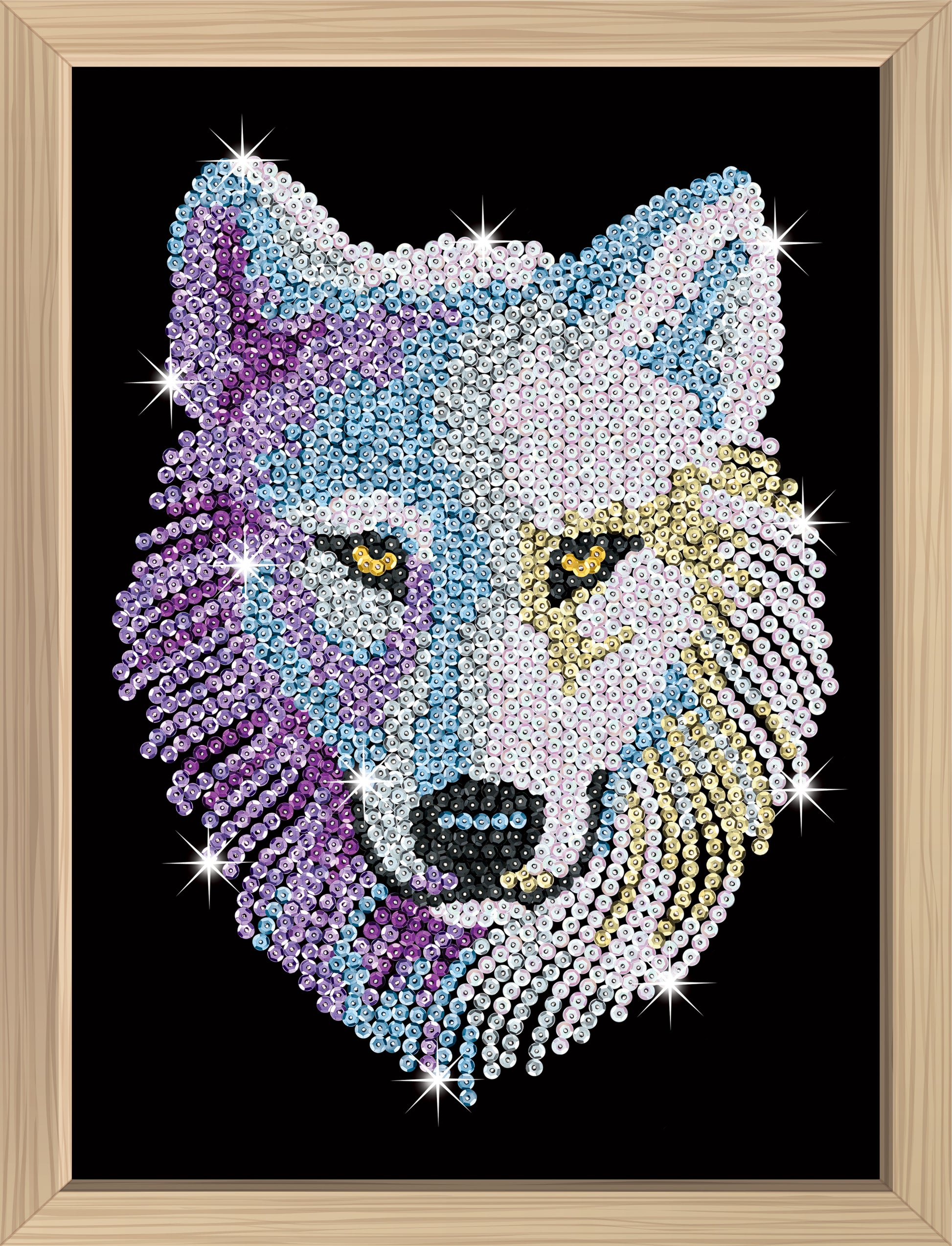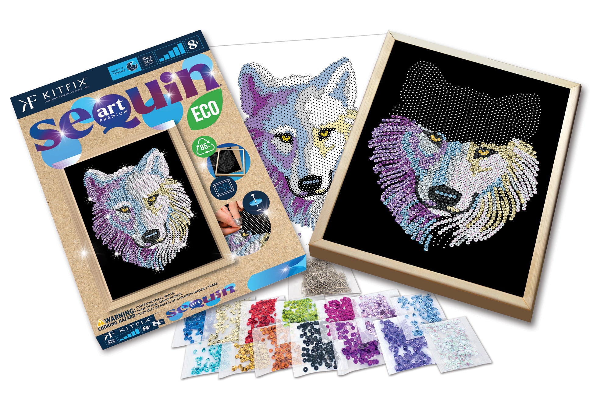 Cardboard tile, flocked picture, coloured sequins, pins, thimble, instructions and wooden frame, adhesive tabs.