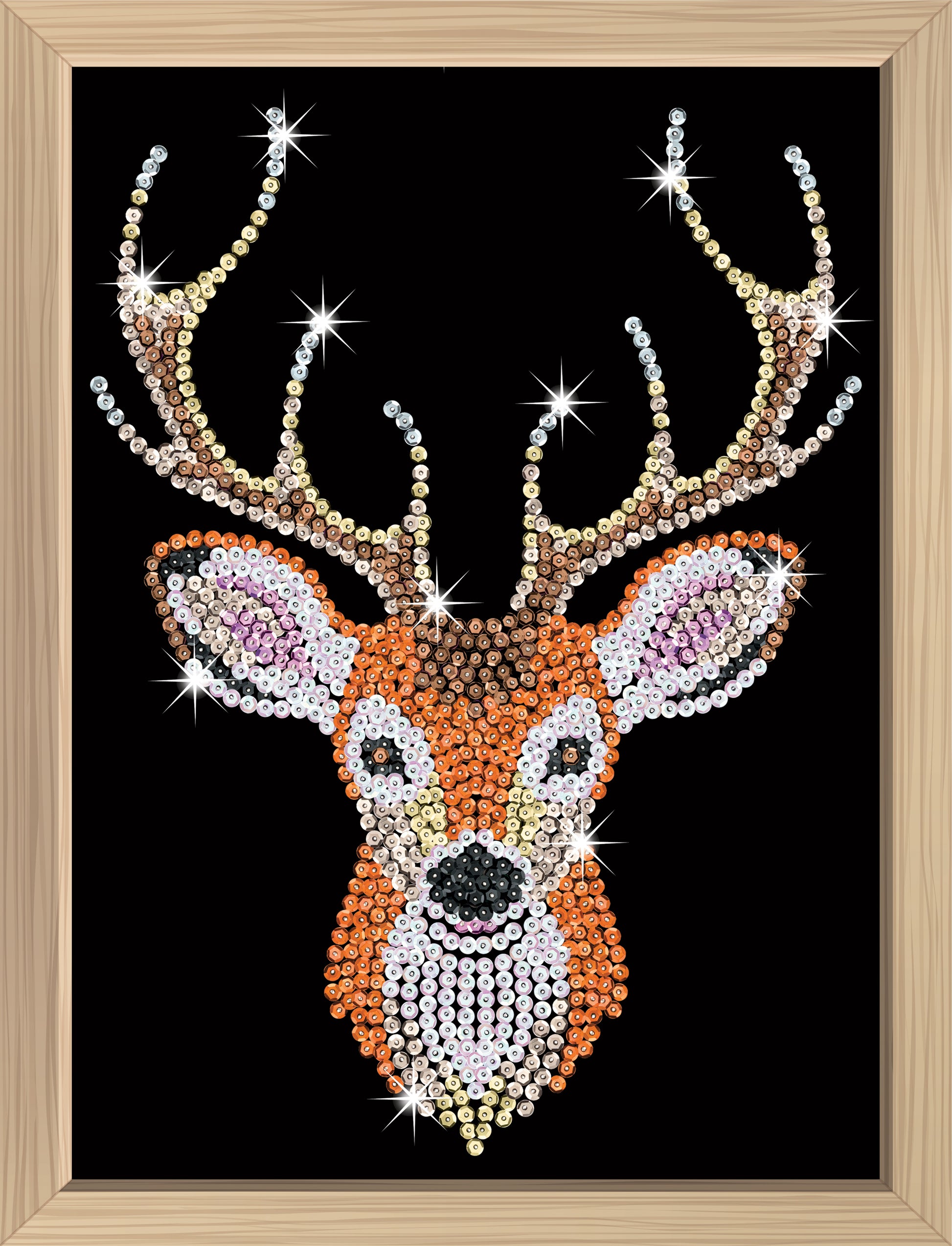 Polystyrene base, flocked picture, coloured sequins, pins, instructions, wooden frame, colour instruction leaflet, adhesive tabs