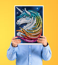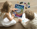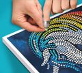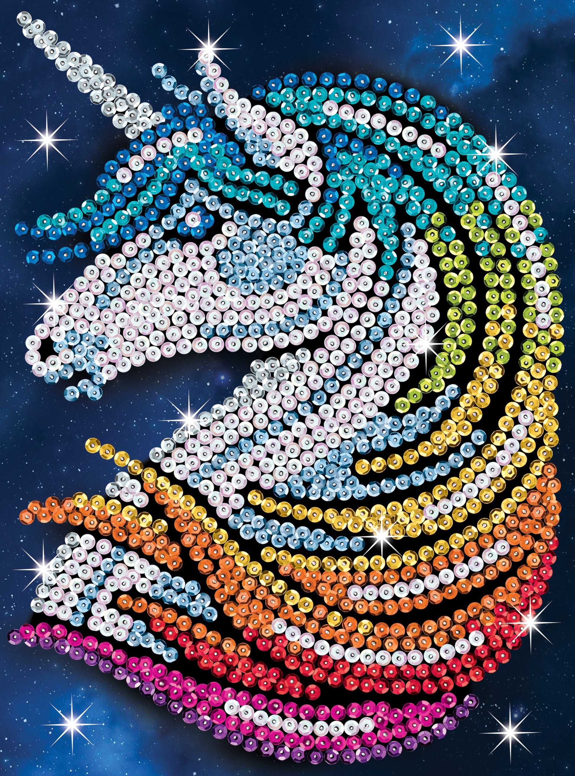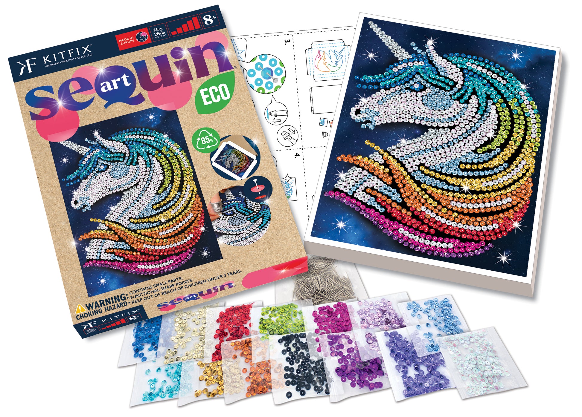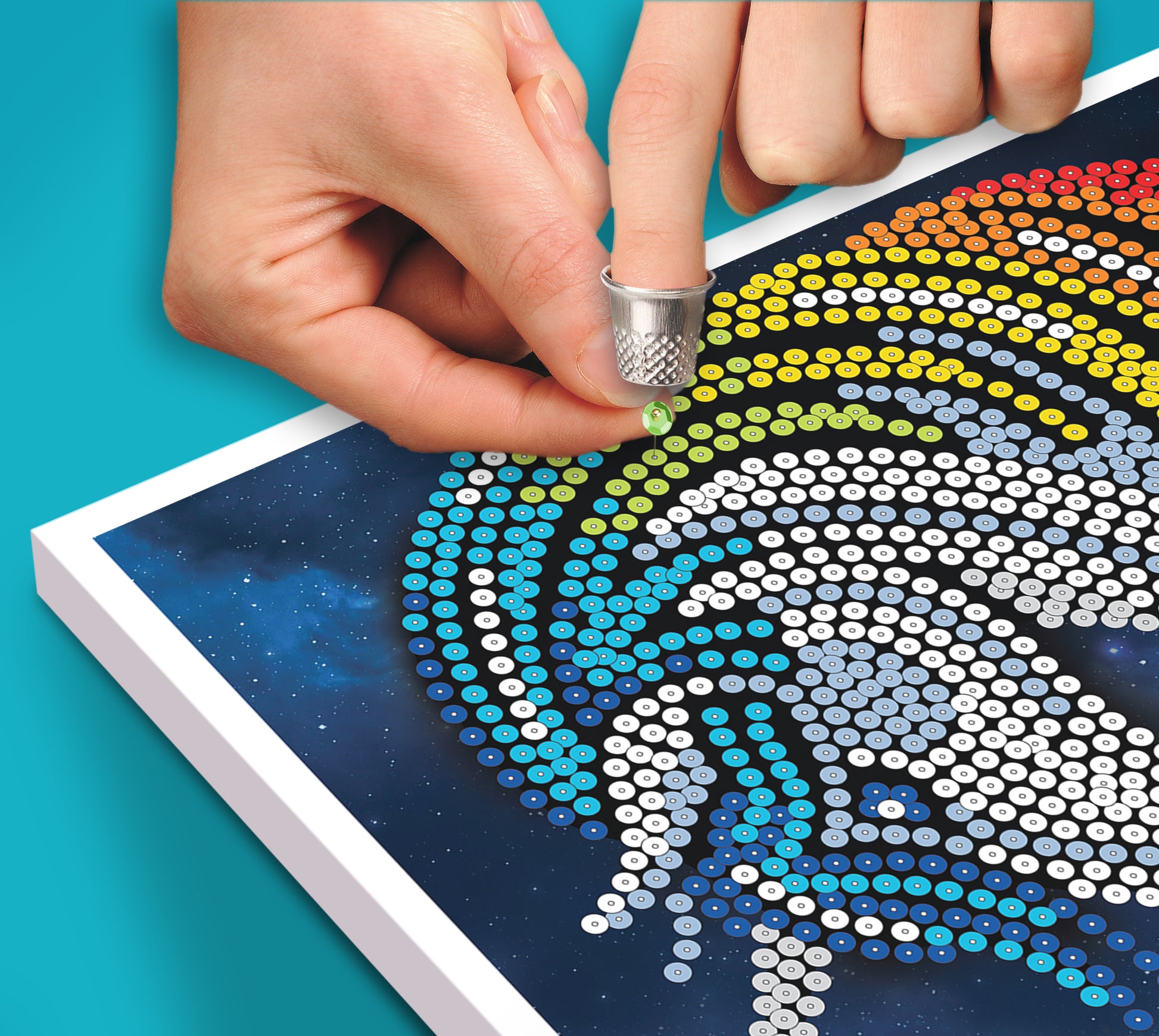 Cardboard tile, coloured wrap around picture, coloured sequins, pins, thimble, instructions, adhesive tabs.