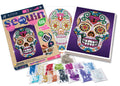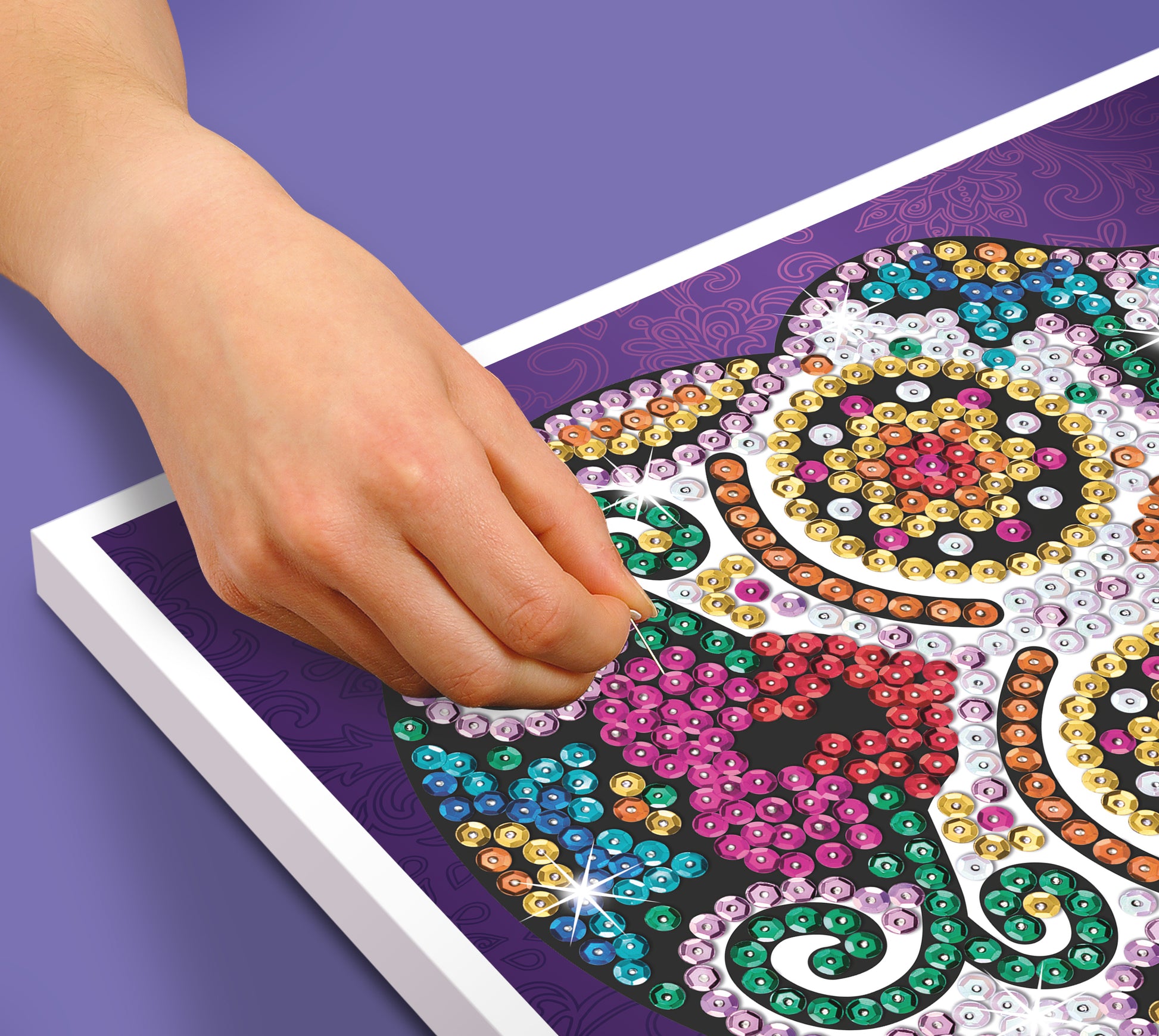 Cardboard tile, coloured wrap around picture, coloured sequins, pins, thimble, instructions, adhesive tabs