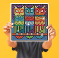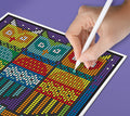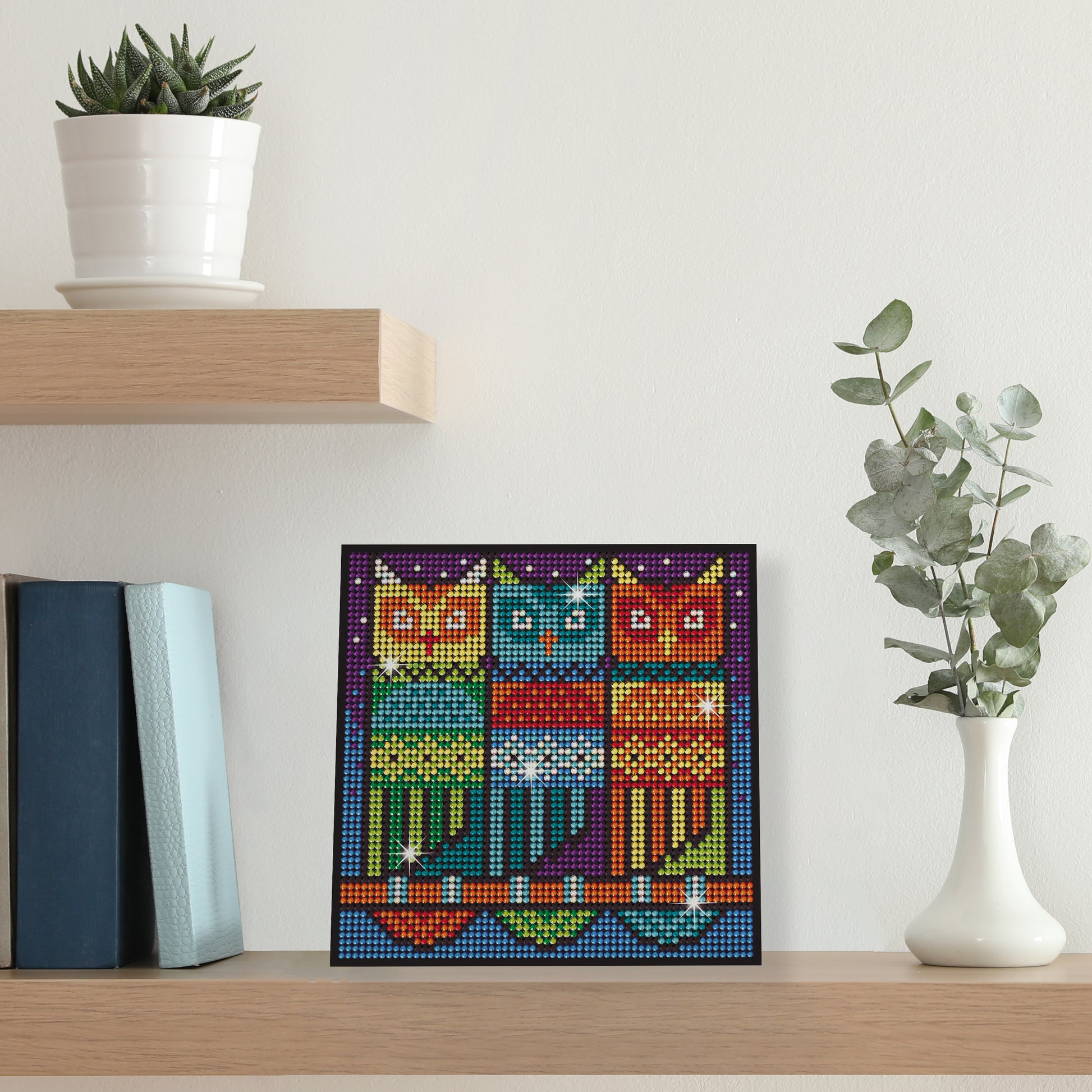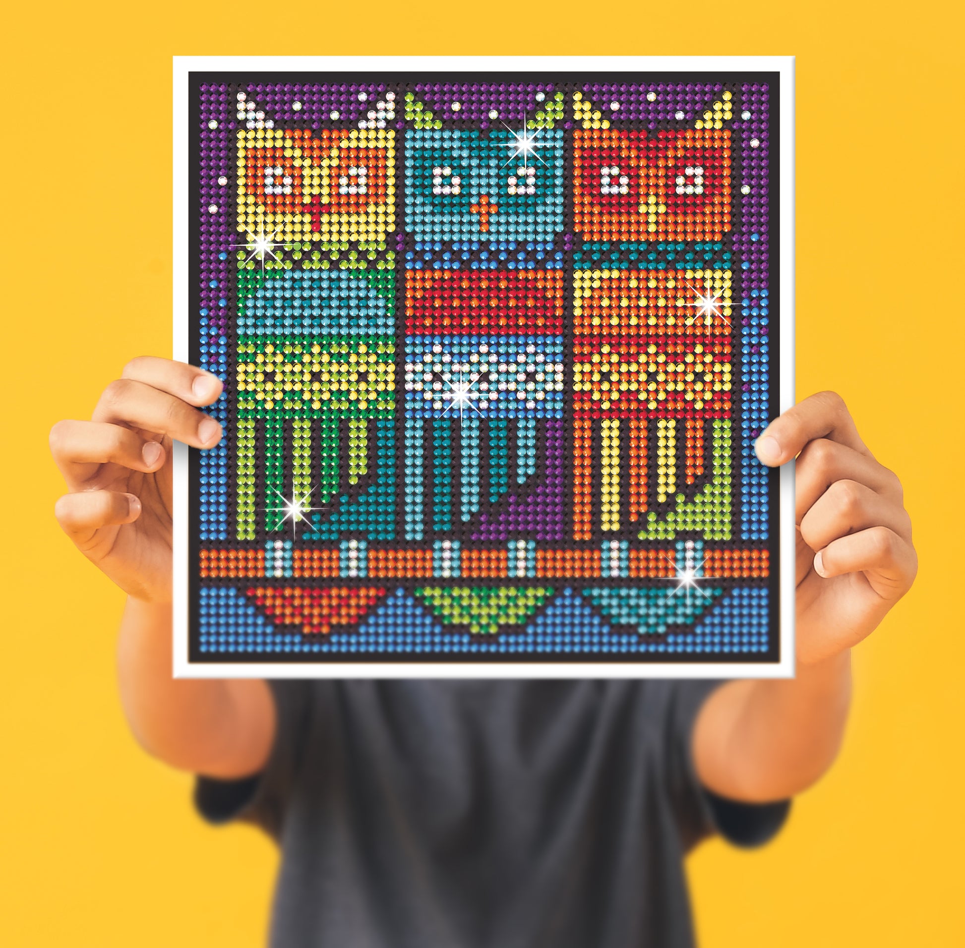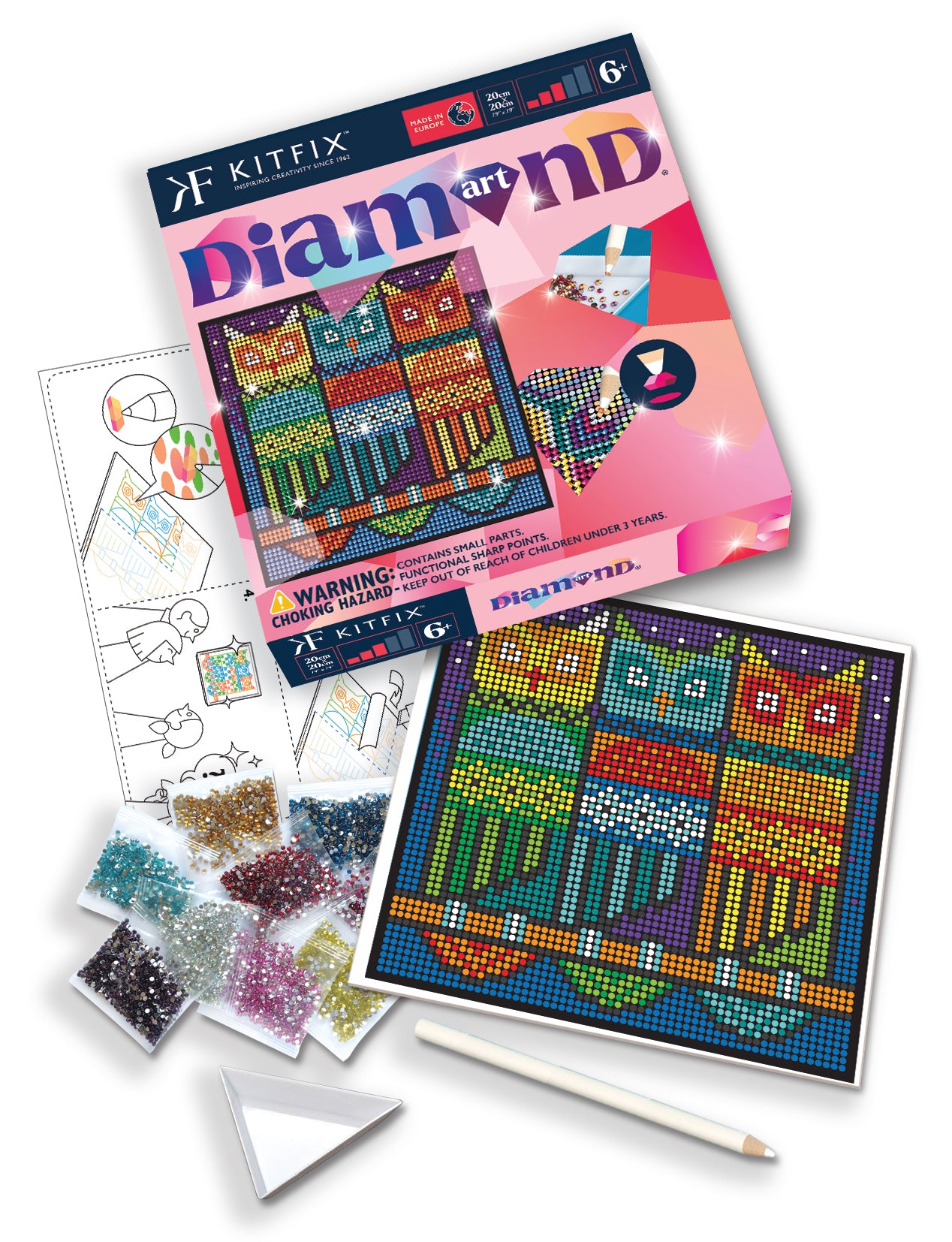 Self-adhesive picture, gems, pencil, pencil sharpener, plastic tray and instructions.