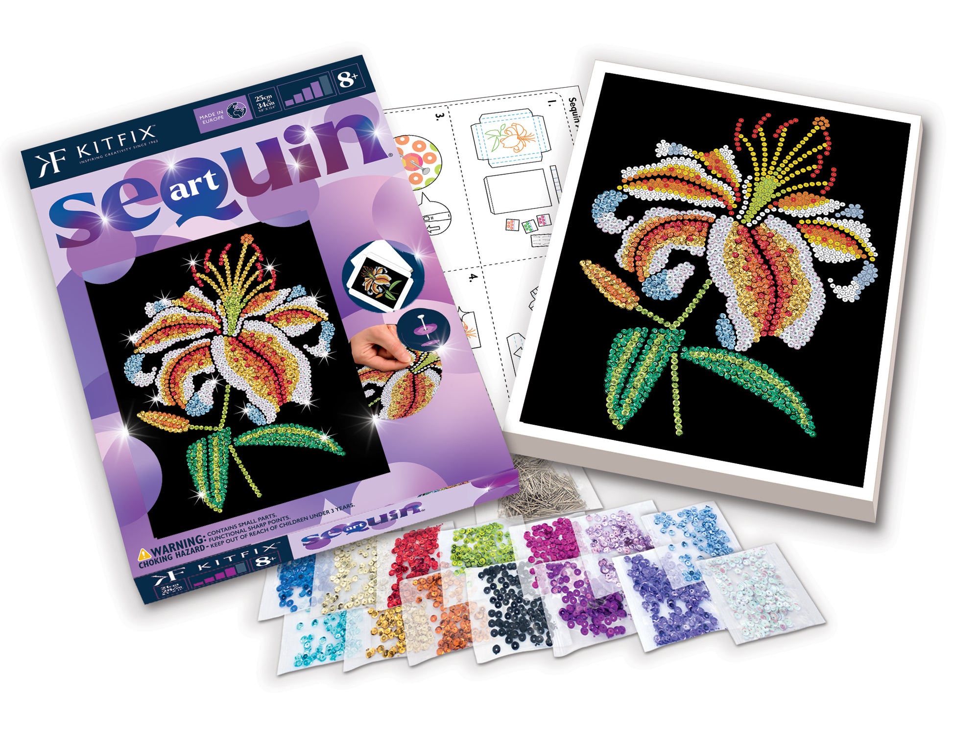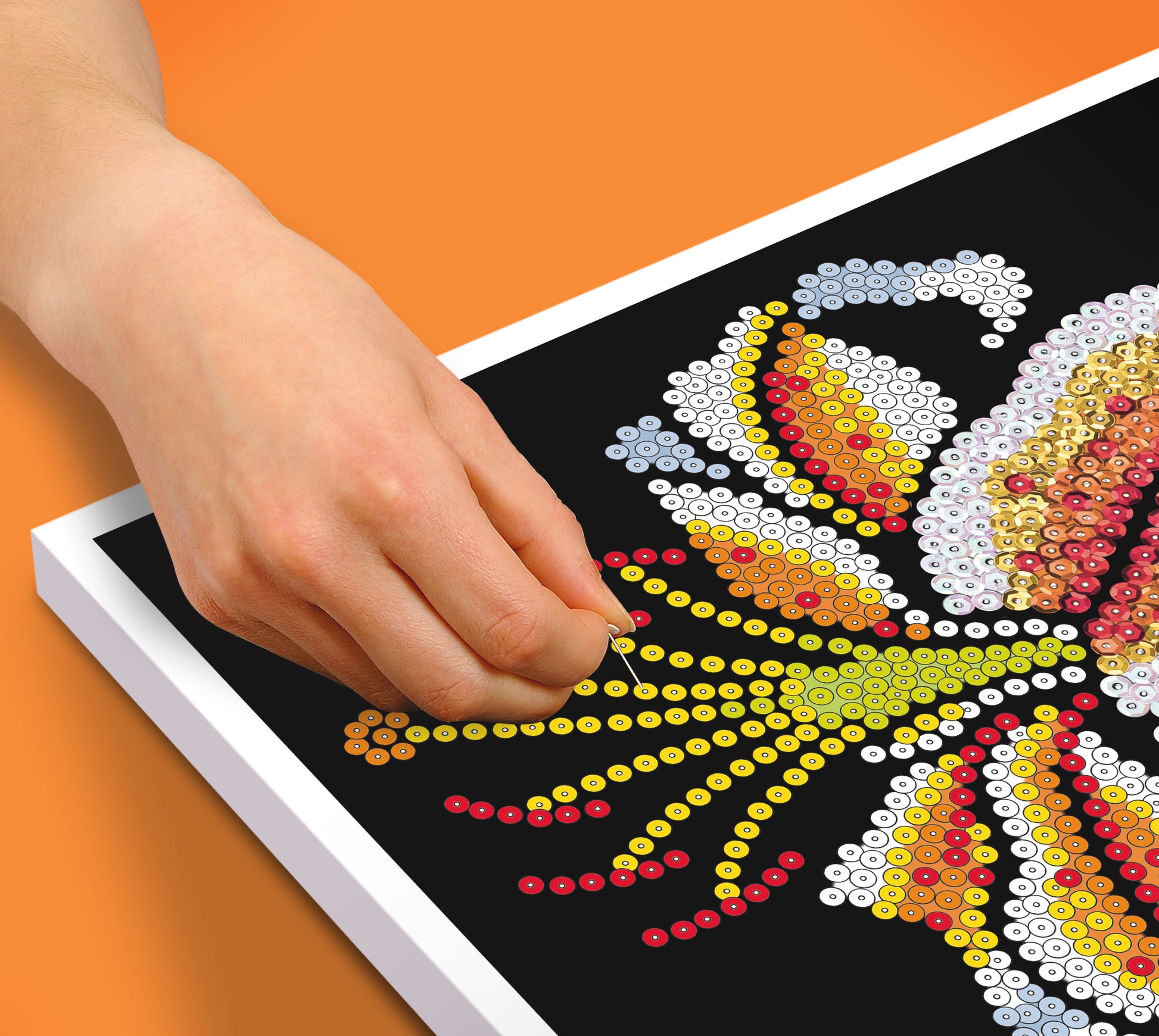 Polystyrene base, coloured wrap around picture, coloured sequins, pins, instructions, adhesive tabs