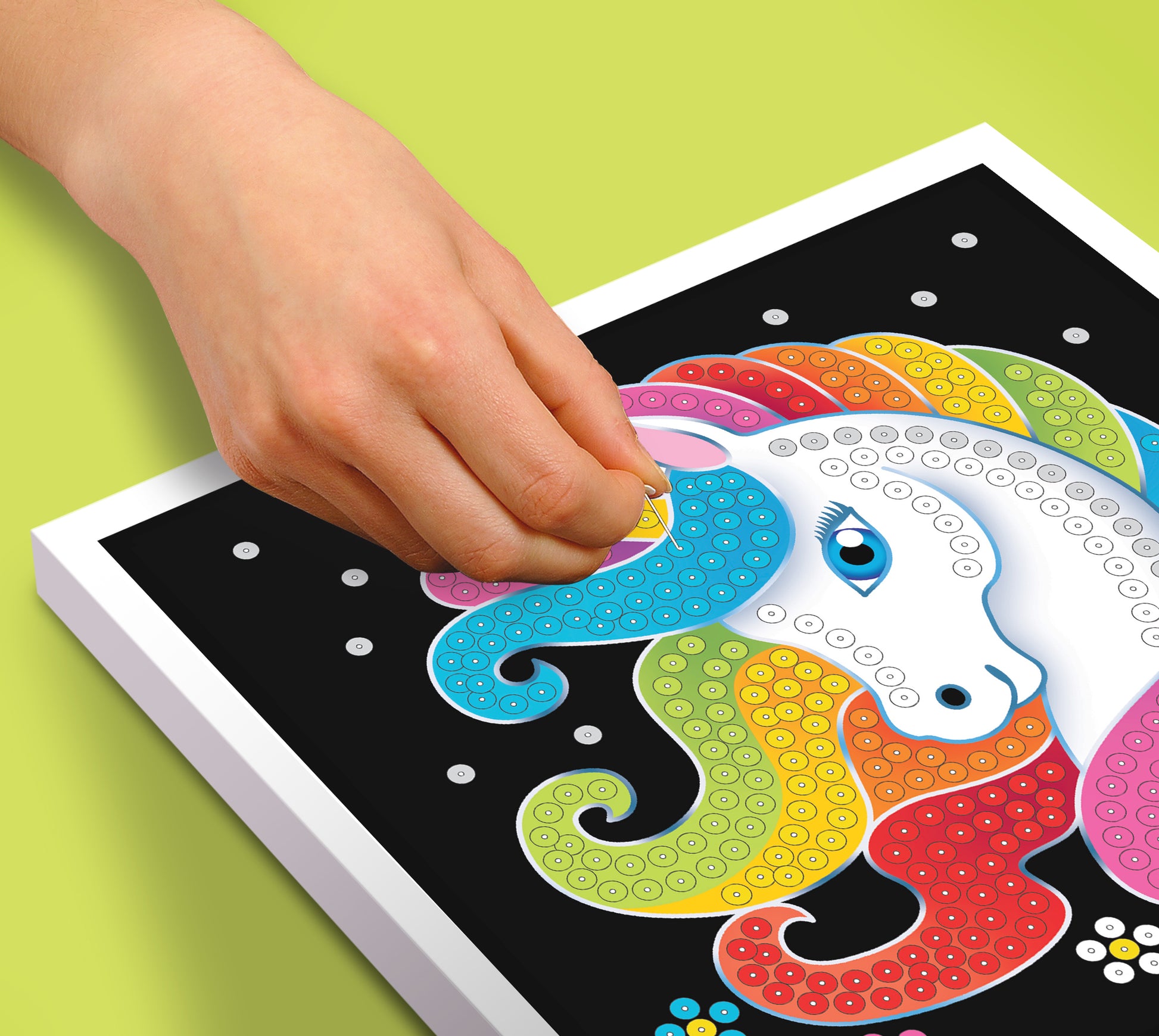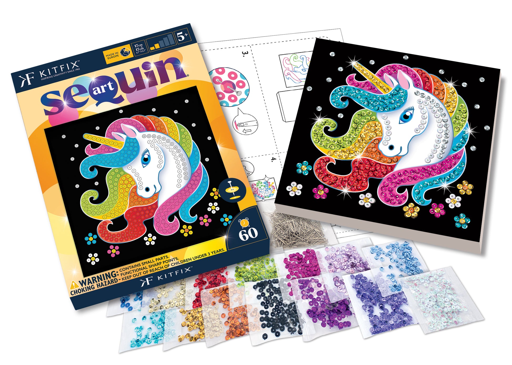 Polystyrene base, coloured picture, coloured sequins, pins, instructions