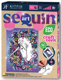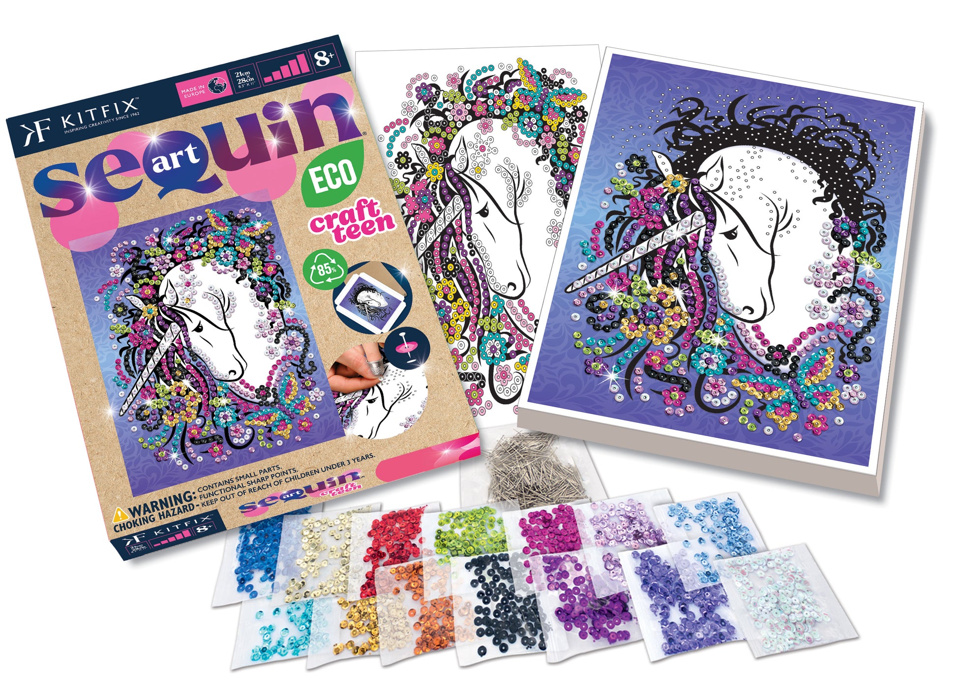 Cardboard tile, coloured wrap around picture, coloured sequins, pins, thimble, instructions, adhesive tabs