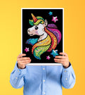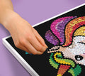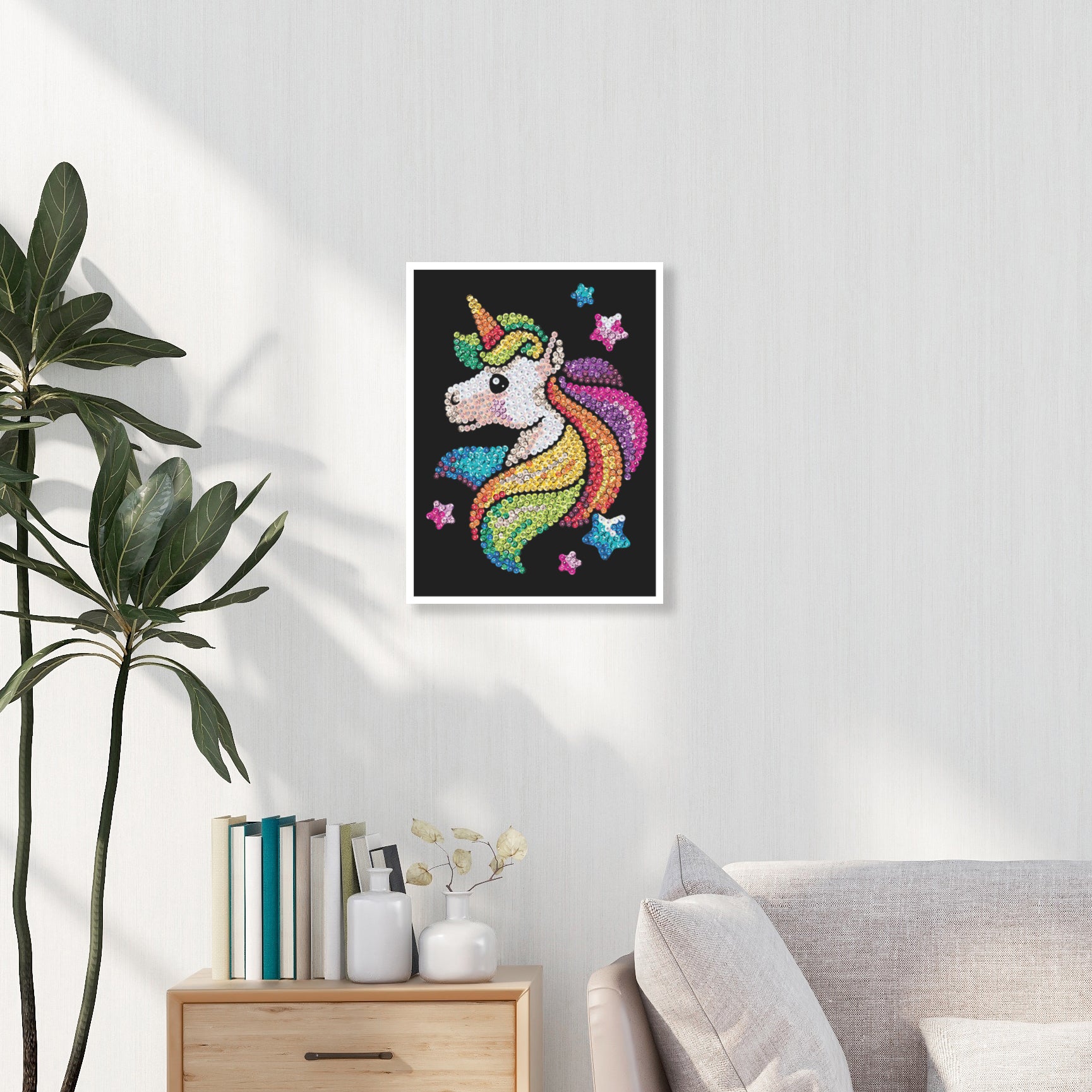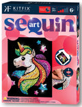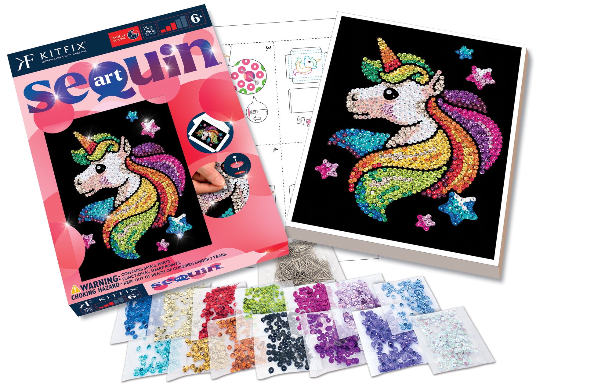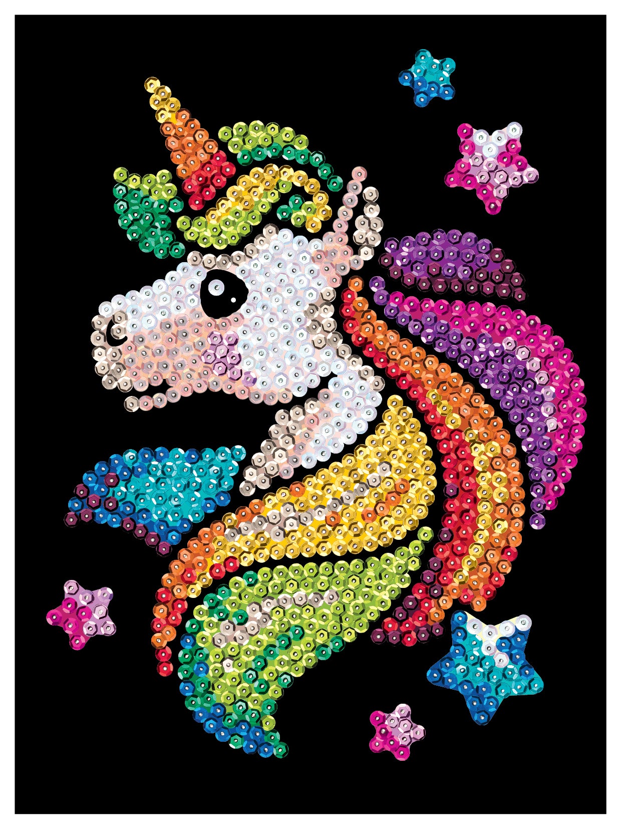 Polystyrene base, coloured wrap around picture, coloured sequins, pins, instructions, adhesive tabs