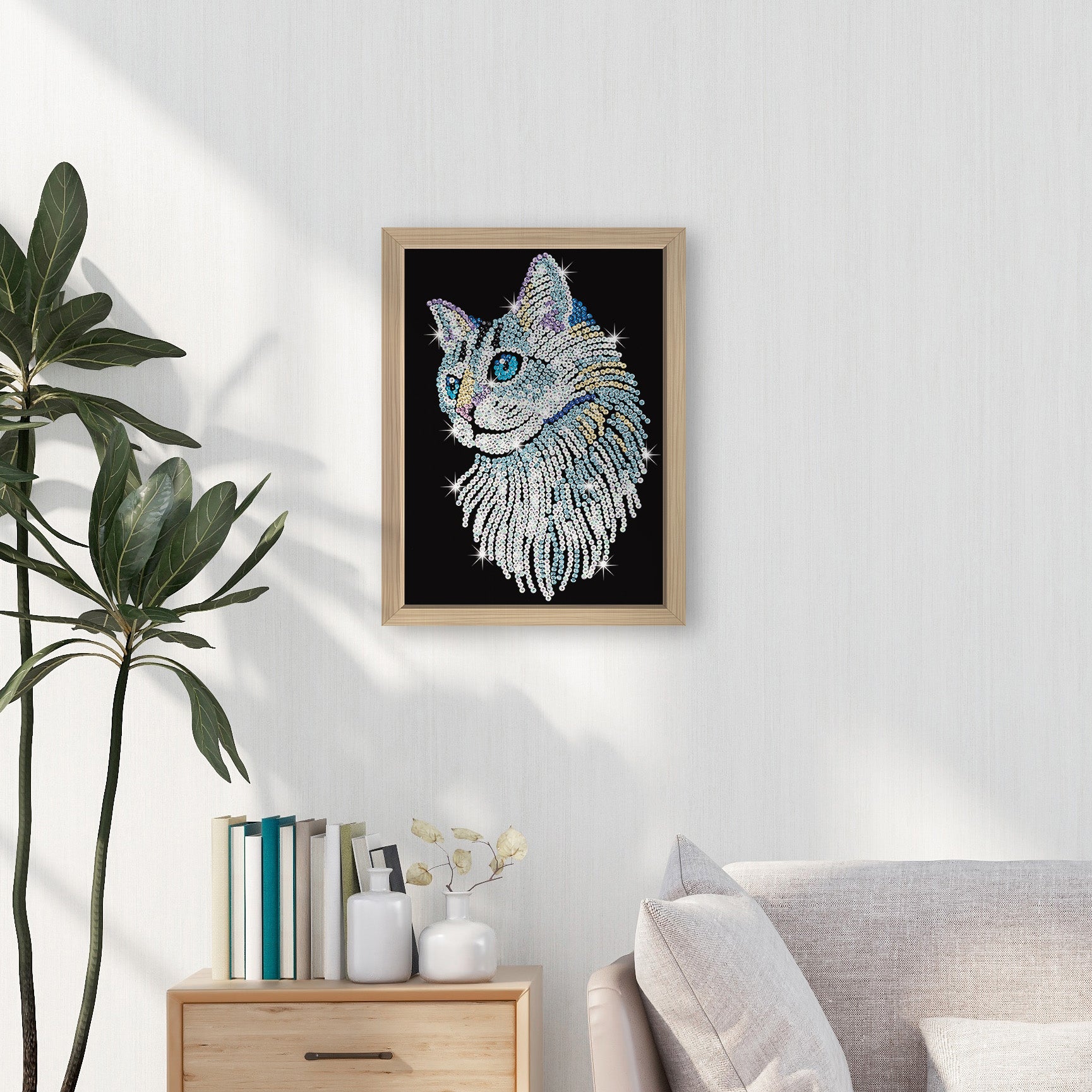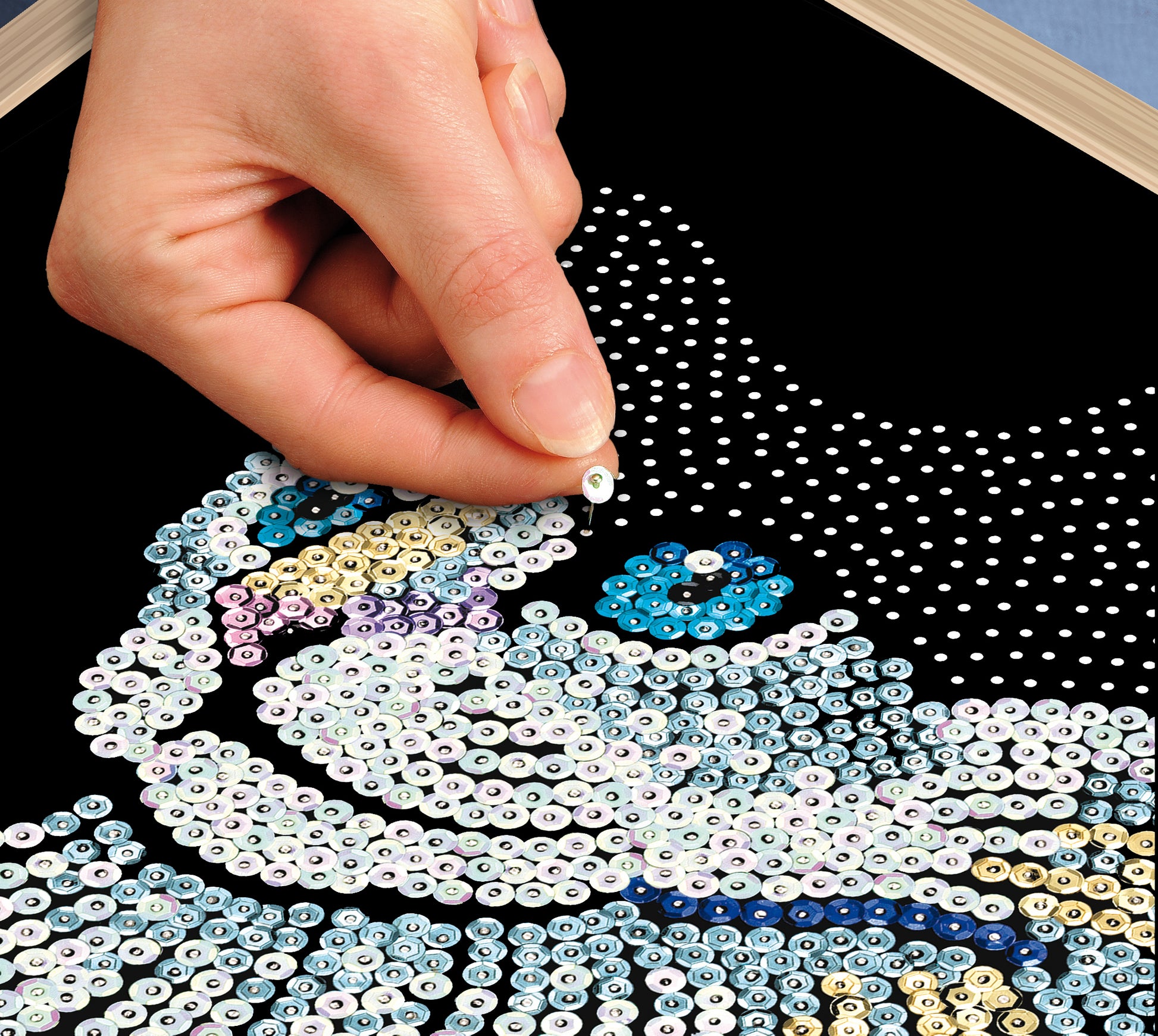 Polystyrene base, flocked picture, coloured sequins, pins, instructions, wooden frame, colour instruction leaflet, adhesive tabs