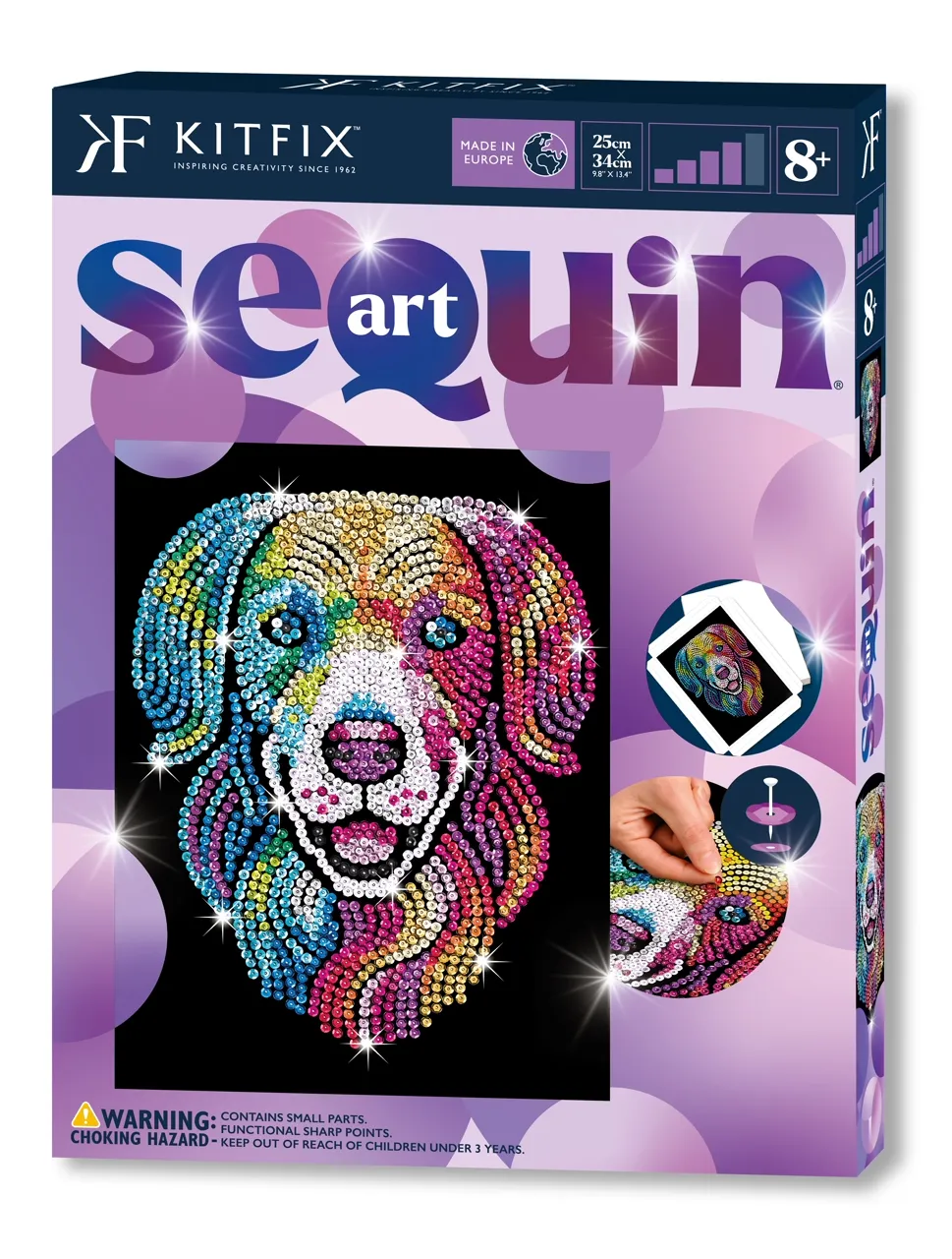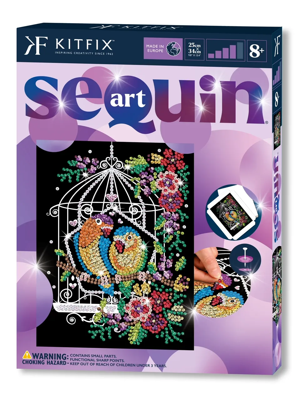 Polystyrene base, coloured wrap around picture, coloured sequins, pins, instructions, adhesive tabs